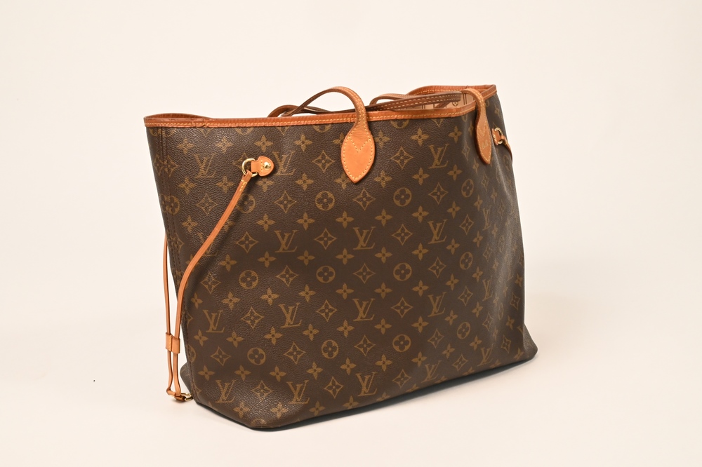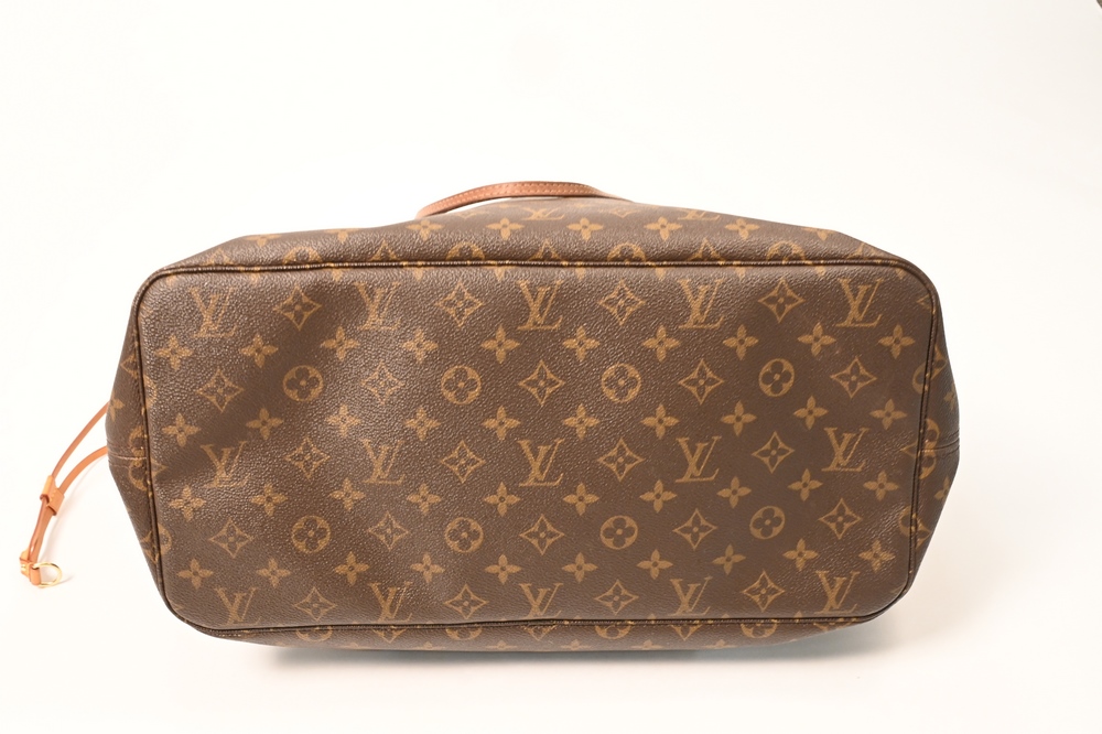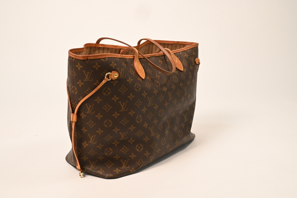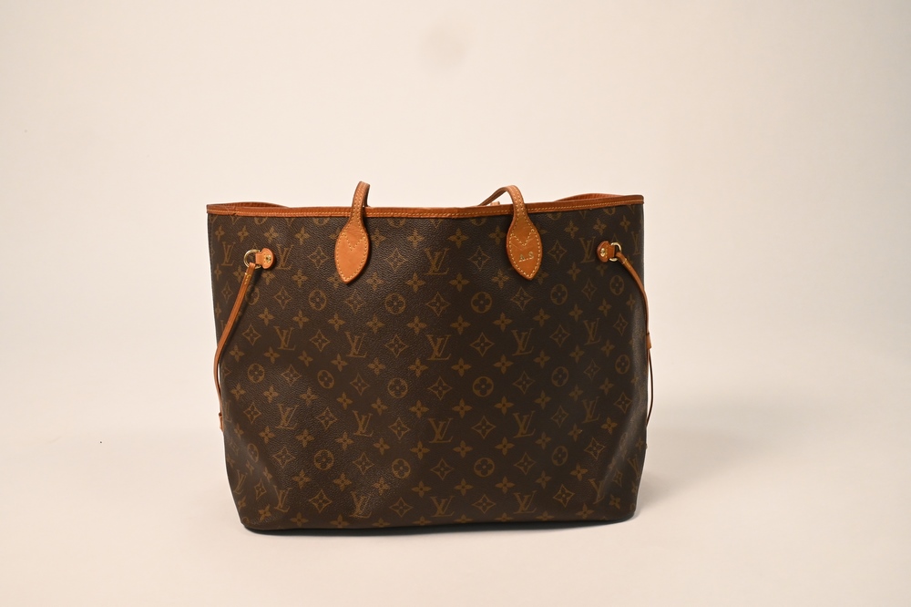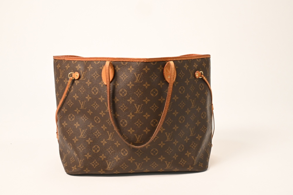 Louis Vuitton Neverfull Bag, monogram canvas and leather shoulder tote bag, height 13 inches, width 16 inches, depth 8 inches.