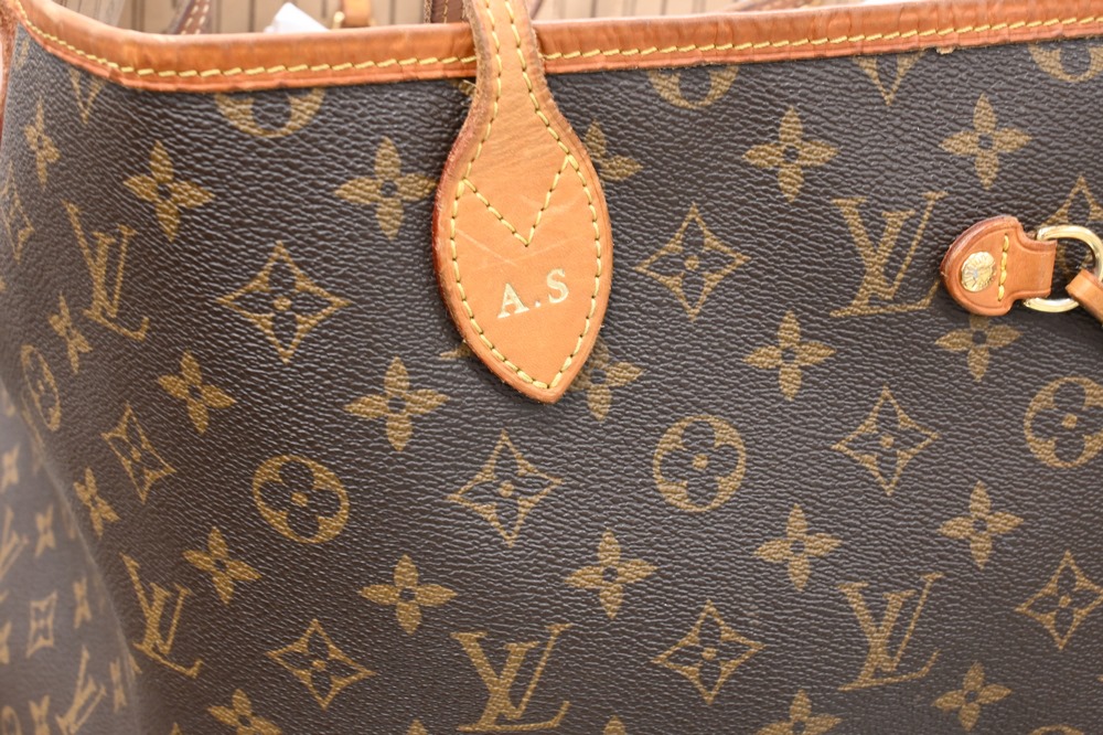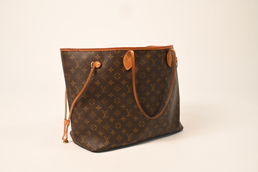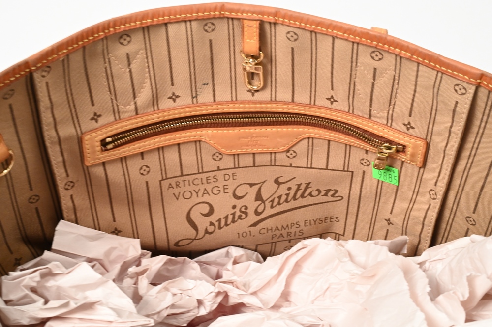 Lot 217A: Louis Vuitton Neverfull Bag, monogram canvas and leather shoulder tote bag, height 13 inches, width 16 inches, depth 8 inches.
