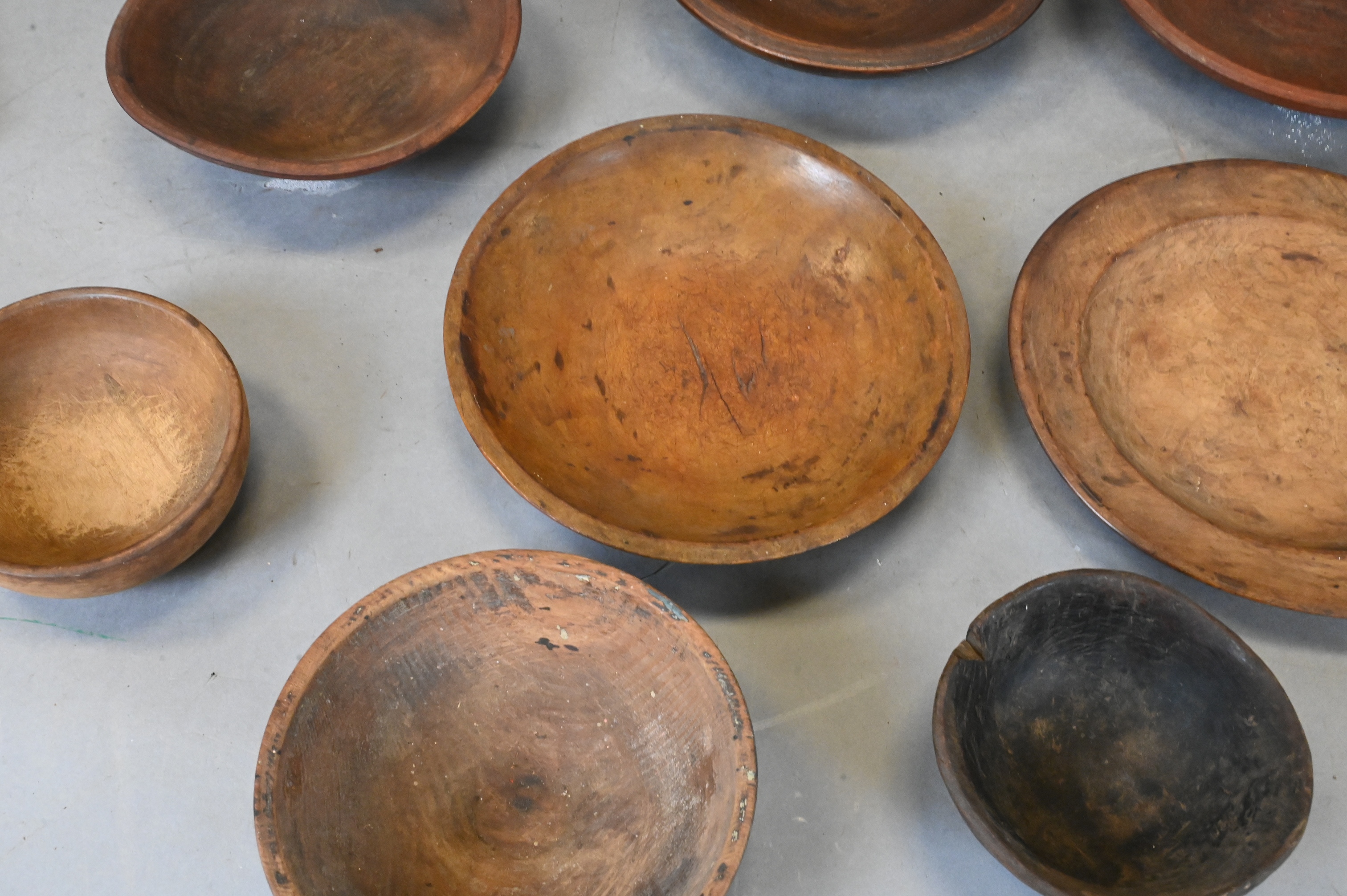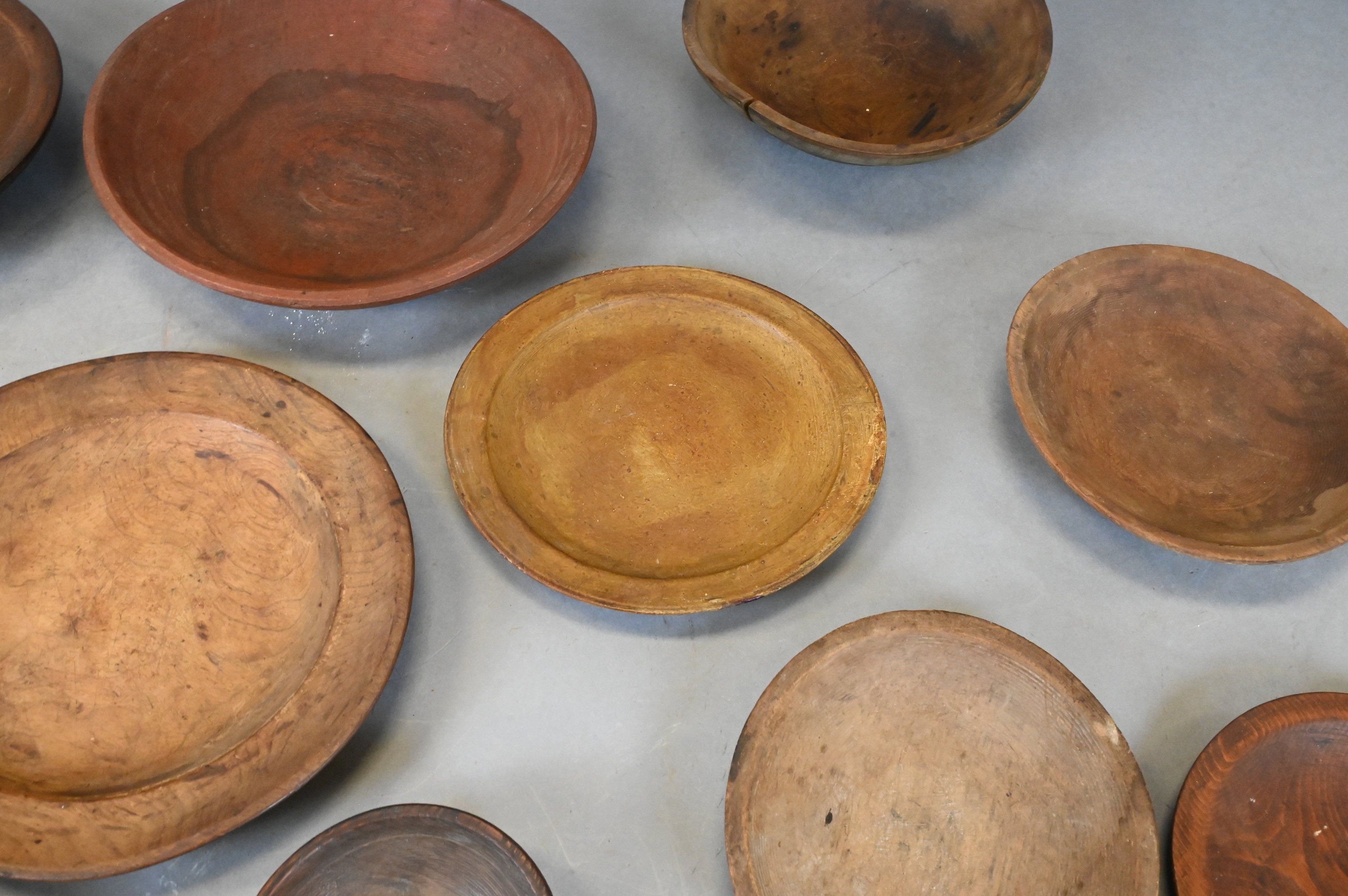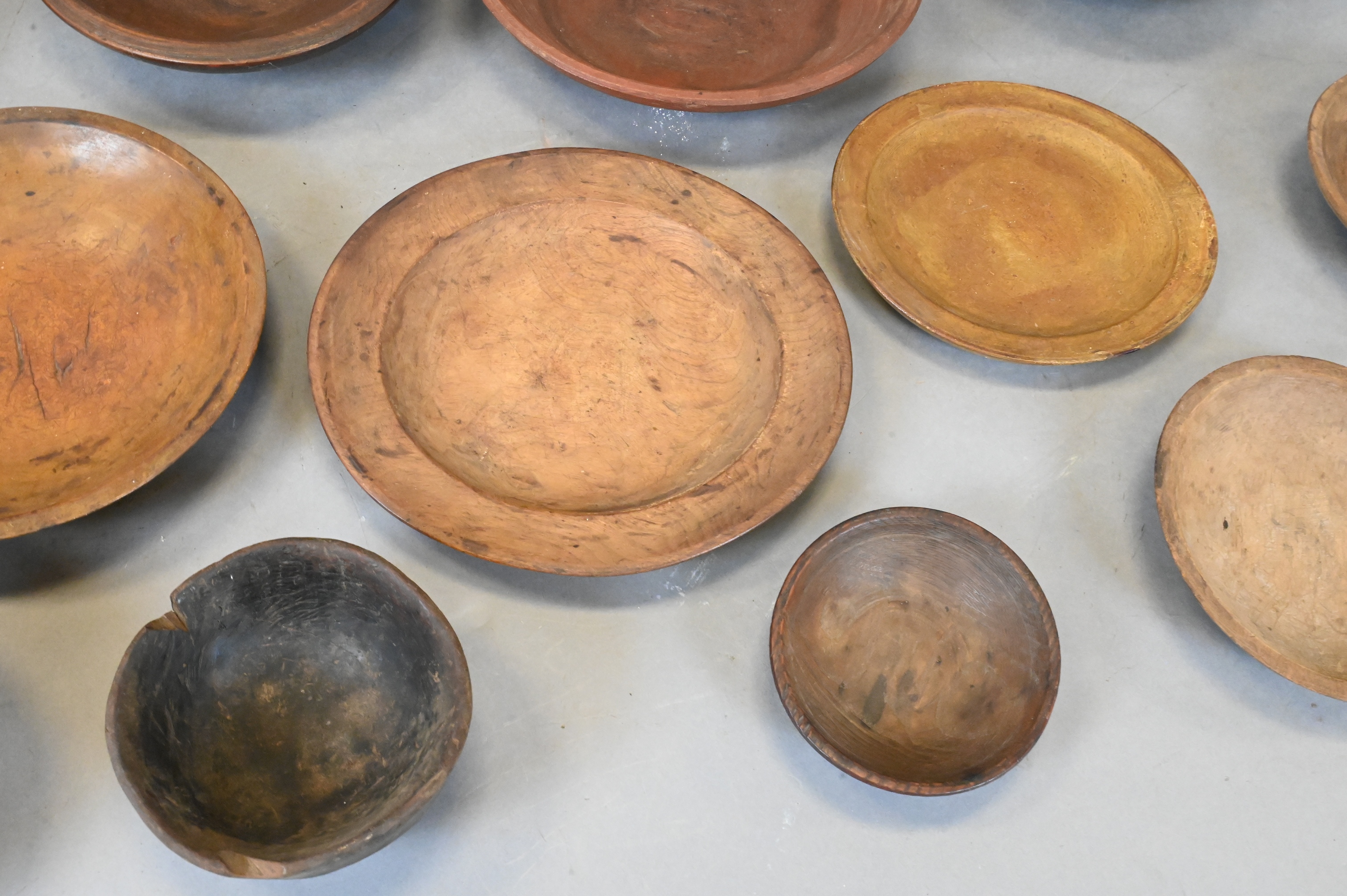 A collection of hand-turned wooden bowls and plates in assorted sizes, with original worn surfaces and good patina. Diameters from 5 inches to 10 1/2 inches.