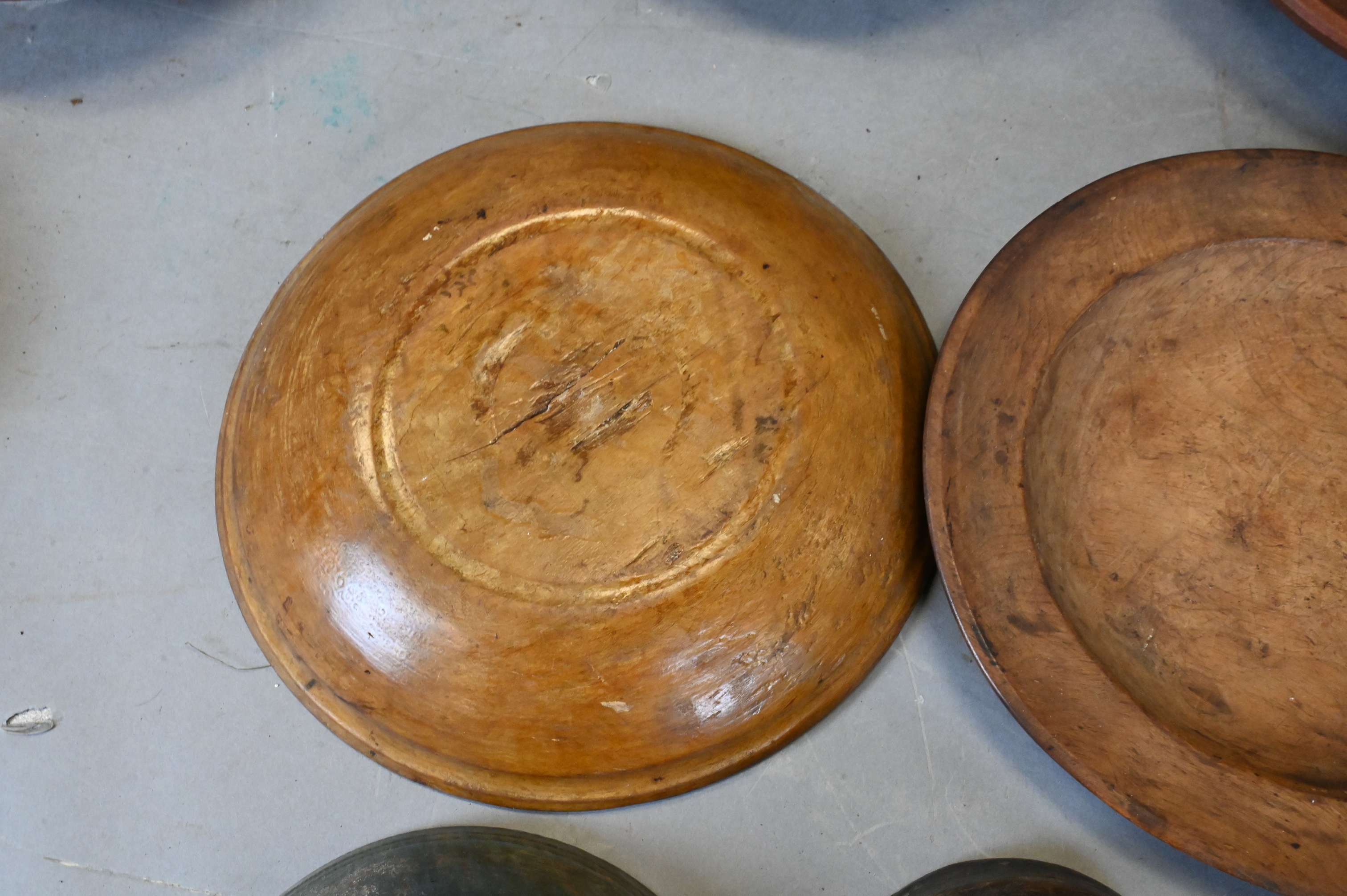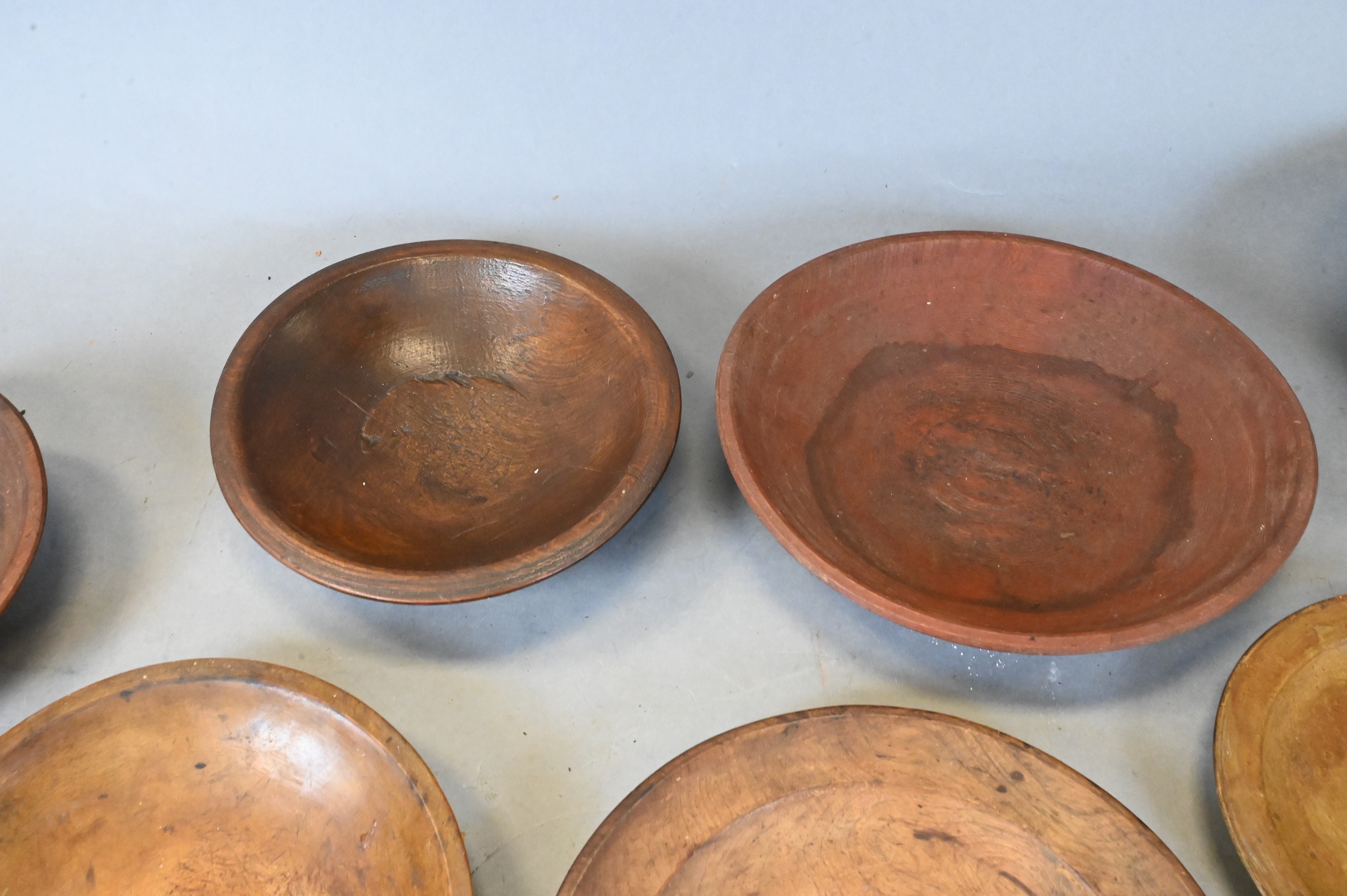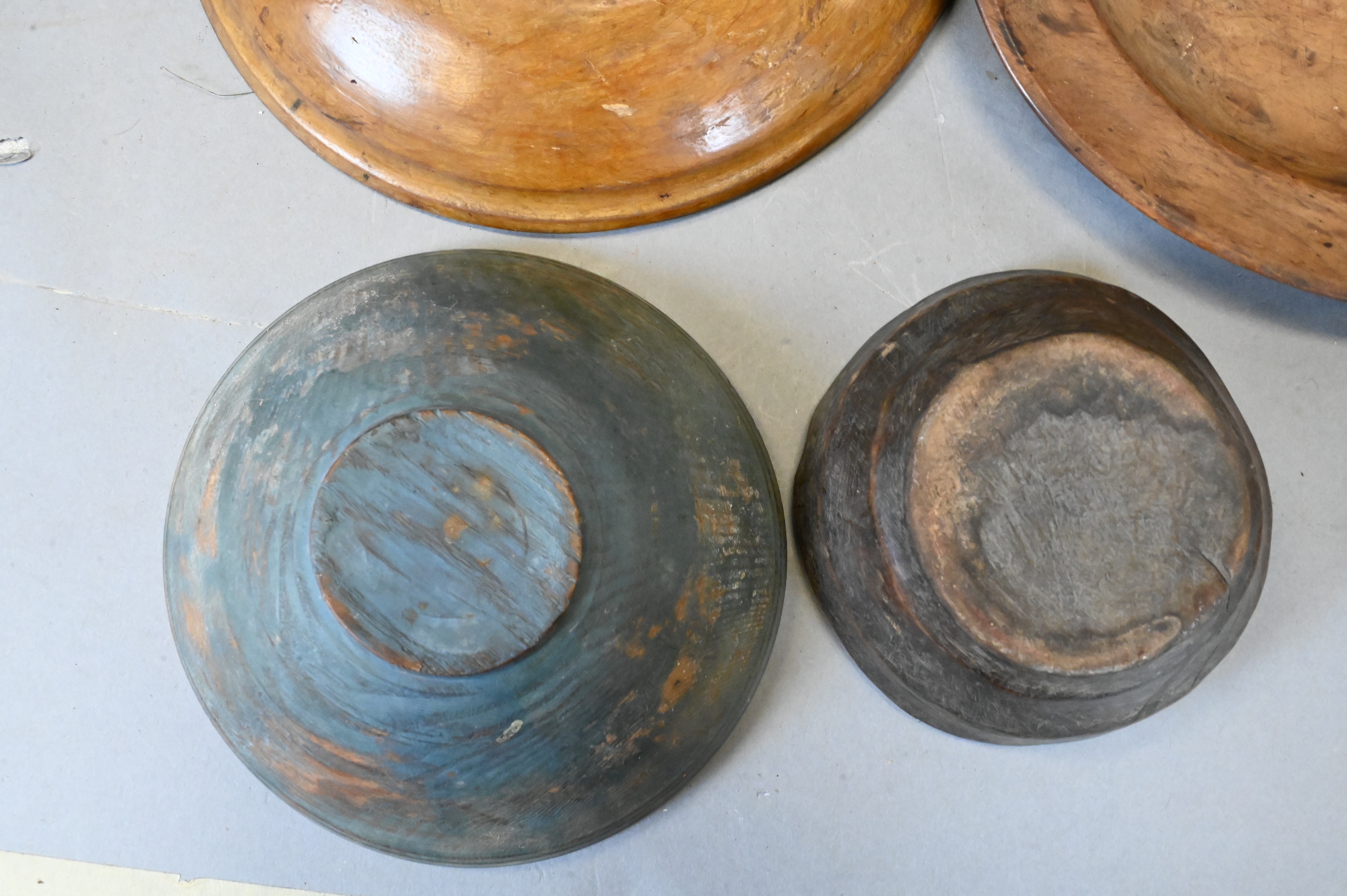 A collection of hand-turned wooden bowls and plates in assorted sizes, with original worn surfaces and good patina. Diameters from 5 inches to 10 1/2 inches.