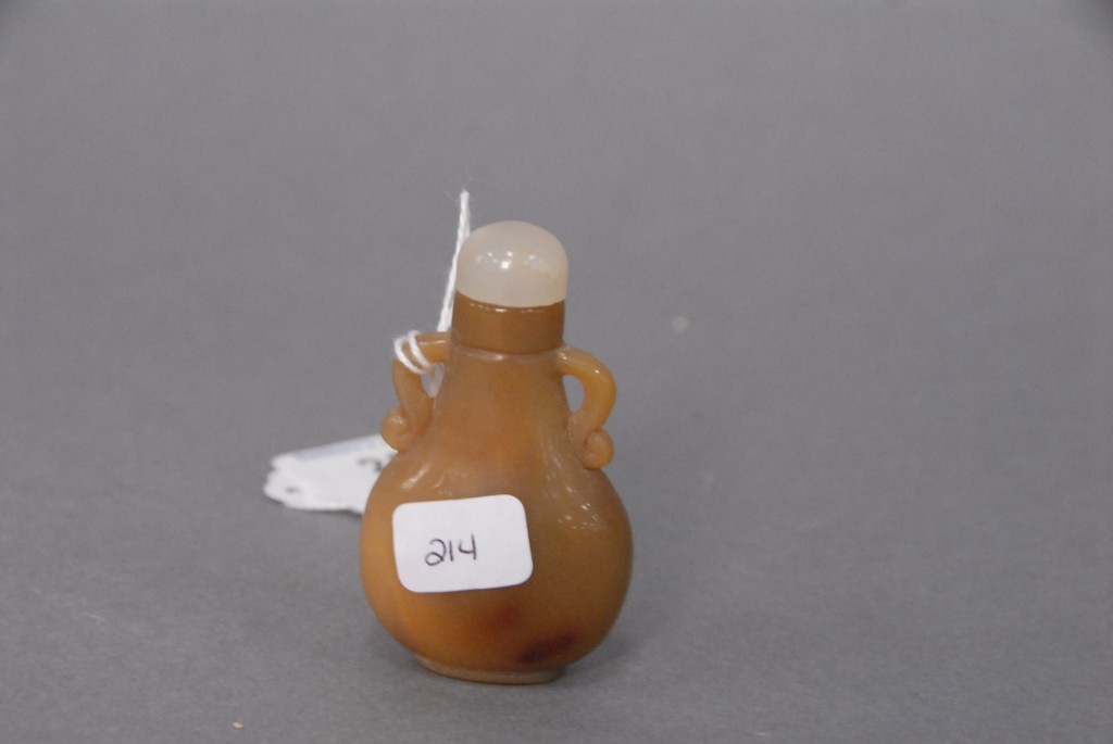 Agate pilgrim’s snuff bottle, having carved handles on each side and agate top, ht 2 1/2.