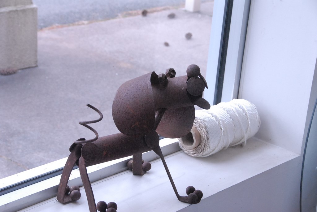 Eight piece lot of iron sculptures iron sculpture, three cats, turtle, two dogs, Christmas tree and metal snowman.