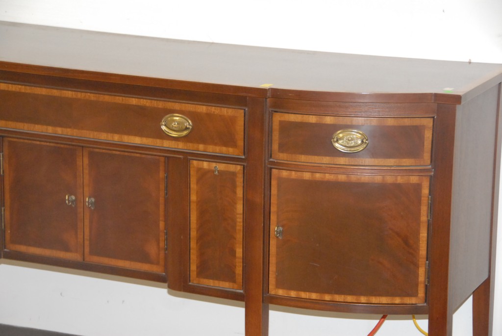 Lot 218: Ethan Allen banded inlaid Federal style sideboard with bottle drawers, ht. 38 1/2, lg. 70, dp. 21.