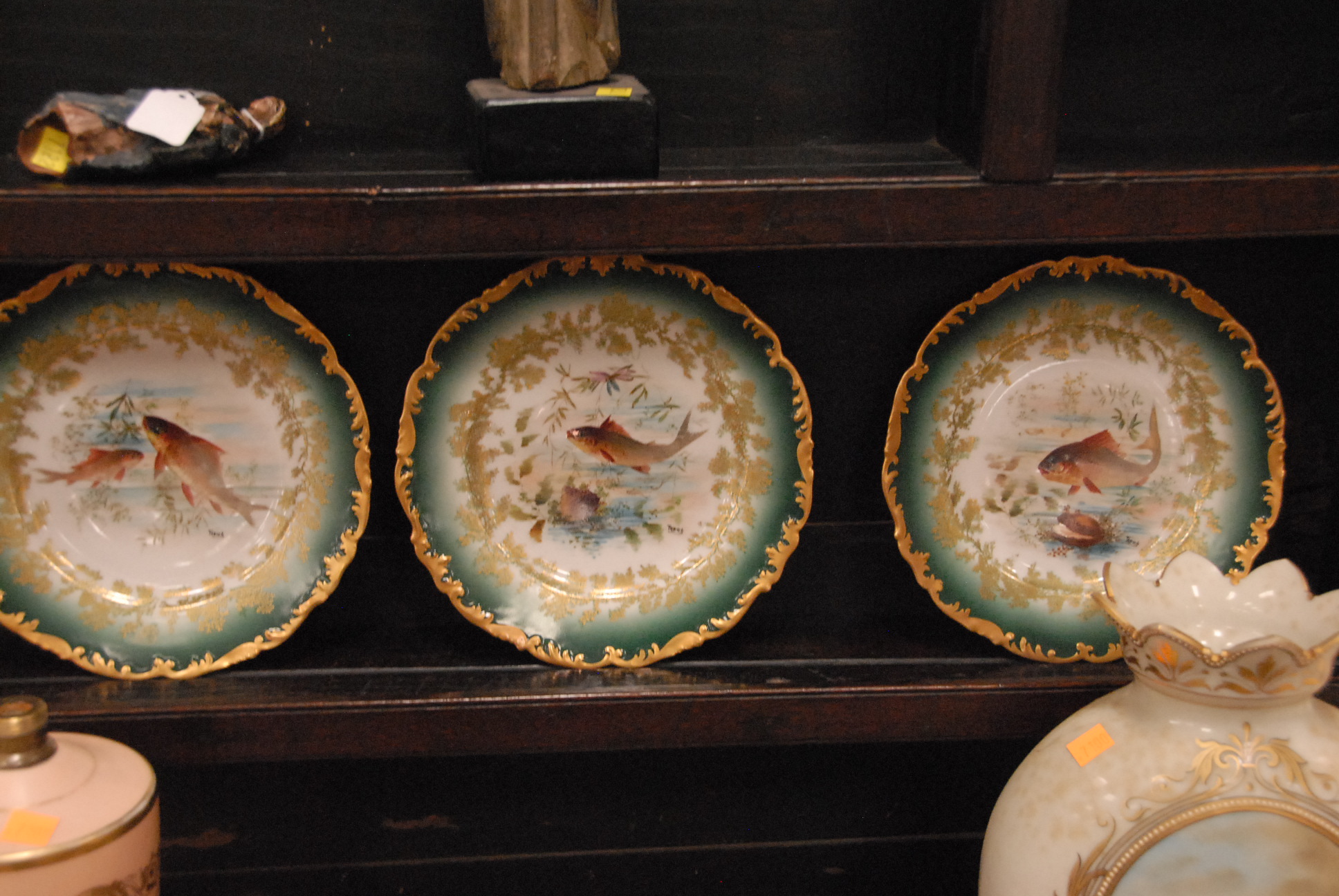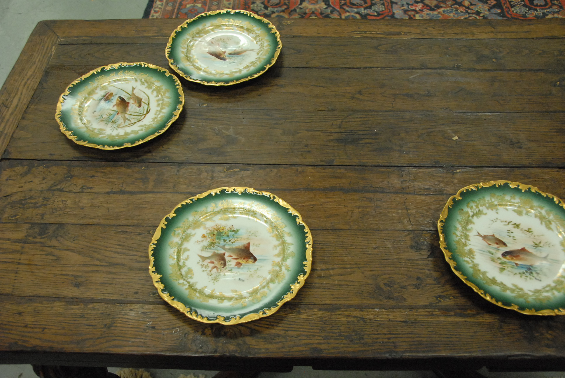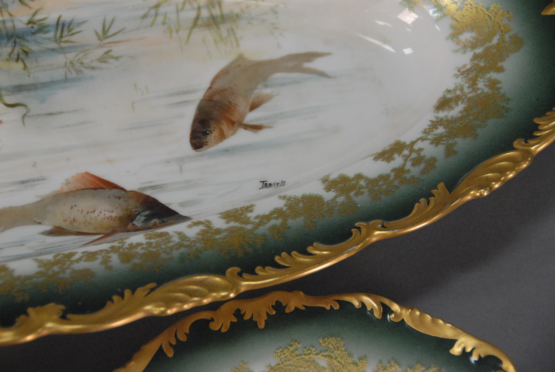 Lot 218: Fifteen piece Limoges fish set with hand painted various fish and gold borders, artist signed Treick, including twelve plates, large platter, gravy boat, and underplate. tray lg. 24in.