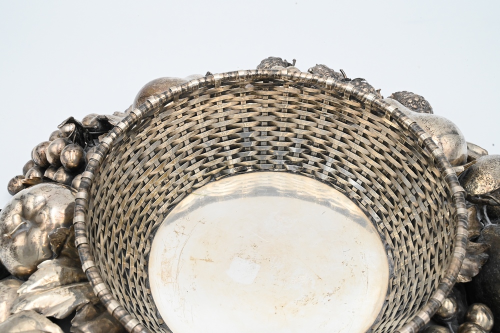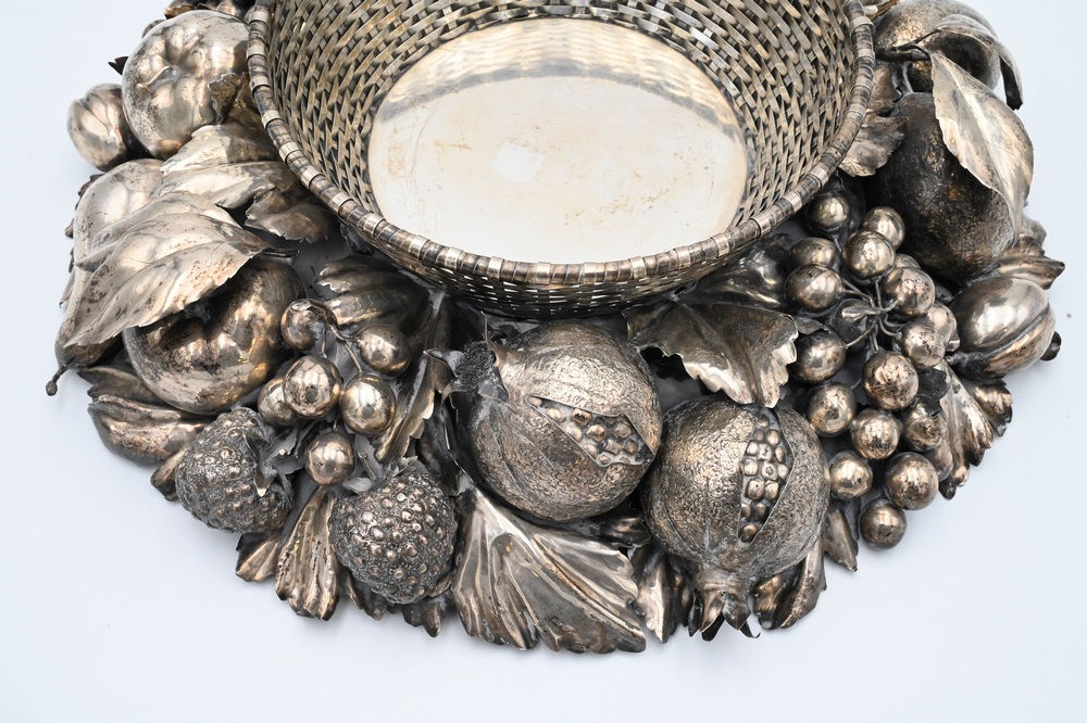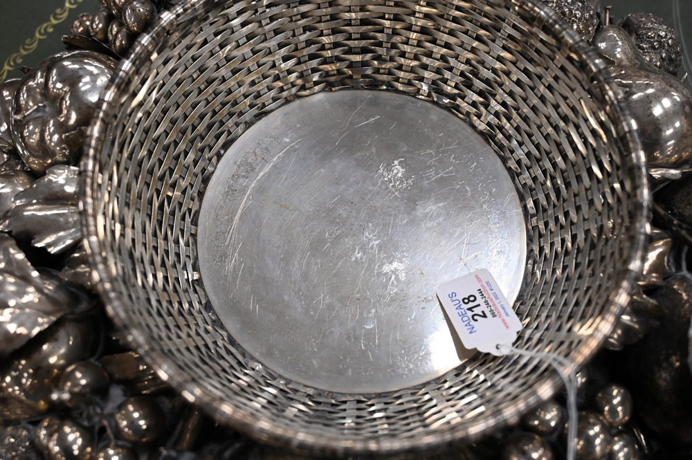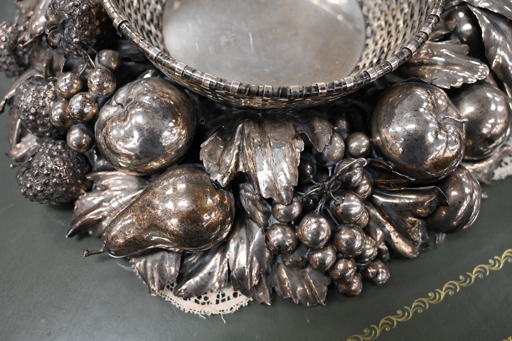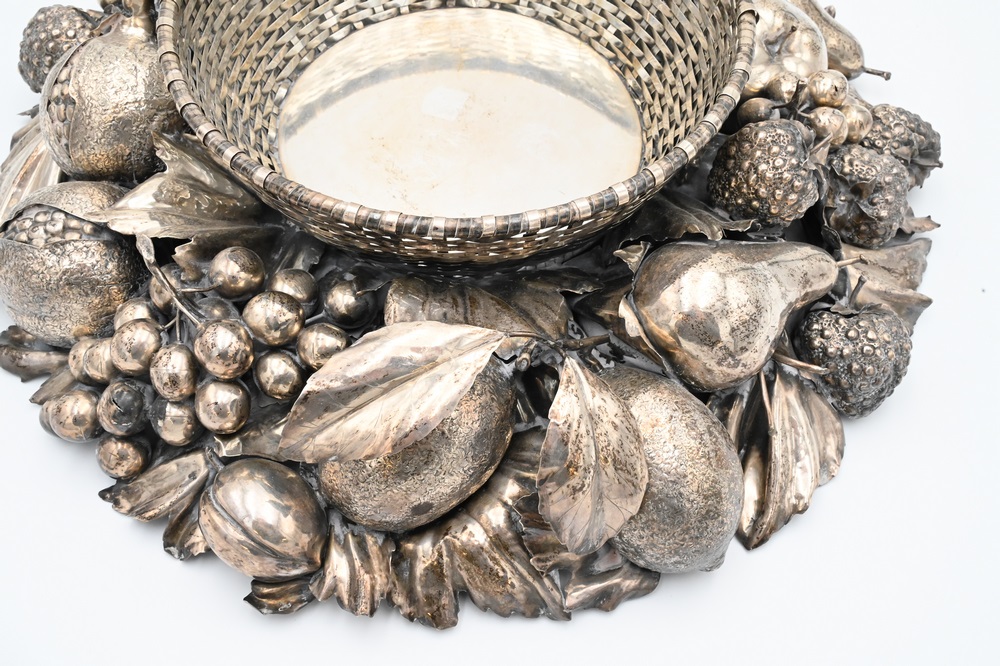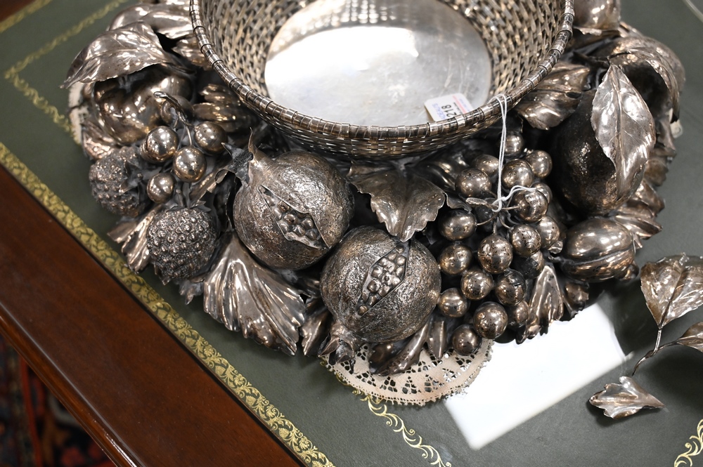 Lot 218: Gianmaria Buccellati Silver Center Bowl, having formed woven circular basket inset within a wreath of various leaf stemmed fruits to…