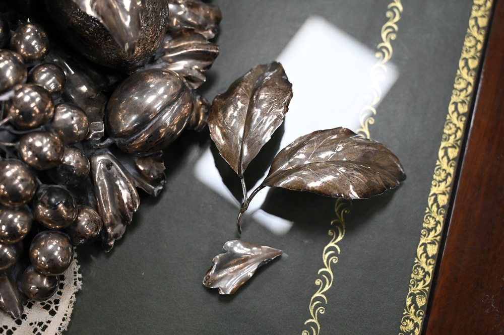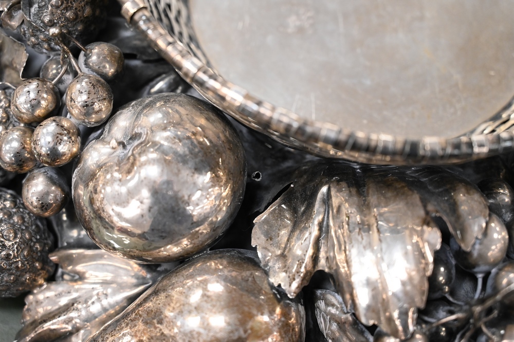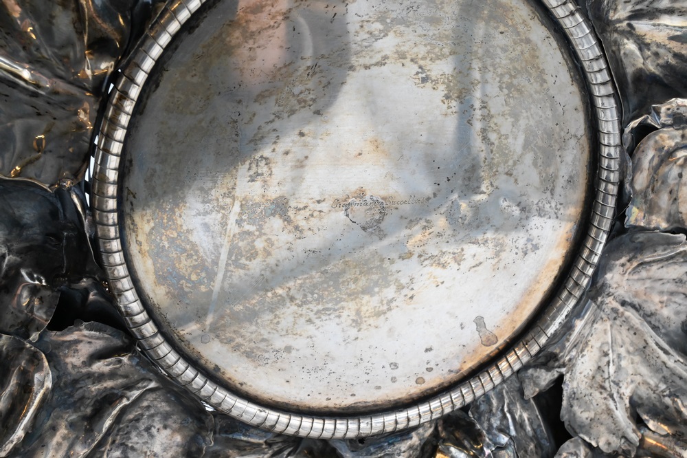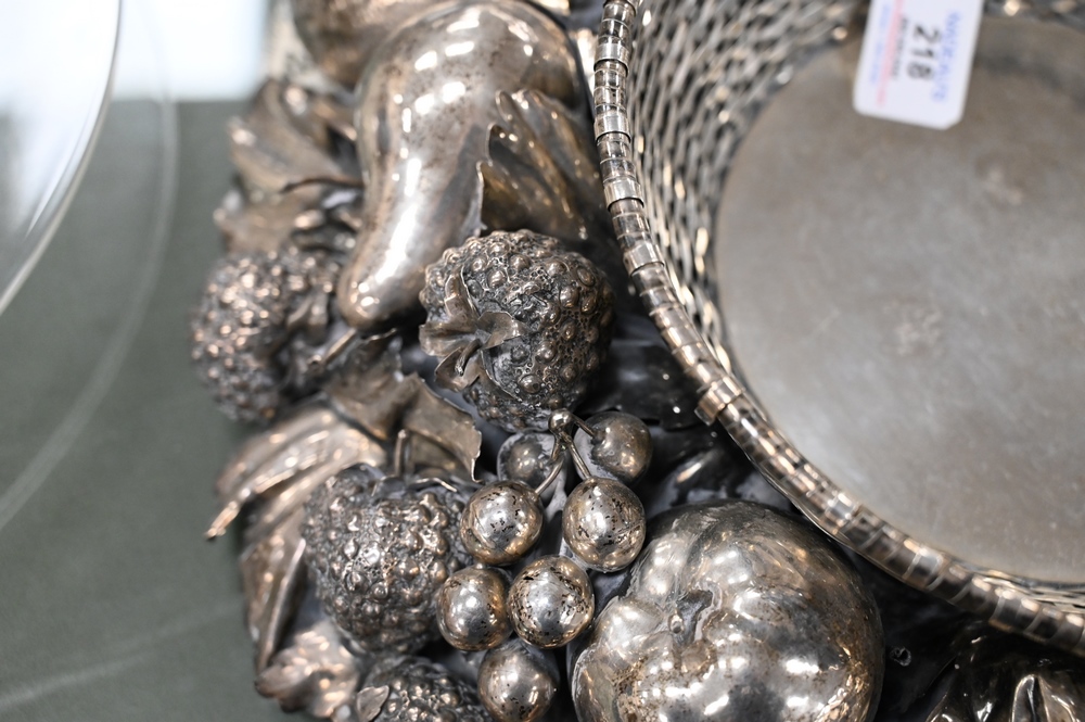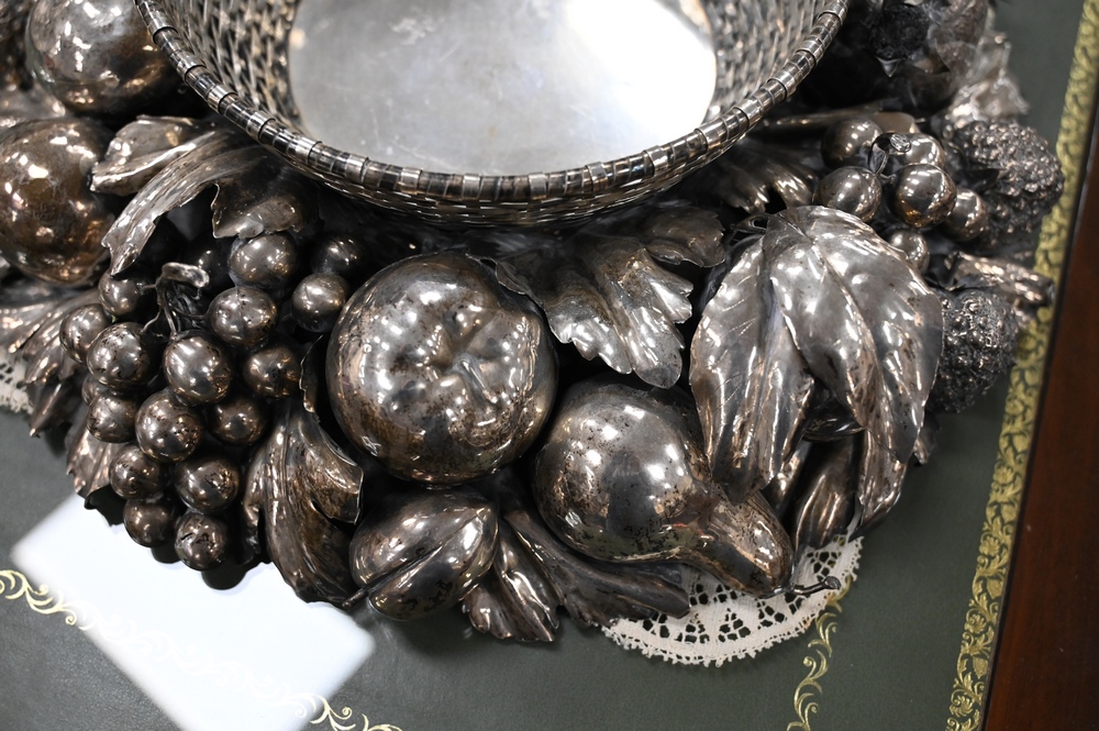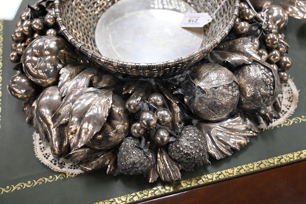 Lot 218: Gianmaria Buccellati Silver Center Bowl, having formed woven circular basket inset within a wreath of various leaf stemmed fruits to…