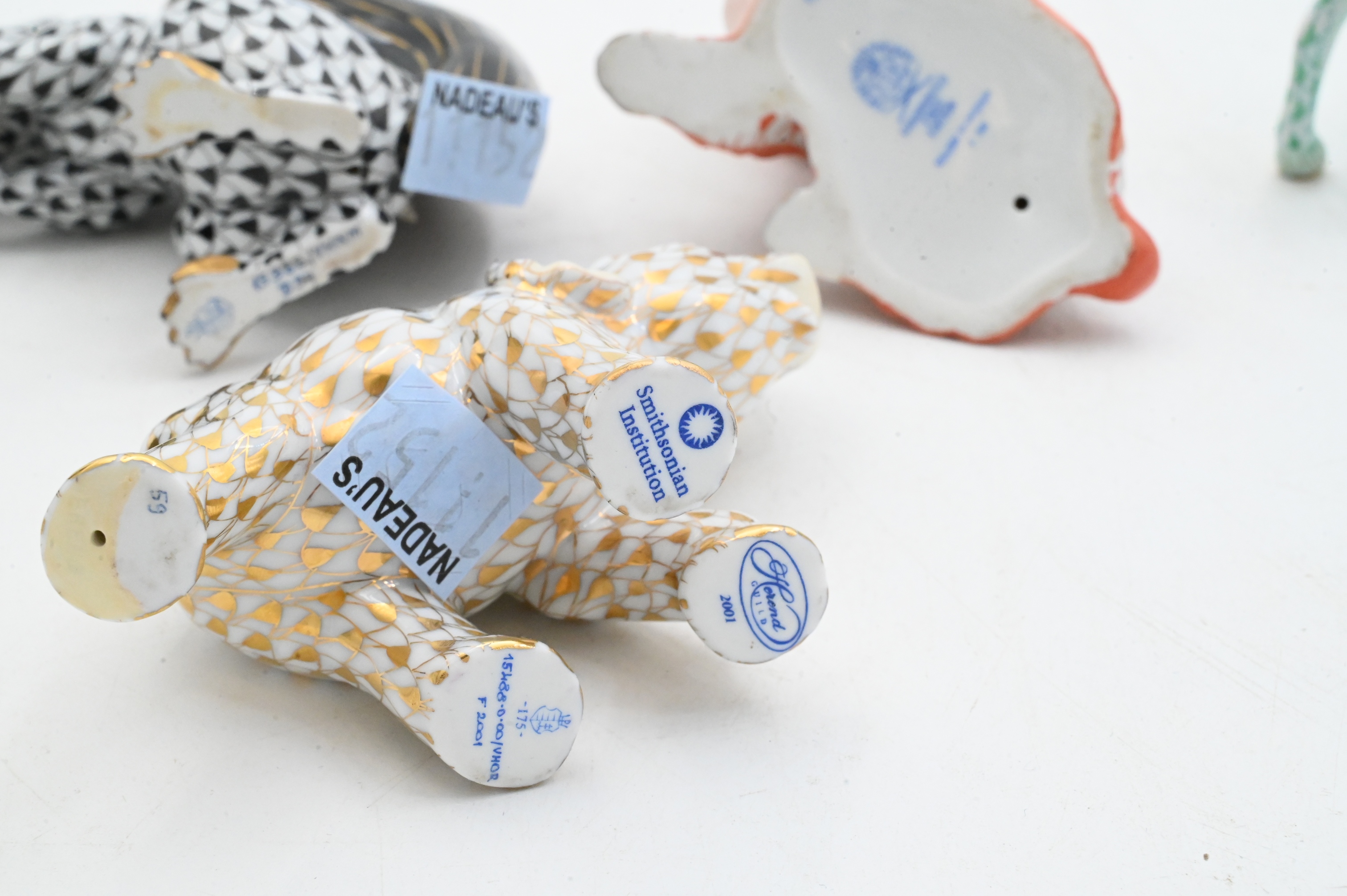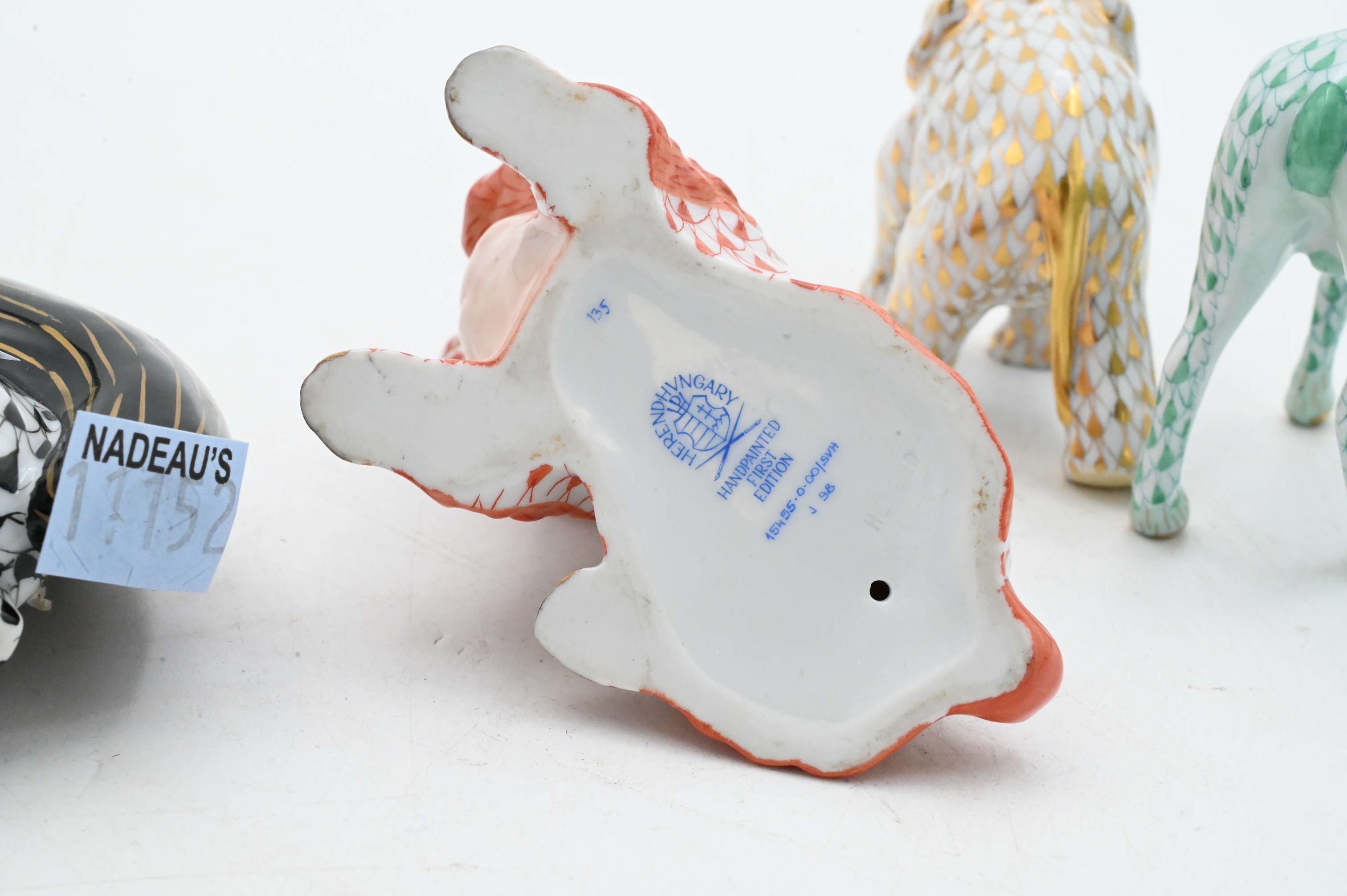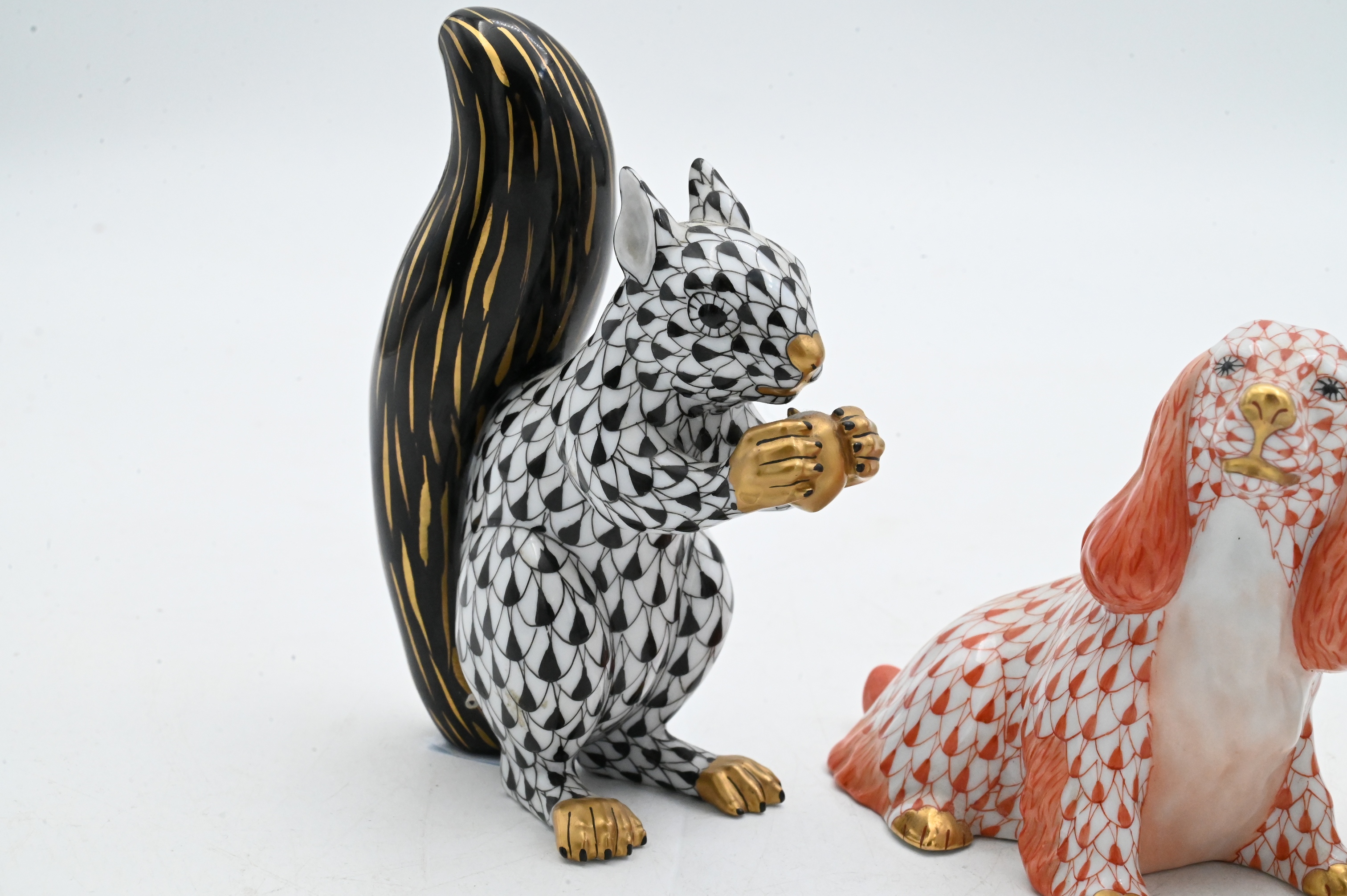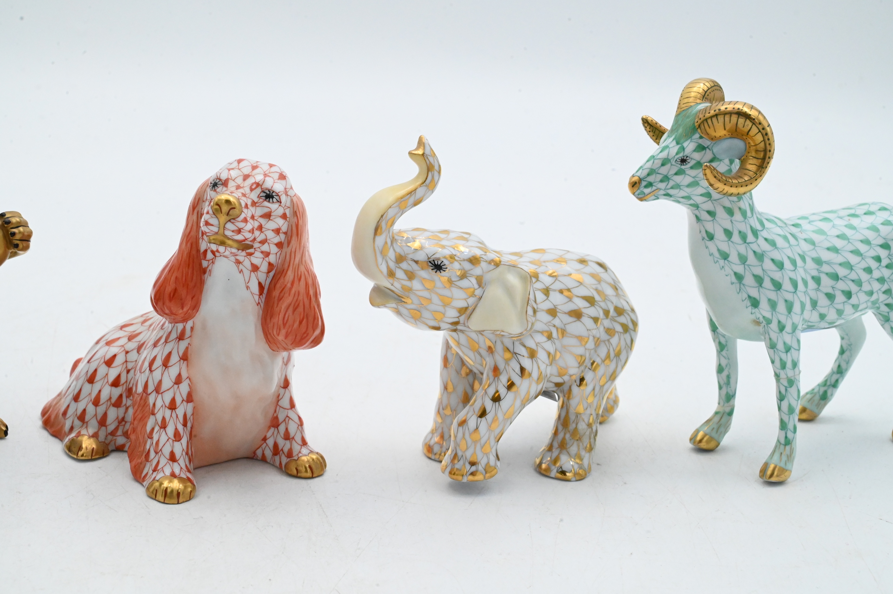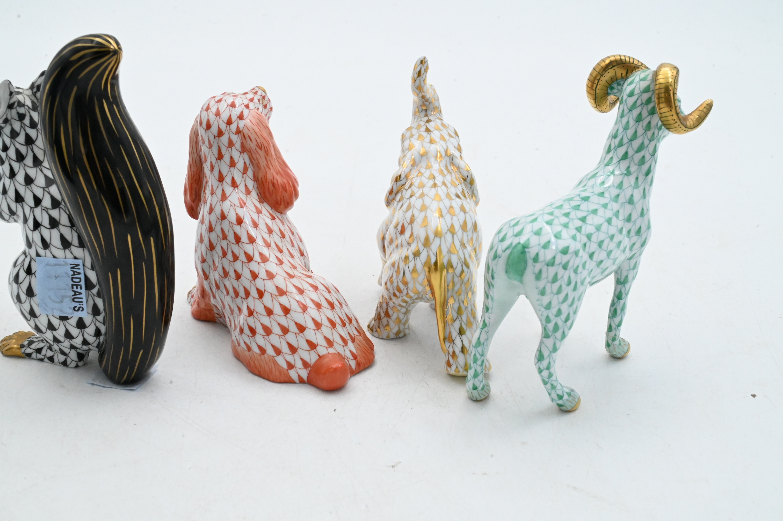Including an elephant in gold fishnet dated 2001, a spaniel in rust fishnet marked First Edition, a squirrel in black fishnet, and a ram in green fishnet, each with gilt accents and marked Herend Hungary Handpainted.