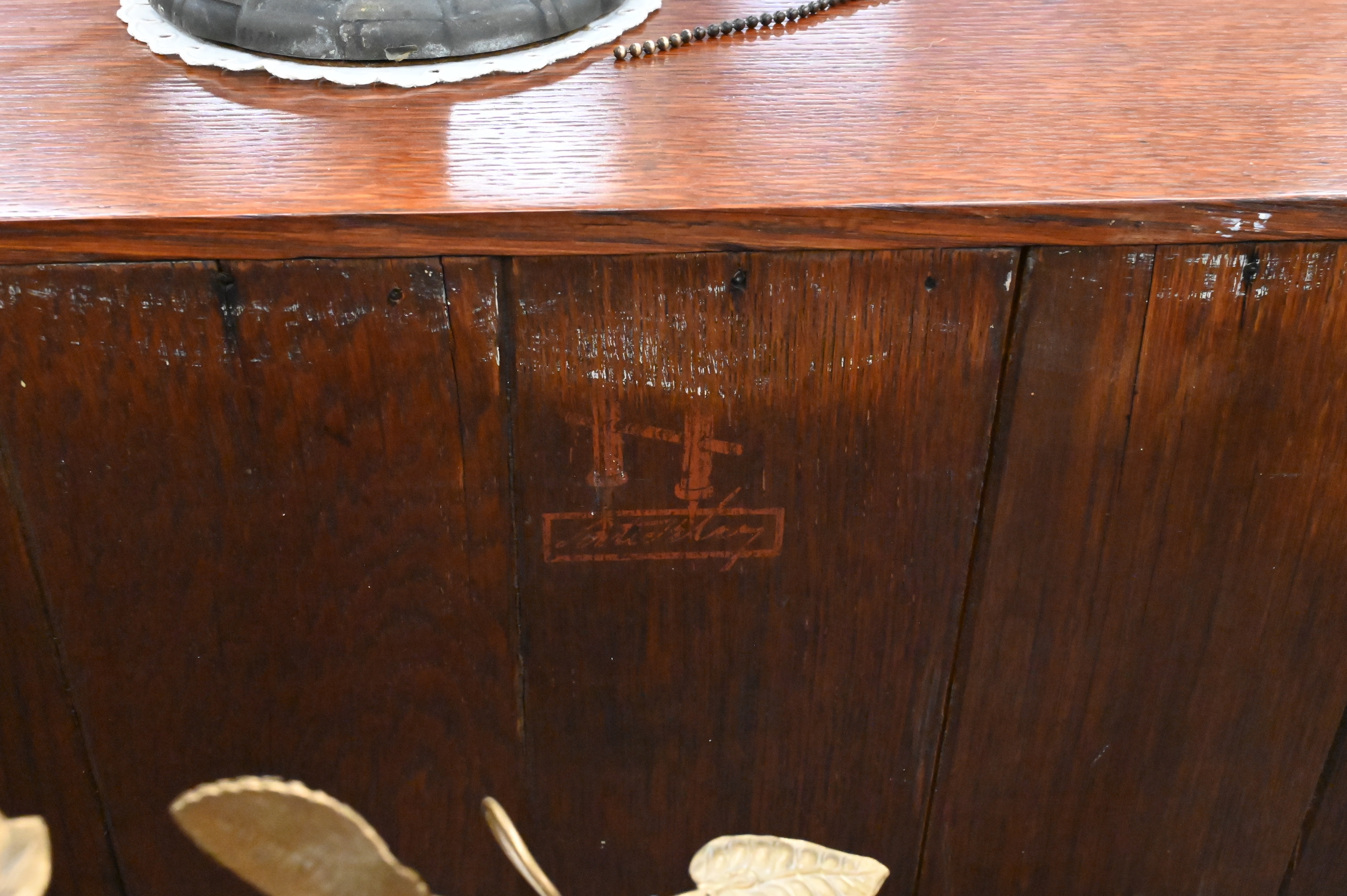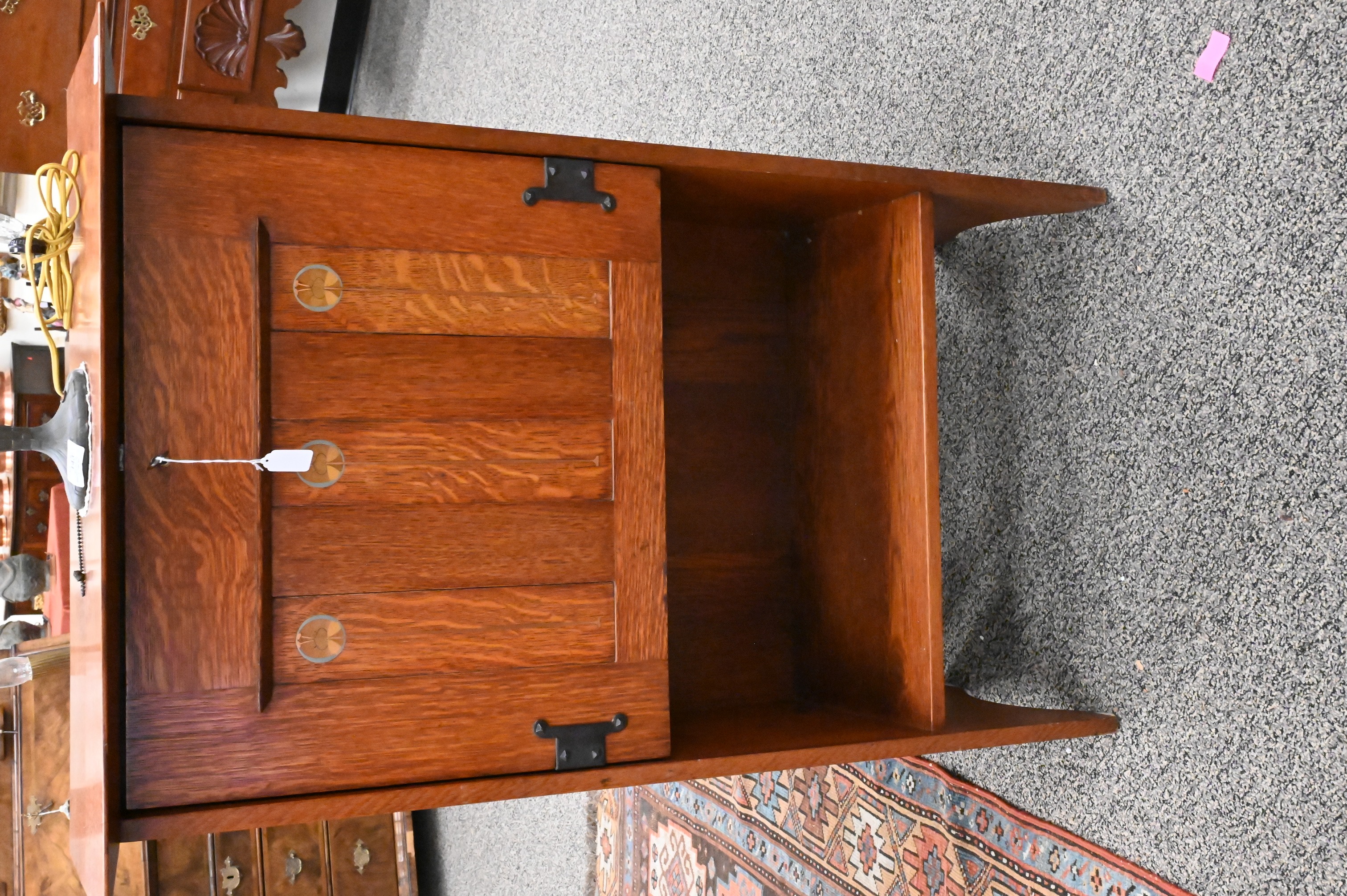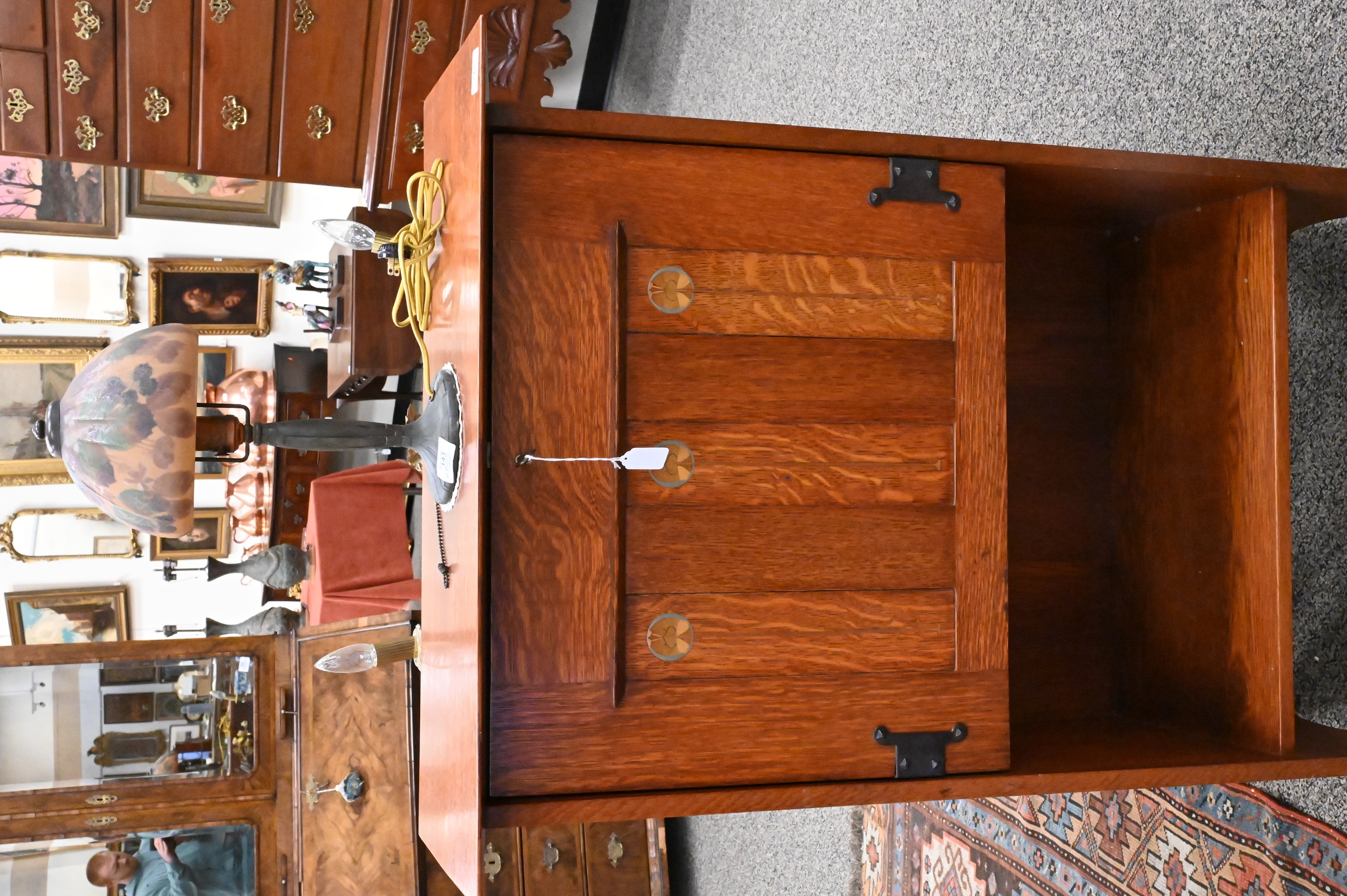 quarter-sawn American white oak, broad overhanging top beveled on underside, slightly canted fall-front with three recessed panels inset with stylized floral motif in pewter, copper, and exotic woods, opening to fitted interior over an open shelf, original hand-hammered copper hardware, marked on back at top with G. Stickley red stamp, later finish, 1903-1904