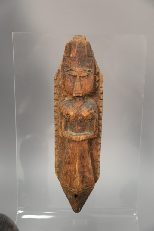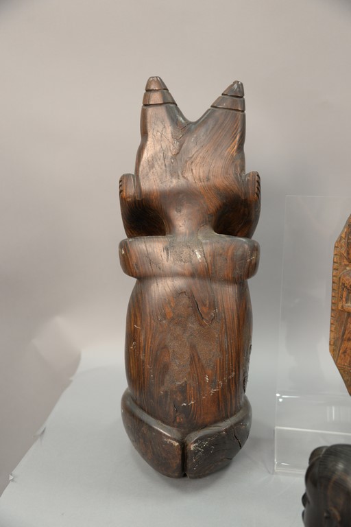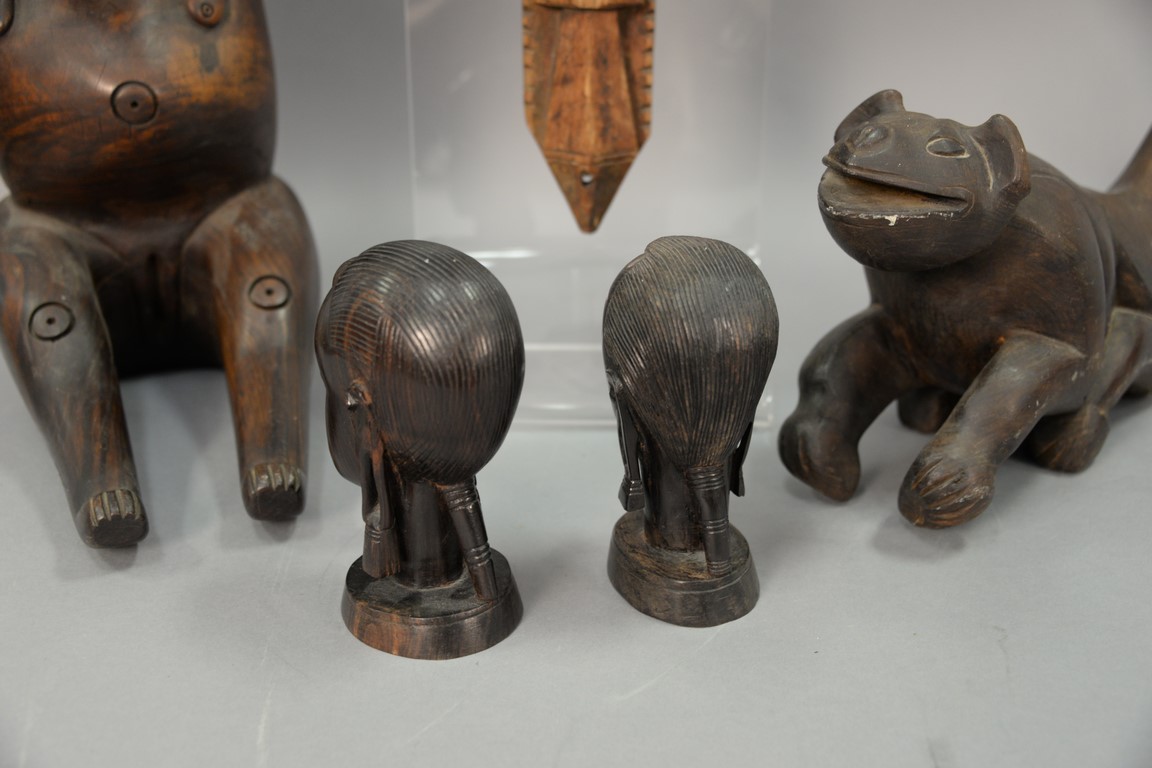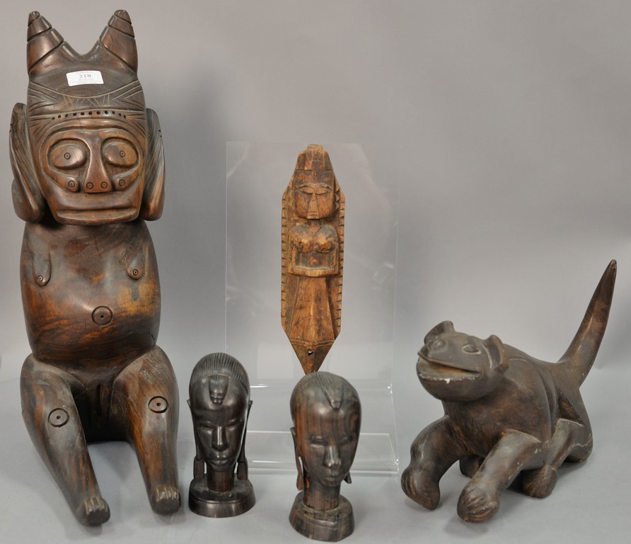 Large carved seated figure, pair of rosewood Tanganyika busts, African carved animal figure, and a carved figural Chinese architectural piece. ht. 6in. to 20in.