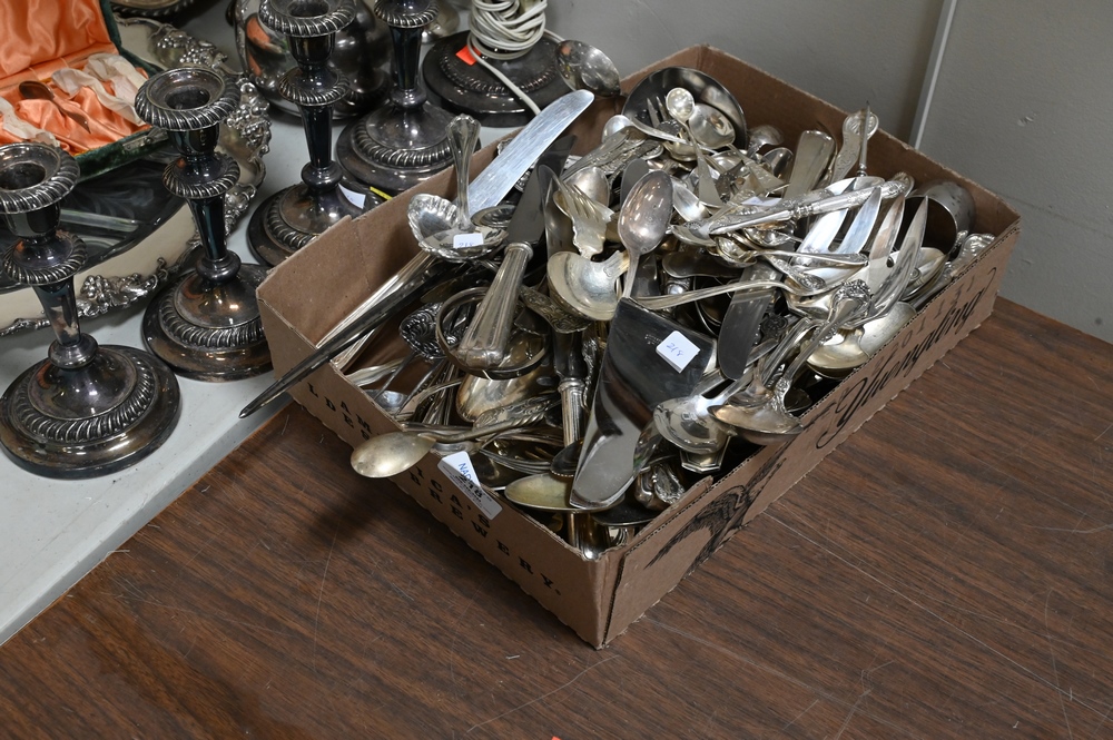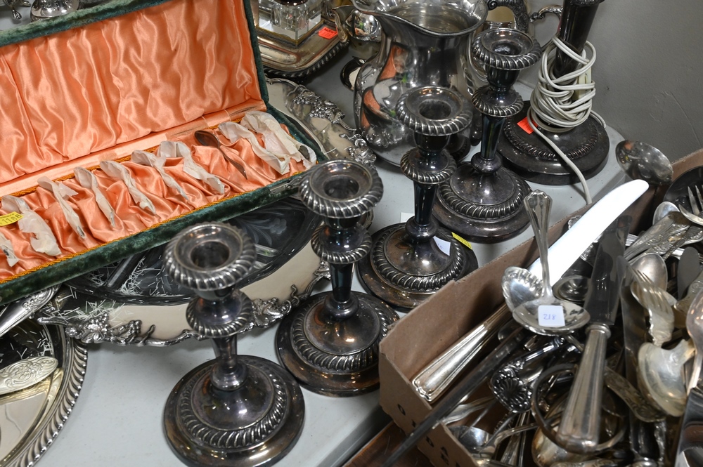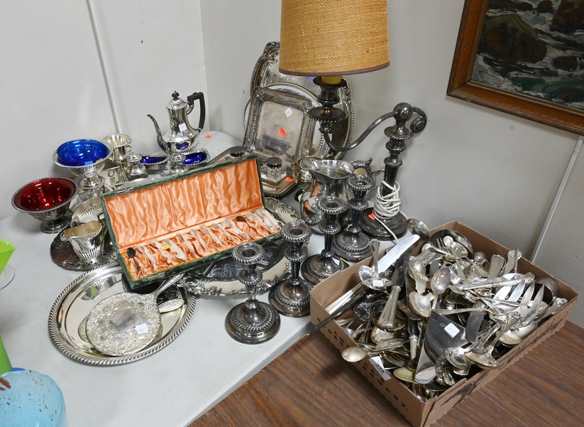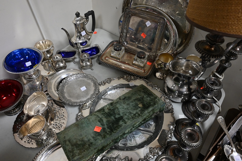 Large Group of Silverplate, to include flatware, bowls, tea sets, platters, ink well, set of four Sheffield silver plated candlestick and Sheffield silver plated candlestick lamp, open salts, large lot of flatware, etc.
