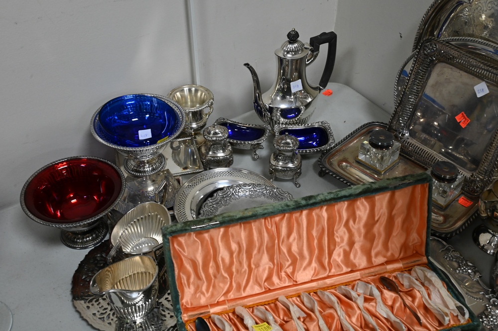 Lot 218: Large Group of Silverplate, to include flatware, bowls, tea sets, platters, ink well, set of four Sheffield silver plated candlestic…