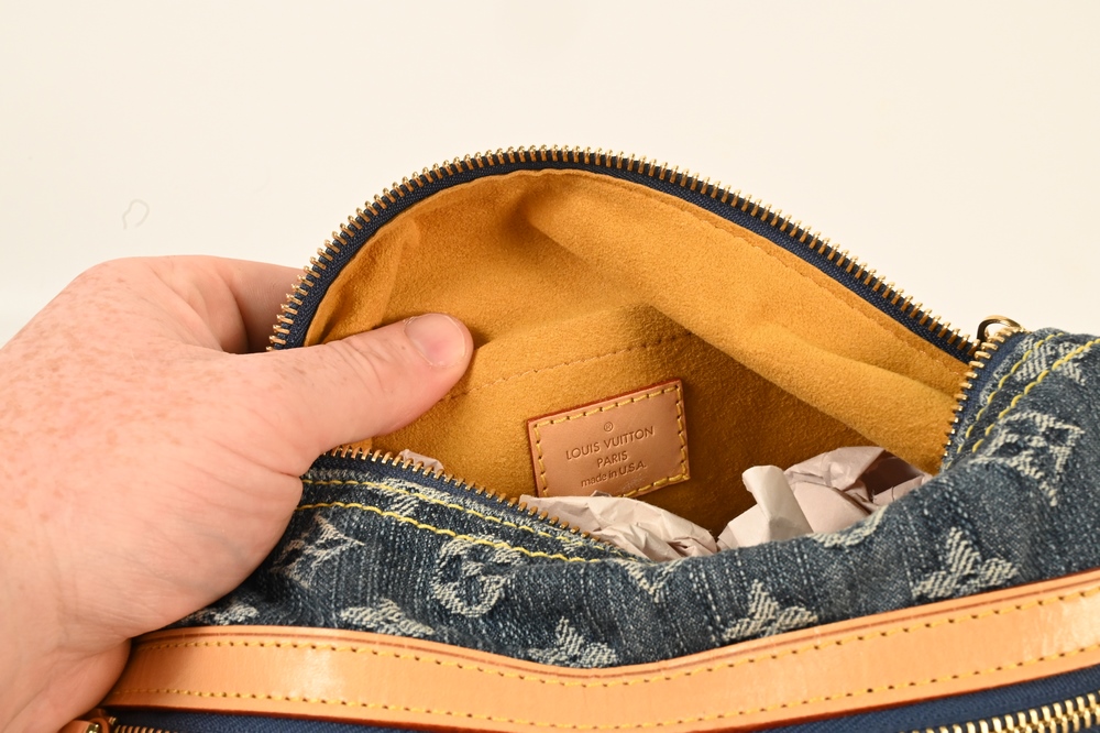 Lot 218: Louis Vuitton Denim “Baggy” PM Hobo Shoulder Bag, having single compartment suede interior with slip pocket, gold tone hardware, lea…