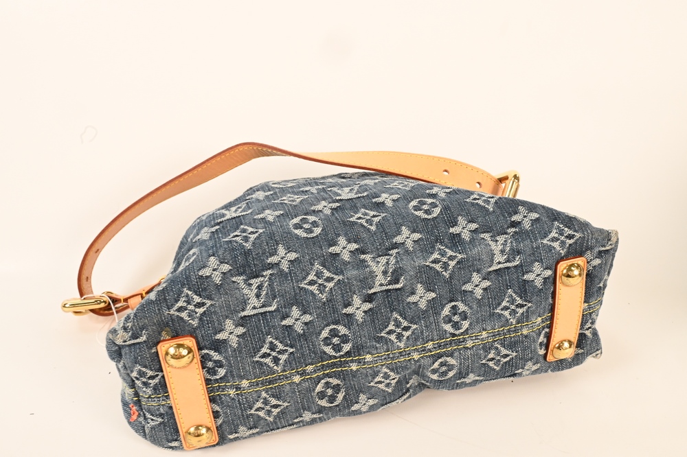 Louis Vuitton Denim “Baggy” PM Hobo Shoulder Bag, having single compartment suede interior with slip pocket, gold tone hardware, leather trim, three exterior pockets, single leather handle and top zip closure, interior clean with no issues, height 8 inches.