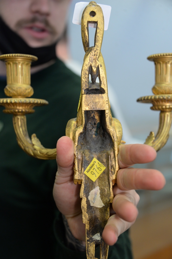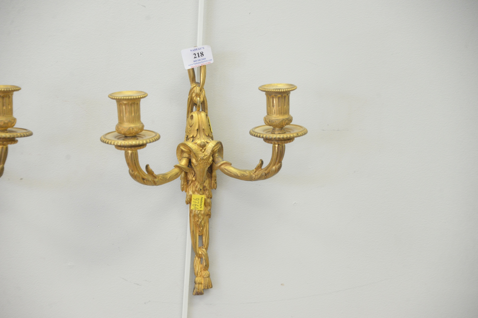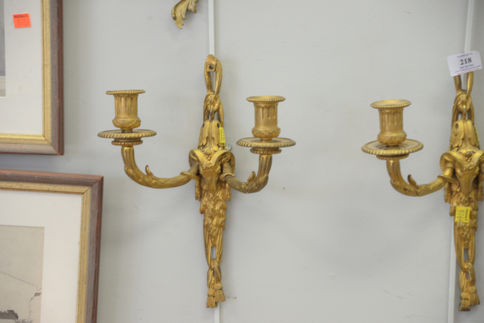 Lot 218: Pair French Gilt Bronze Sconces, two-light, with rams heads mask, height 13 inches.
