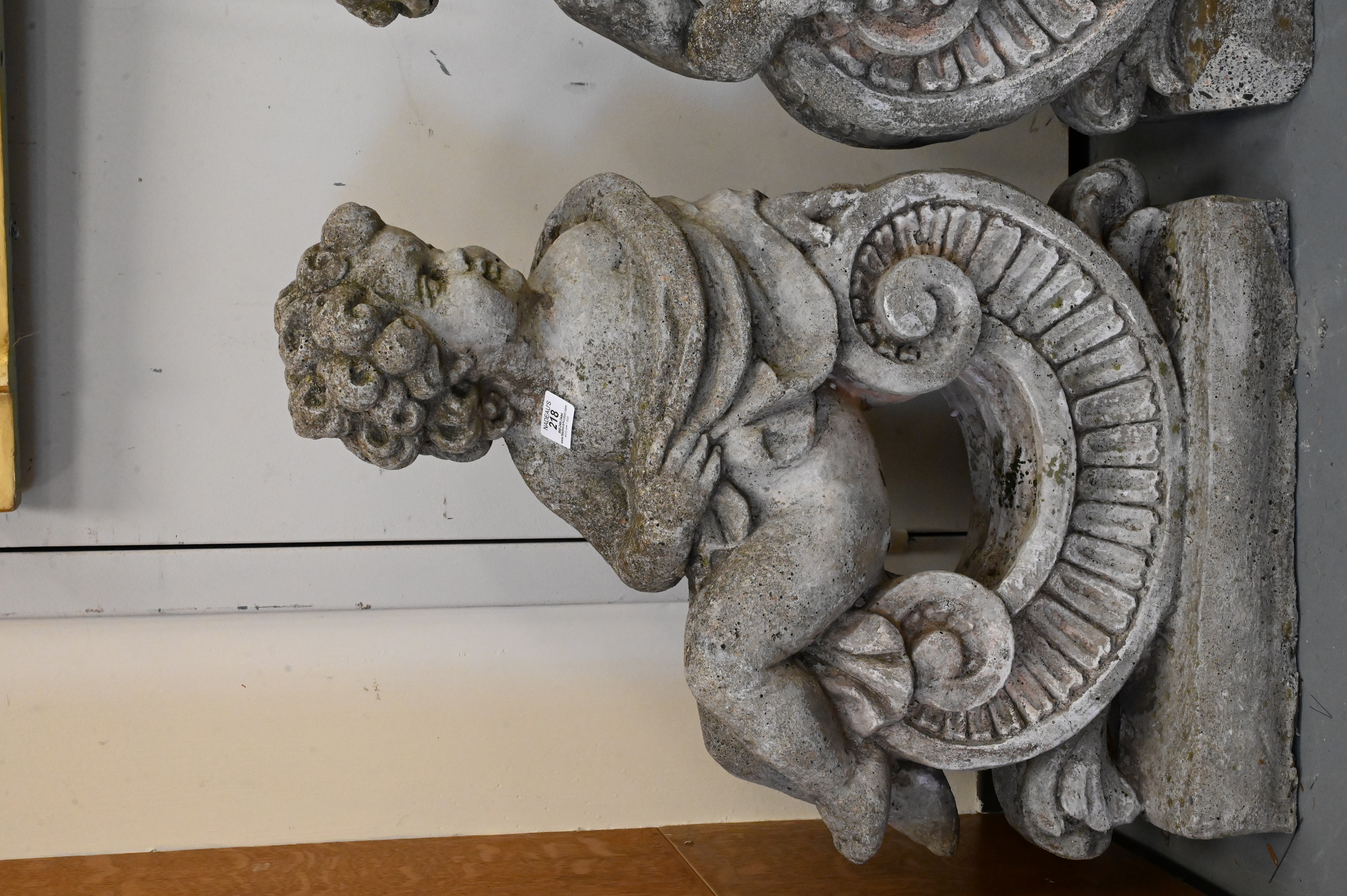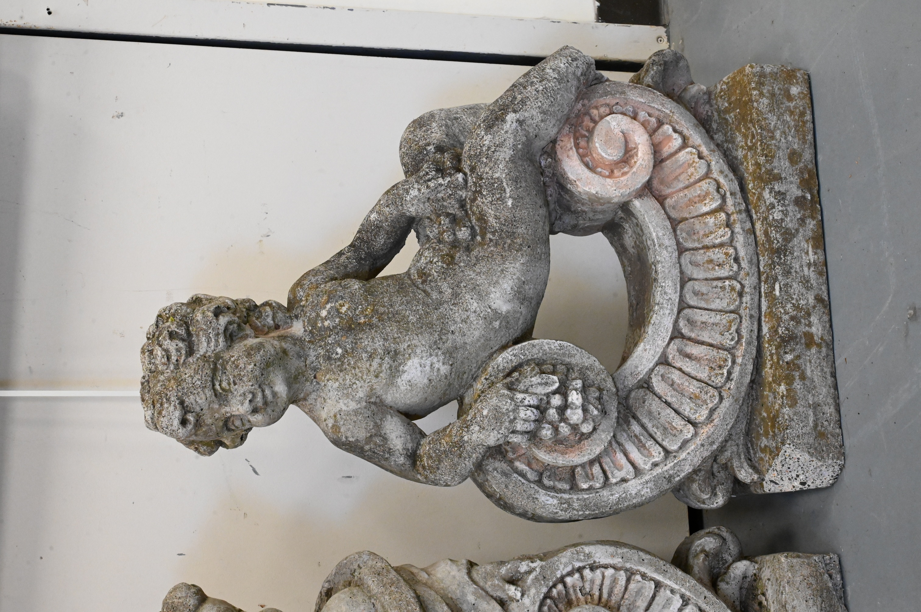 cherubs reclining on scrolled brackets, allegorical representation of two of the four seasons, one with broken foot