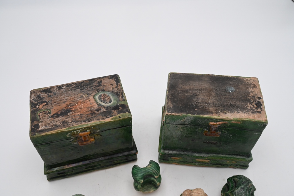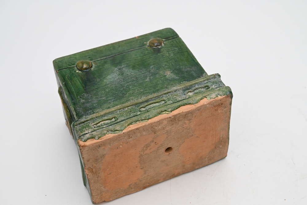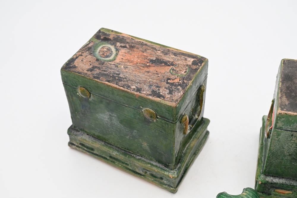 each green glazed pottery, tomb style chest having three funerary food offerings