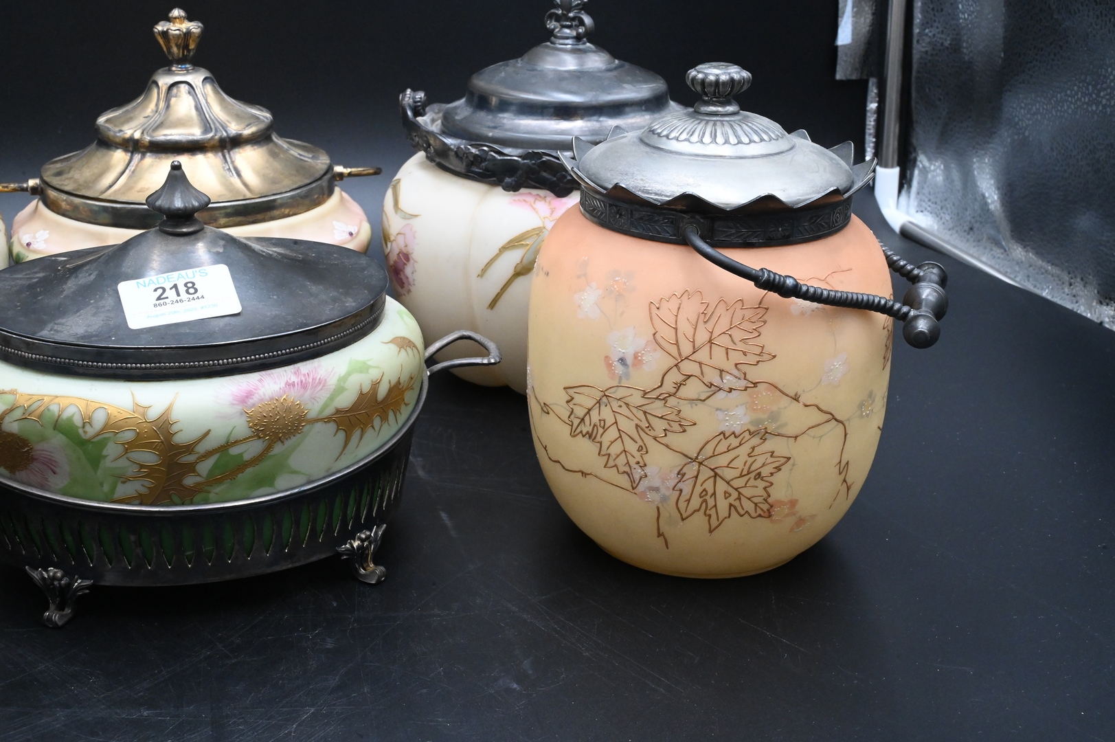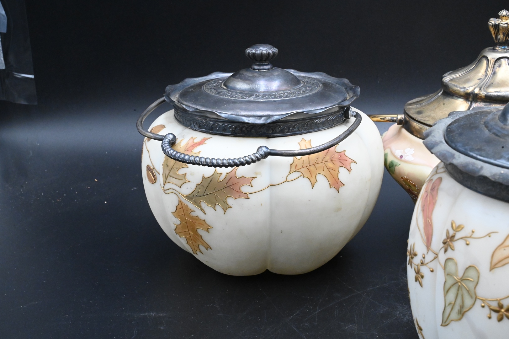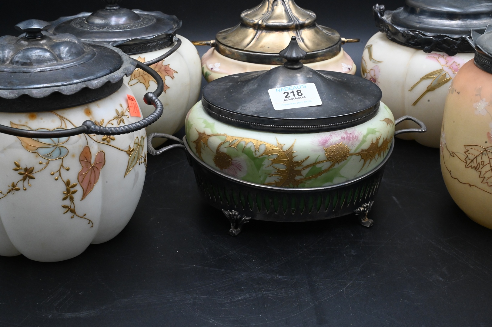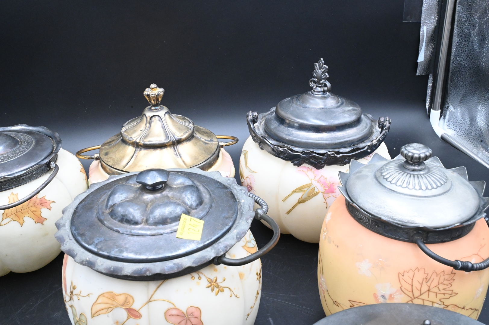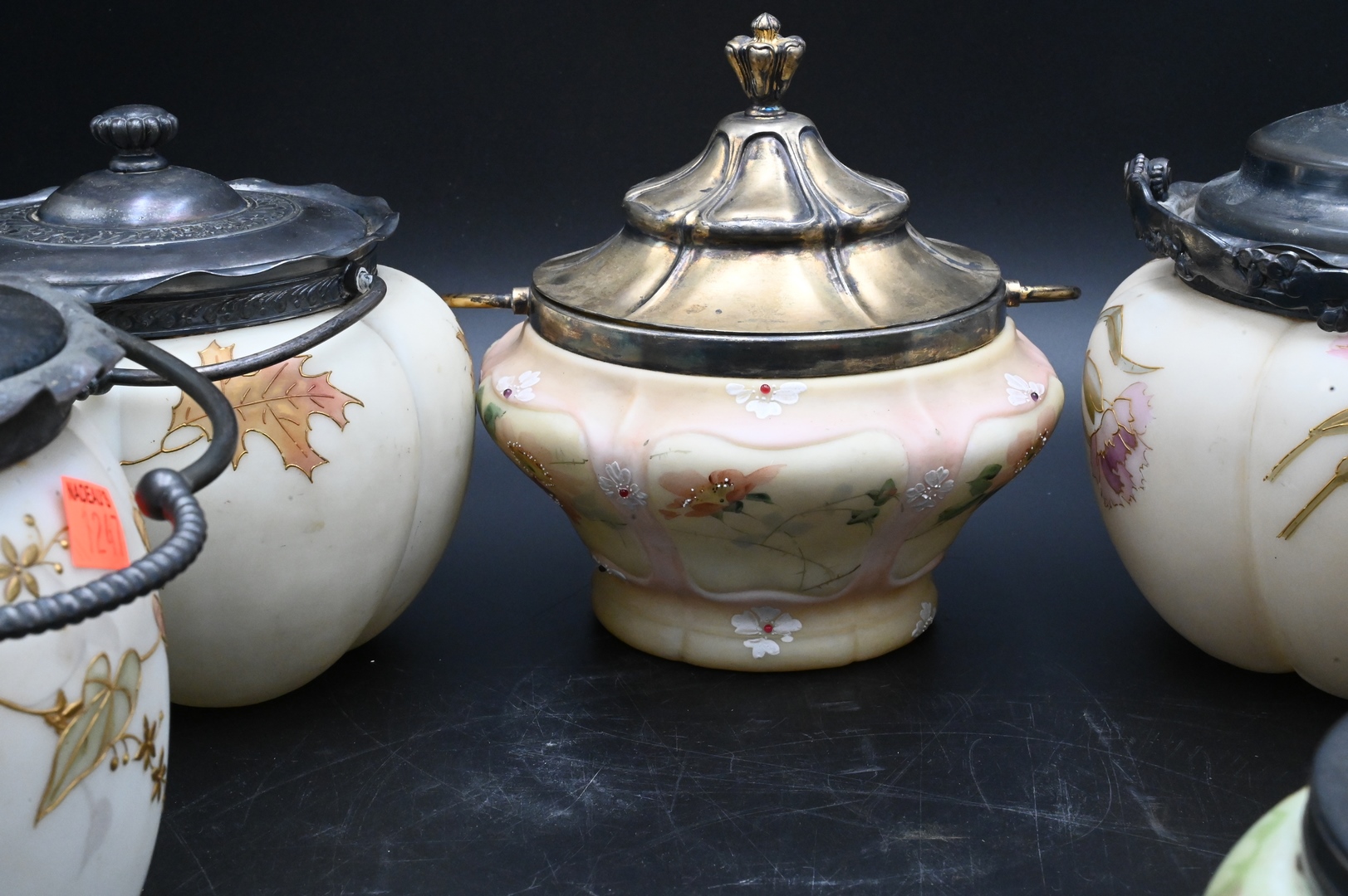 Six Mt. Washington Biscuit Jars, some crown Milano, having painted flowers with raised gold; tallest 7 1/2 inches. Provenance: From the Estate of Elwyn W. Lemon, Enfield, Connecticut.