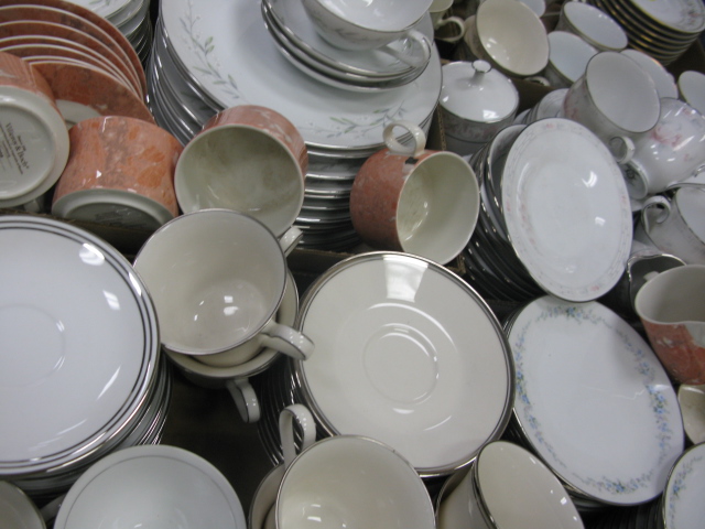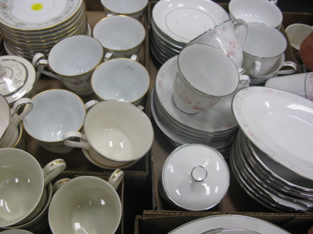 Ten box lots of china to include cups and saucers, some Royal Doulton pieces, Mika, Japanese china, some Fitz and Floyd gold band china, cups, saucers, plates, dinner plates, luncheon plates and miscellaneous.