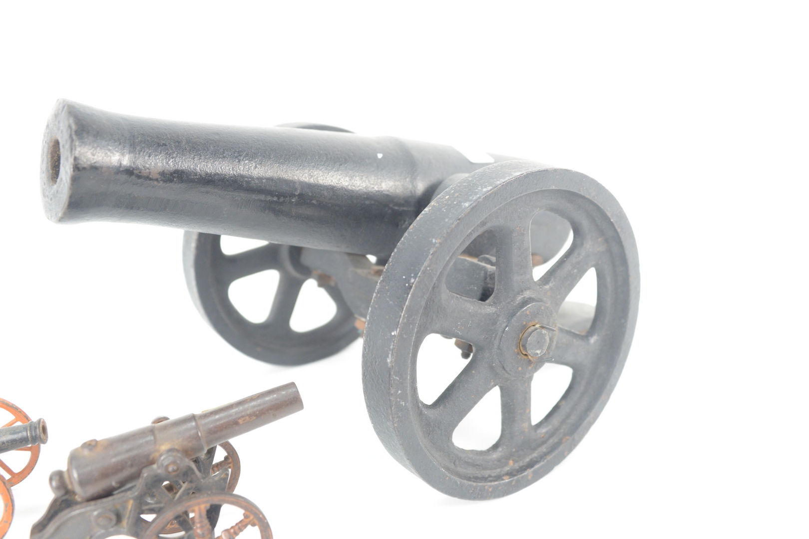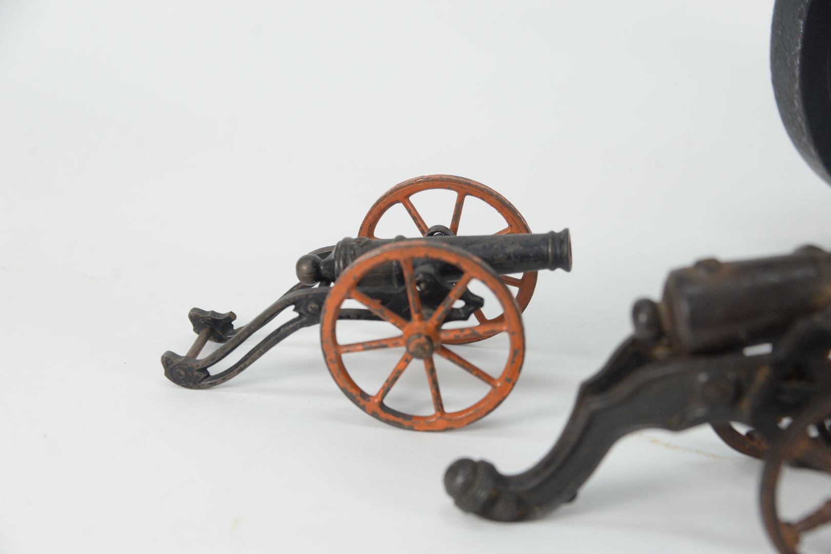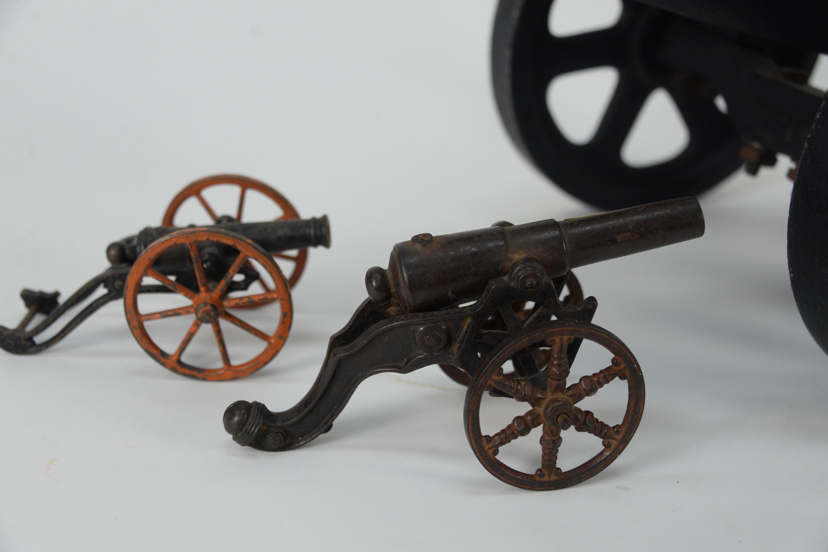 Lot 218: Three Iron Civil War Cannons, mid 19th century, two small toy sized along with a larger model for 1 inch balls, length 15 inches, width 11 inches.