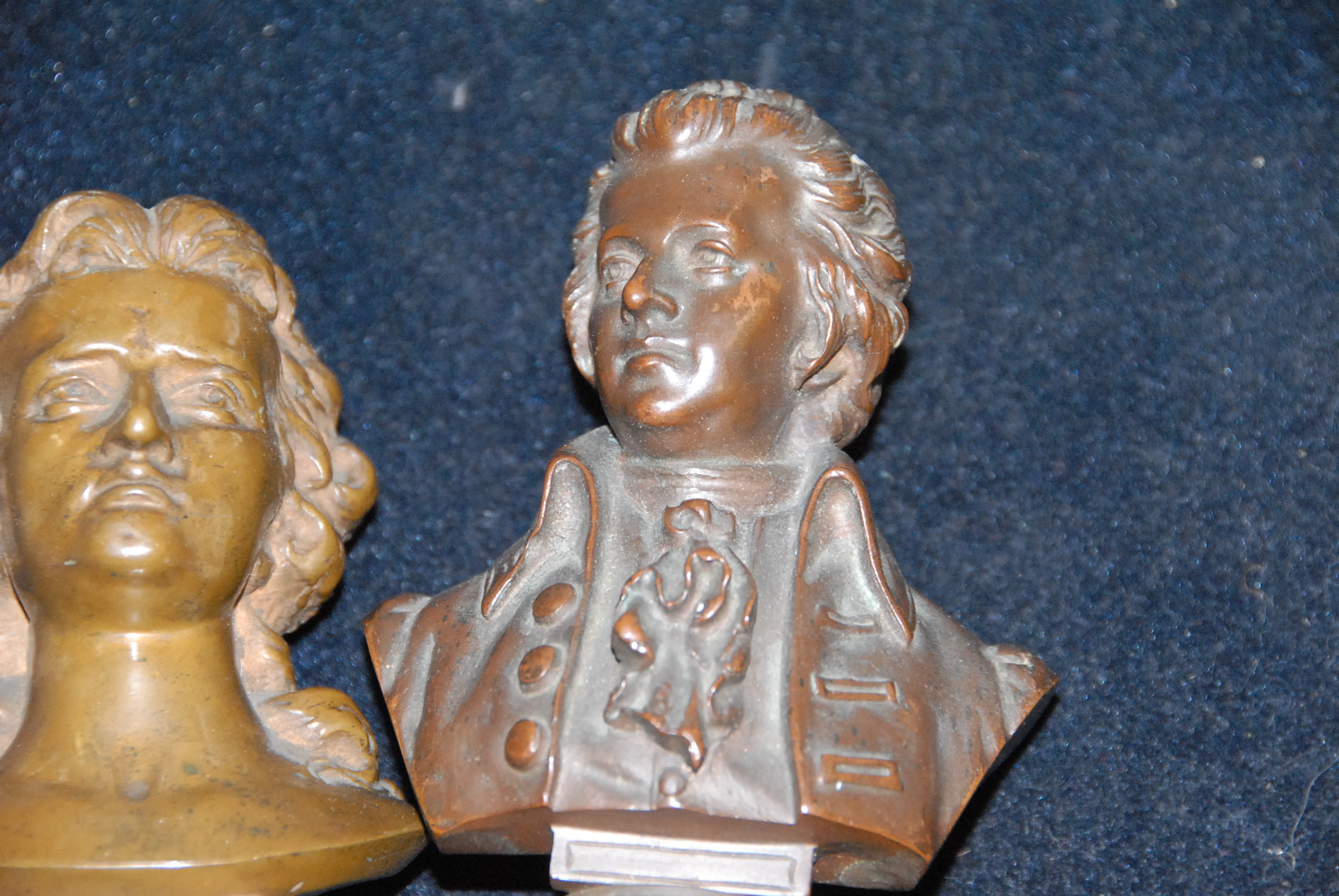 Two bronze busts and a white metal figure.