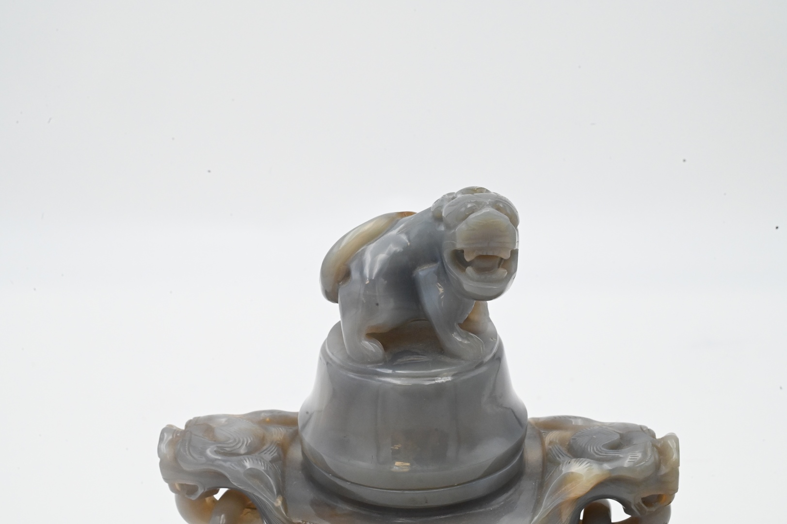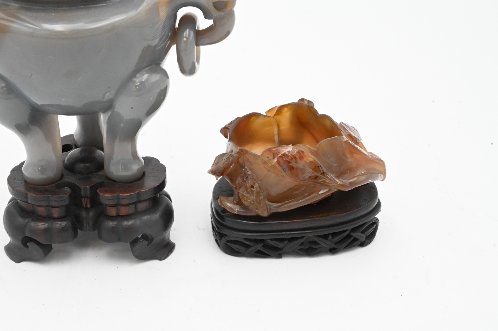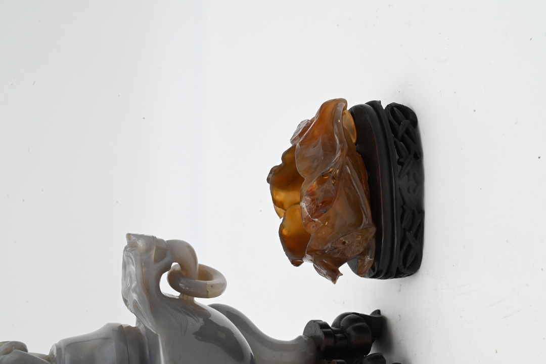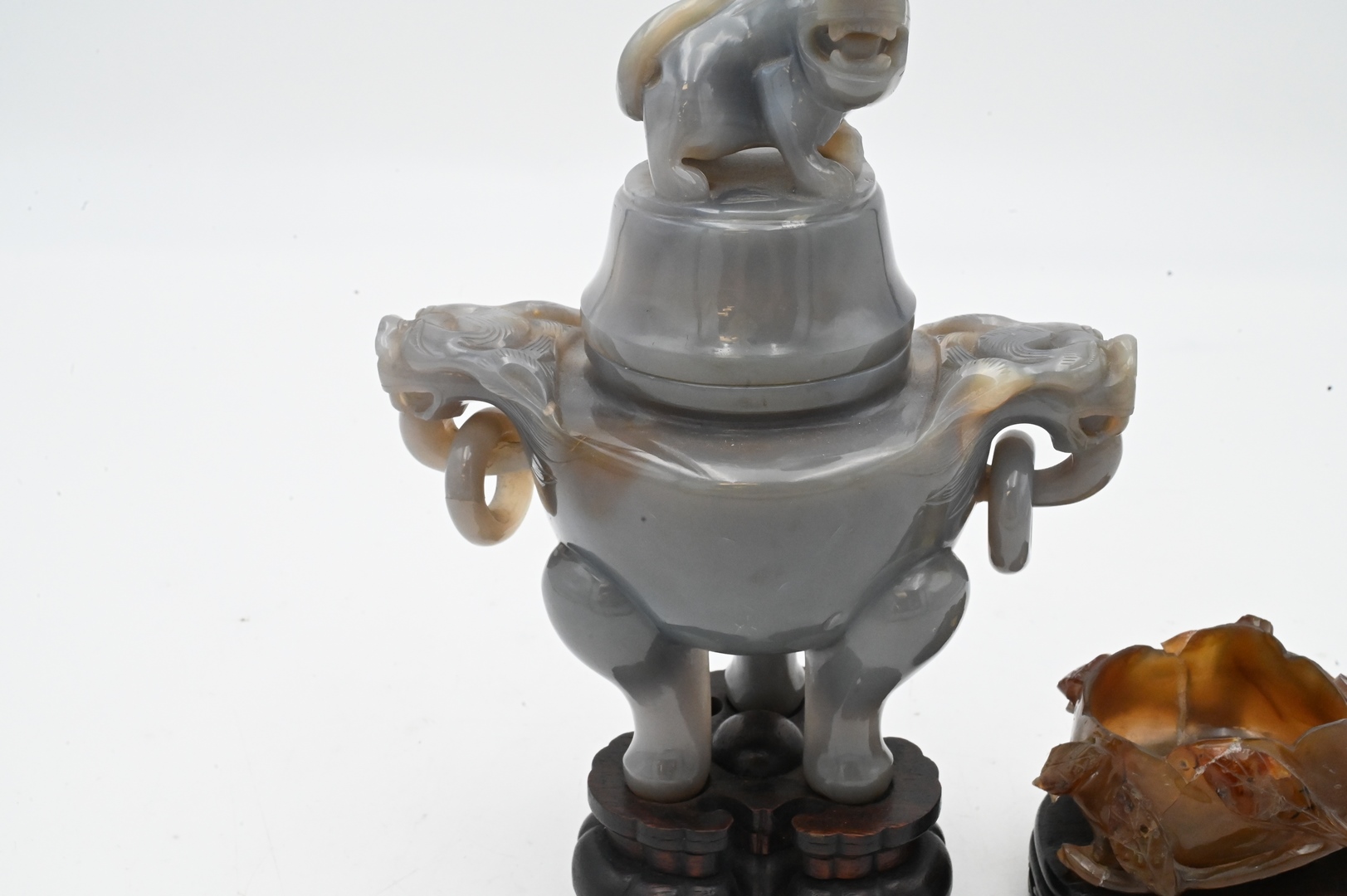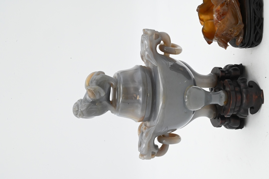 Two Carved Agate Pieces, to include a covered foo dog urn having foo dog finial and handles with rings, on tripod base; align with a leaf form brush washer; tallest 9 inches.