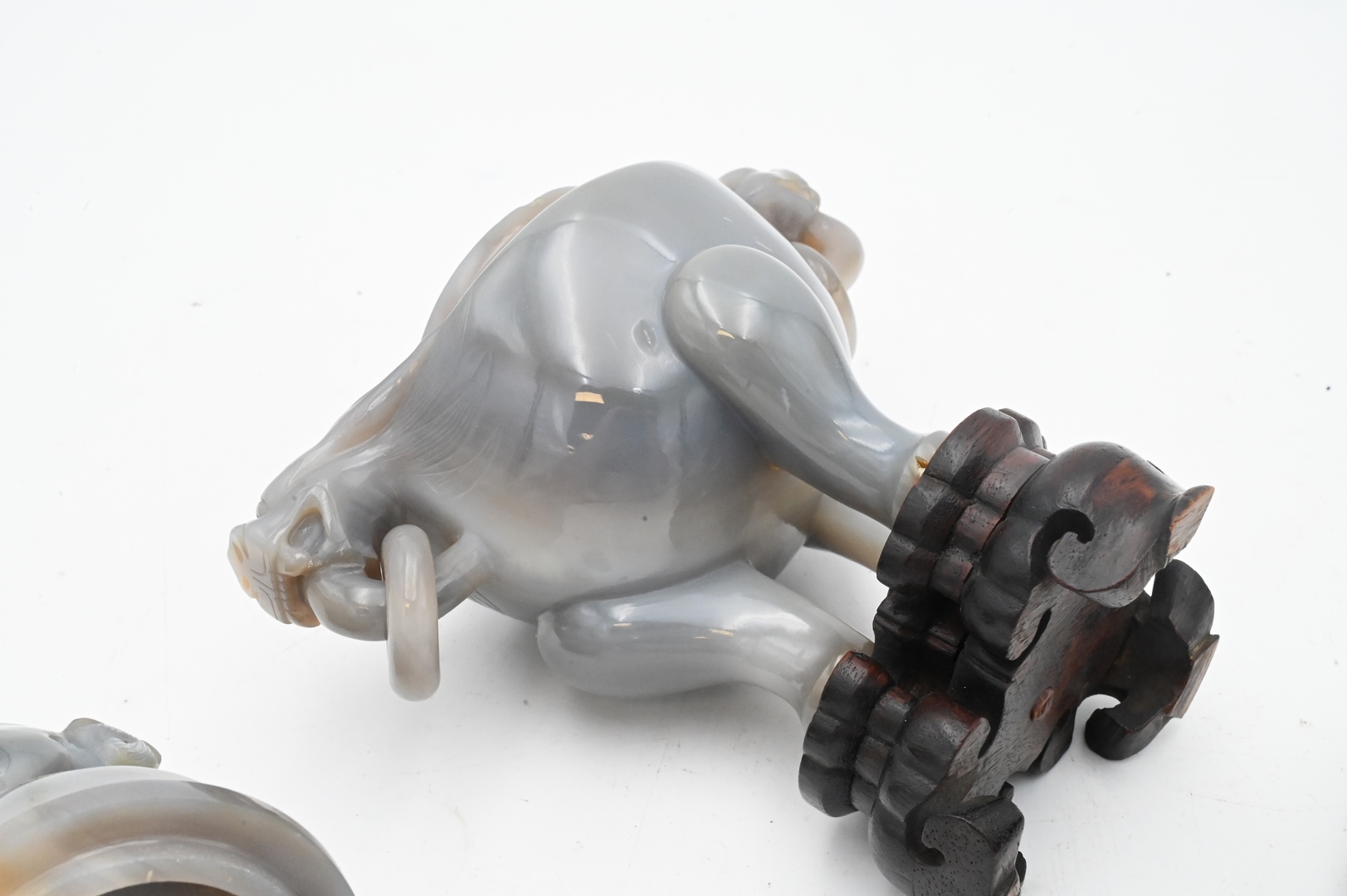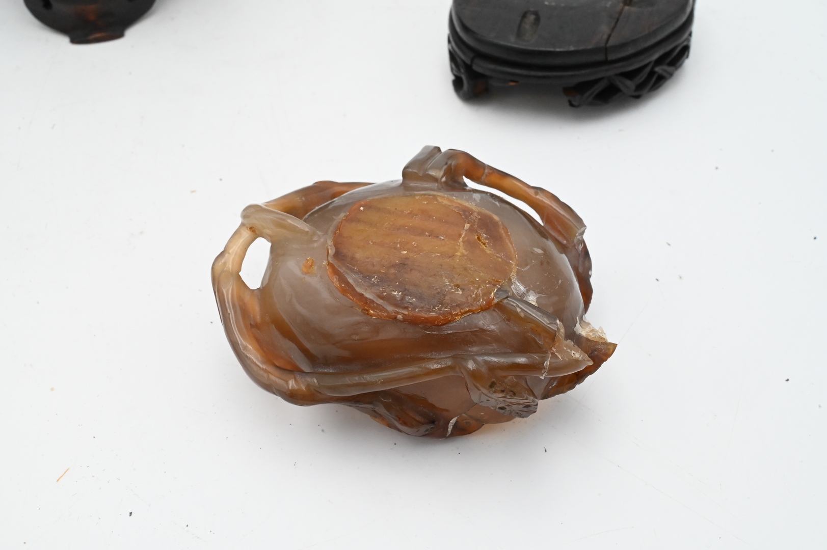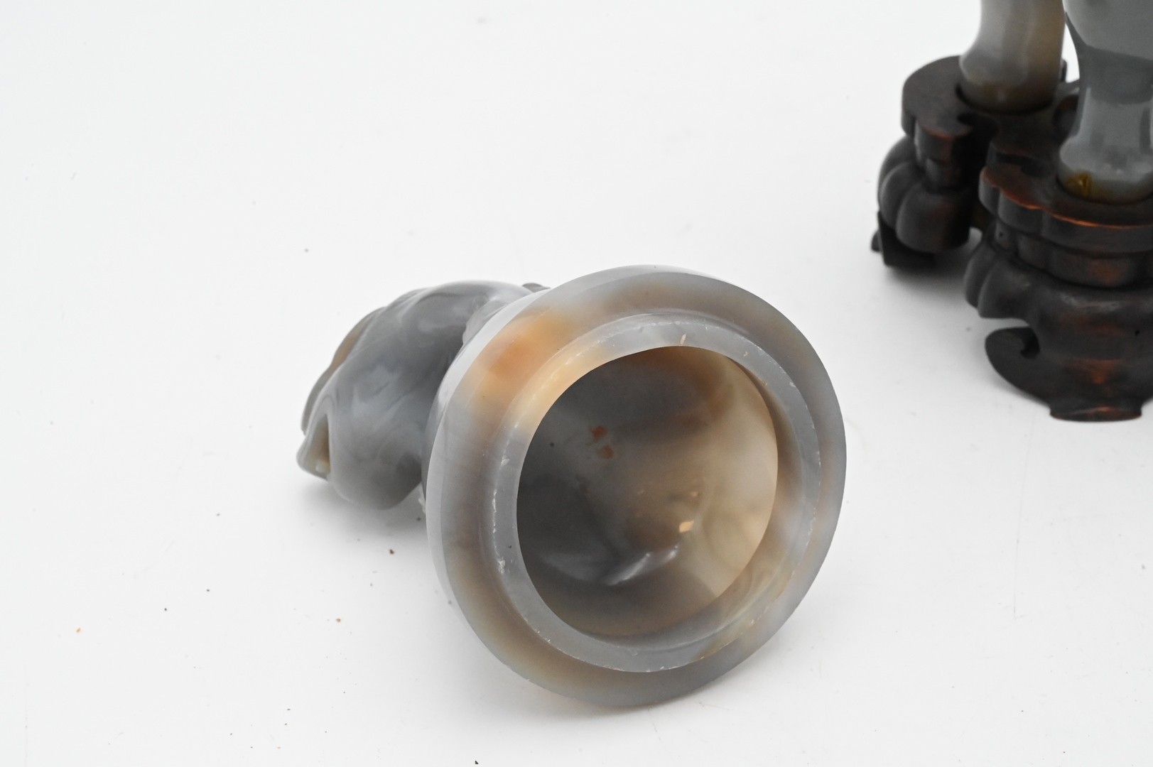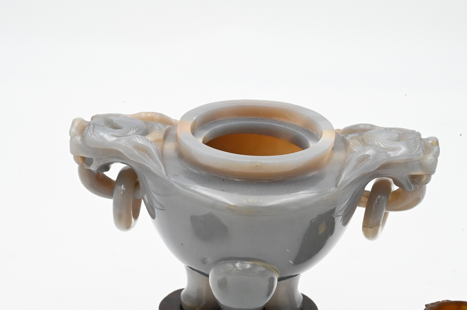 Two Carved Agate Pieces, to include a covered foo dog urn having foo dog finial and handles with rings, on tripod base; align with a leaf form brush washer; tallest 9 inches.