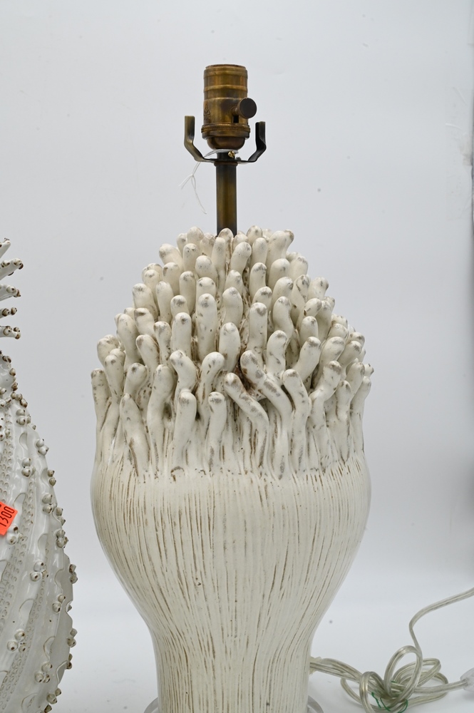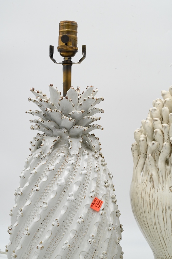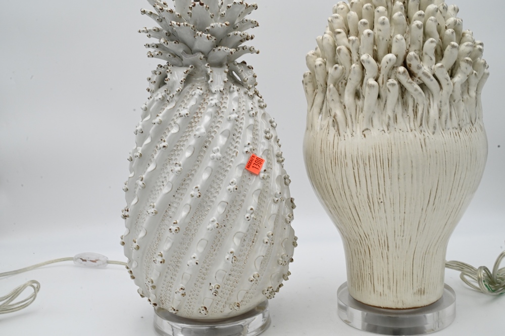 Two Italian Art Pottery Table Lamps, one white glazed in the form of a pineapple, along with white glazed pottery, height 21 inches, width 22 inches.