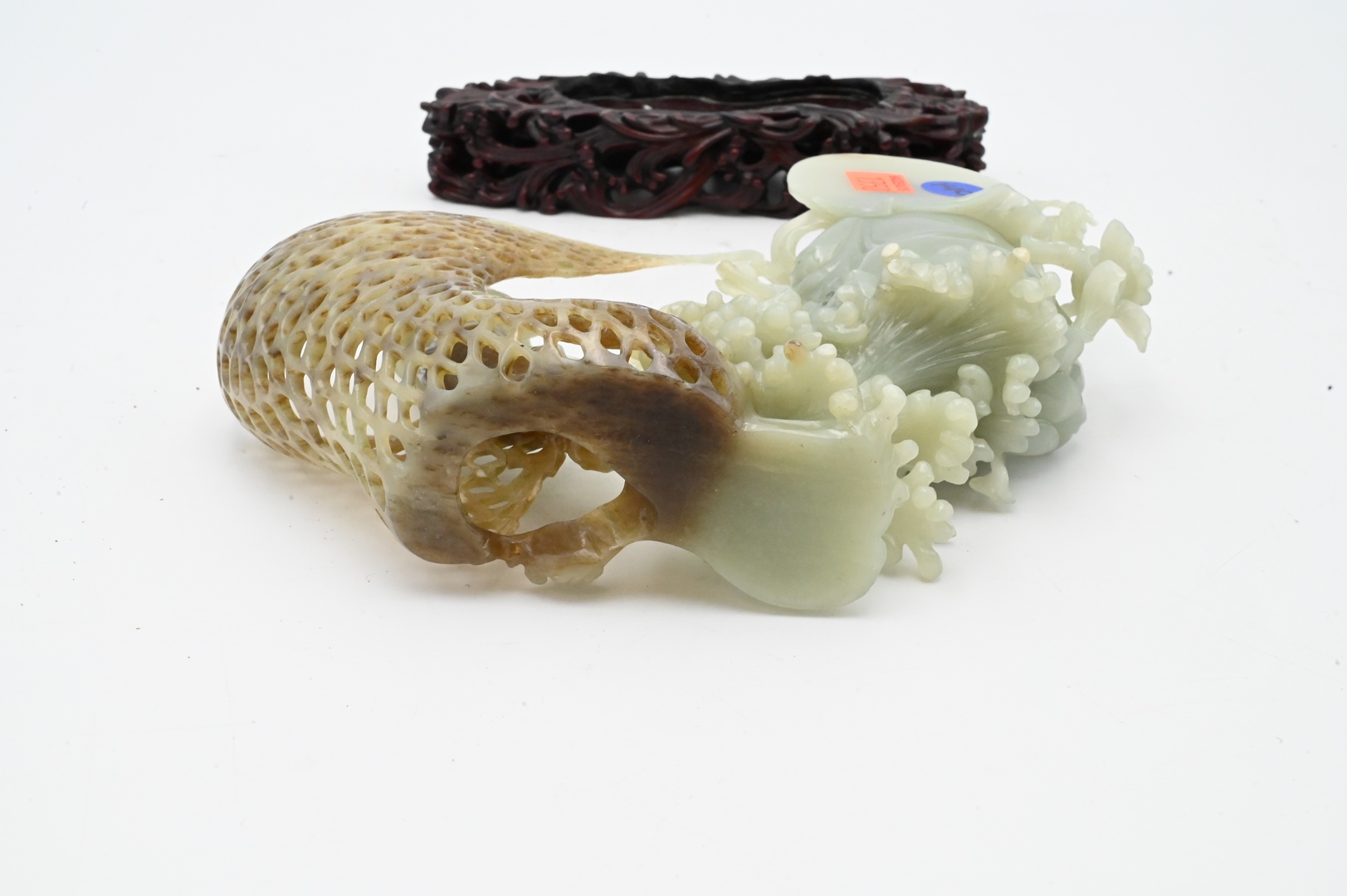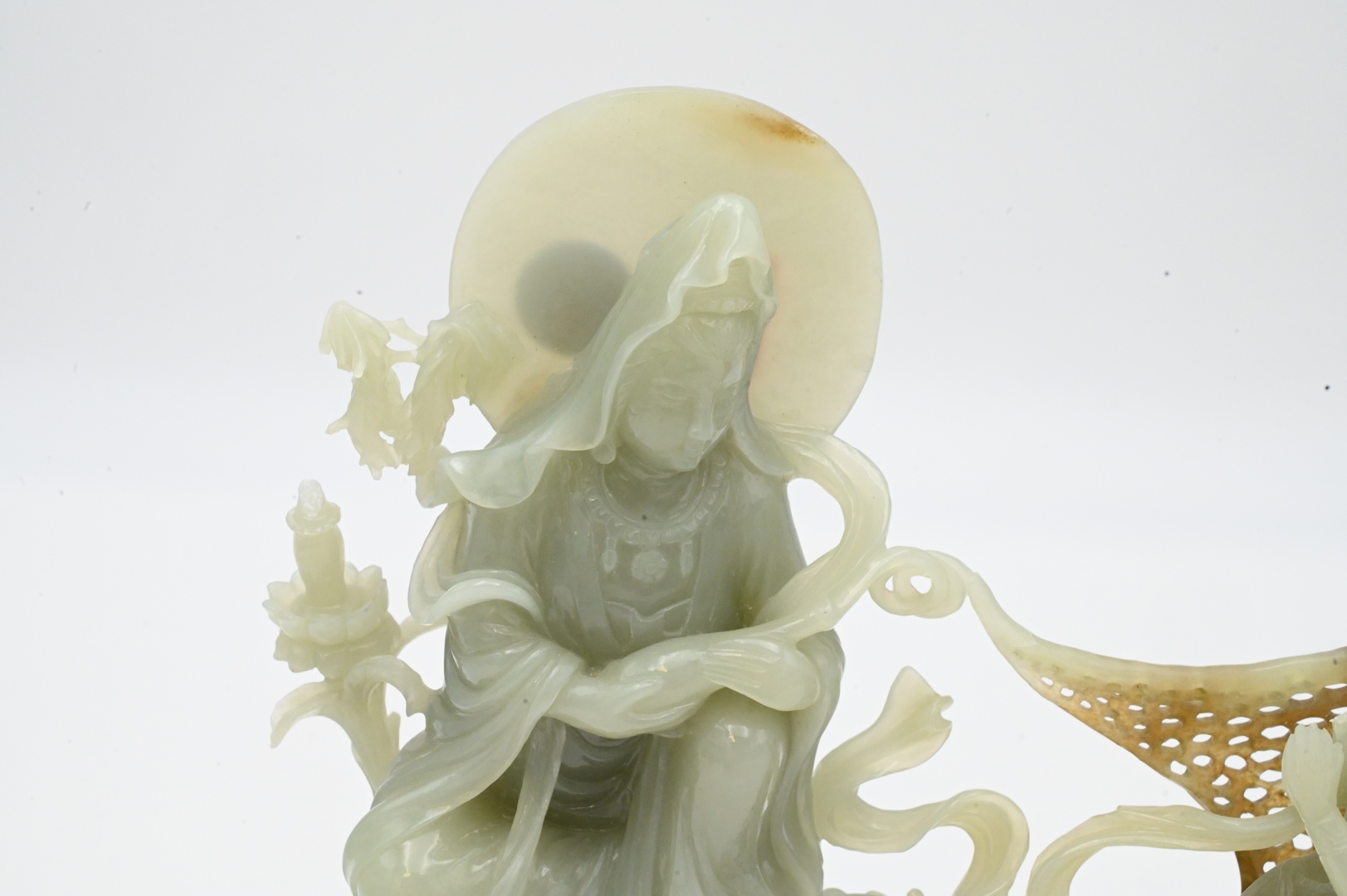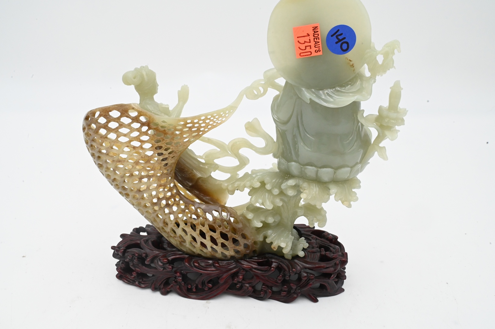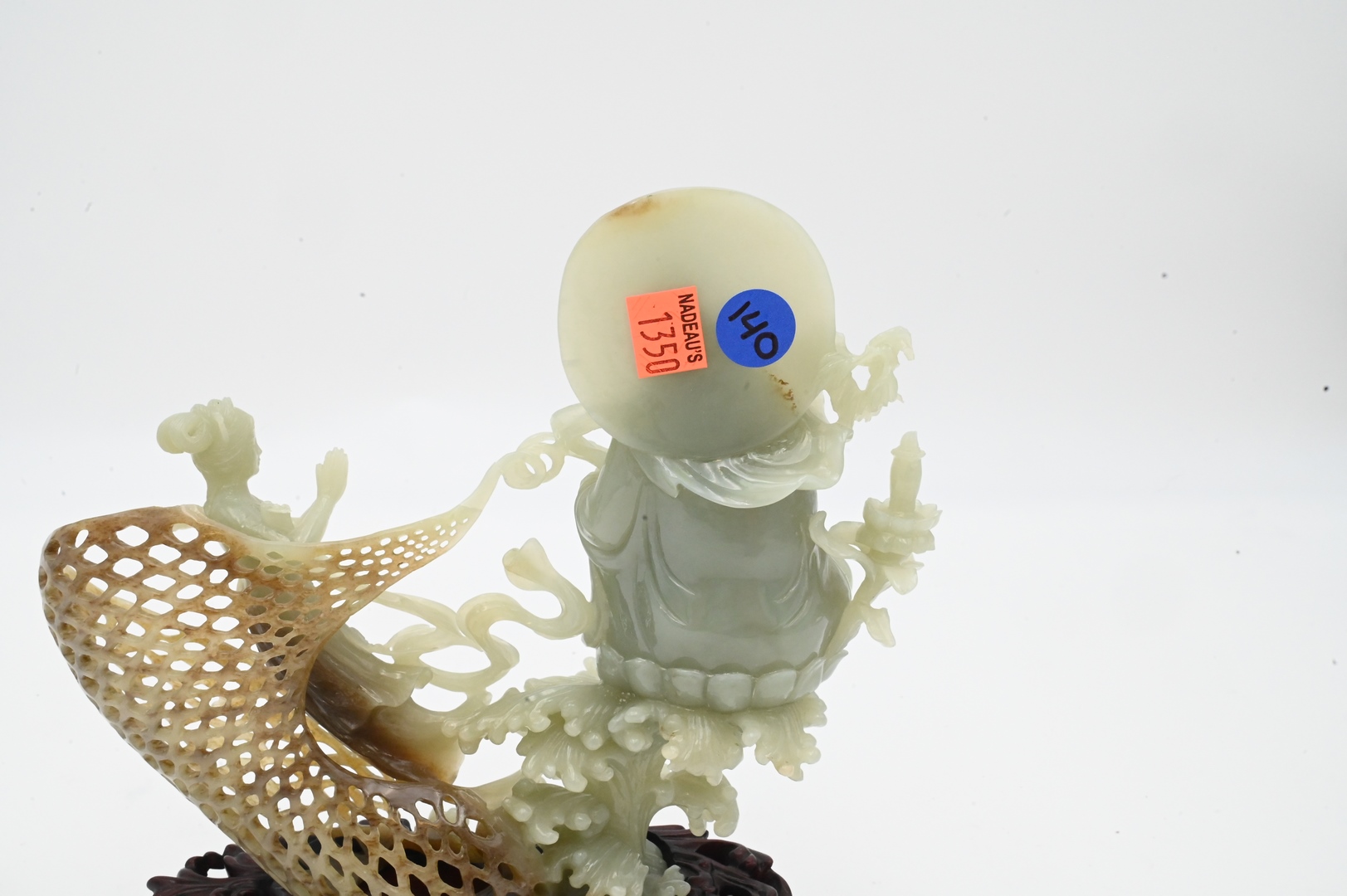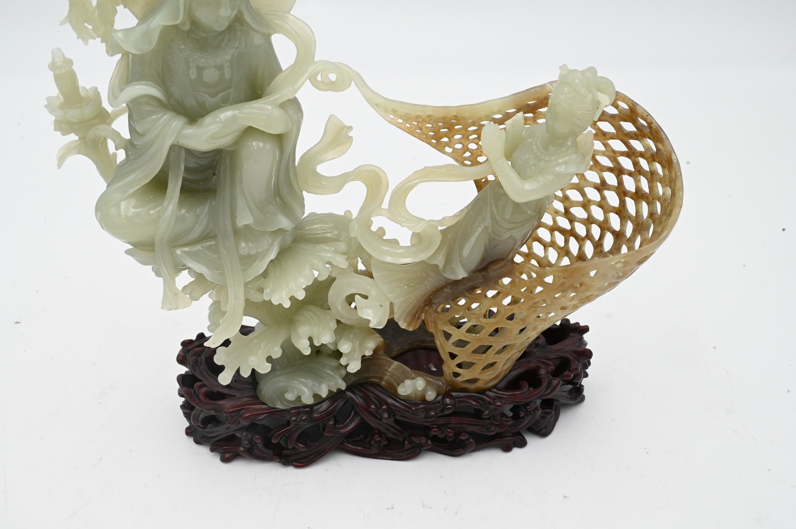 Chinese Hardstone Carved Figure Mermaid and Goddess on Wood Base, has breaks, chips, height 9 1/4 inches, length 9 1/2 inches.