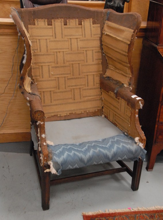 Chippendale mahogany wing chair with serpentine wings and rolled arms set on square molded legs no upholstery. seat ht. 16in. back ht. 46in.