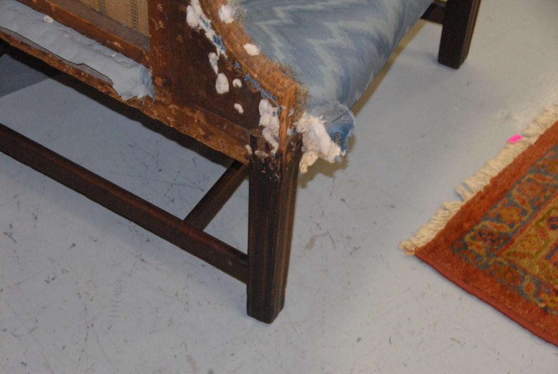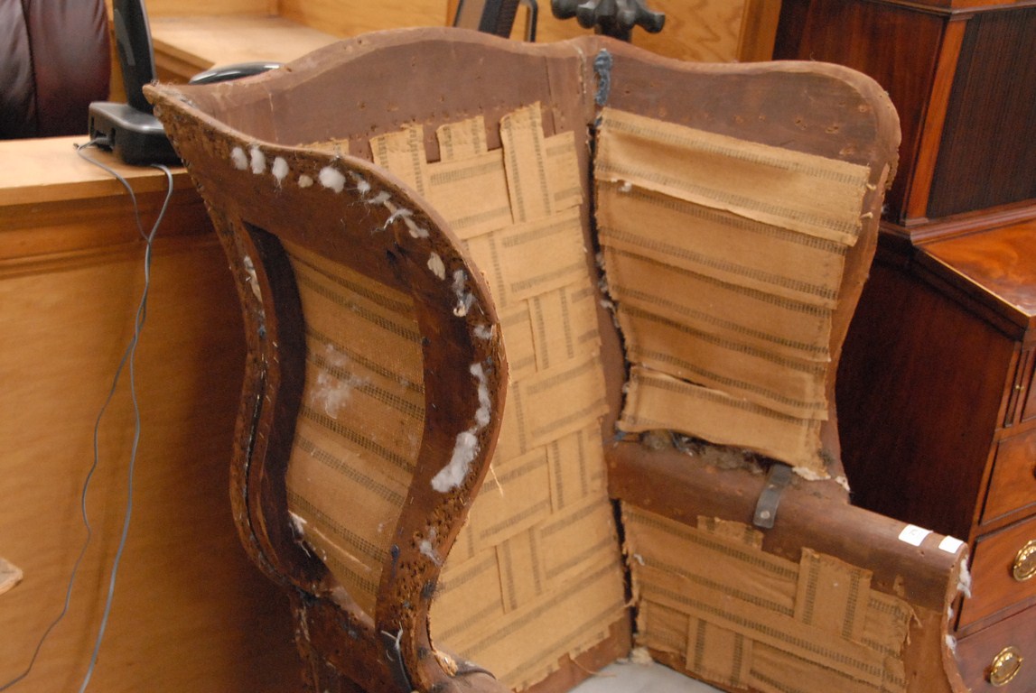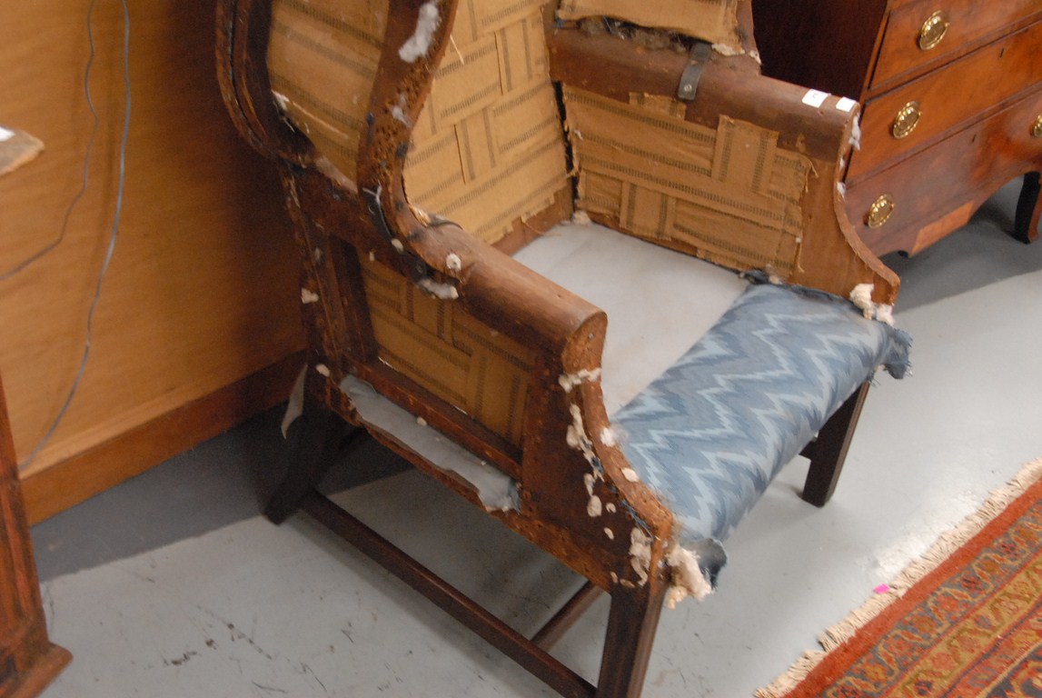 Lot 219: Chippendale mahogany wing chair with serpentine wings and rolled arms set on square molded legs no upholstery. seat ht. 16in. bac…