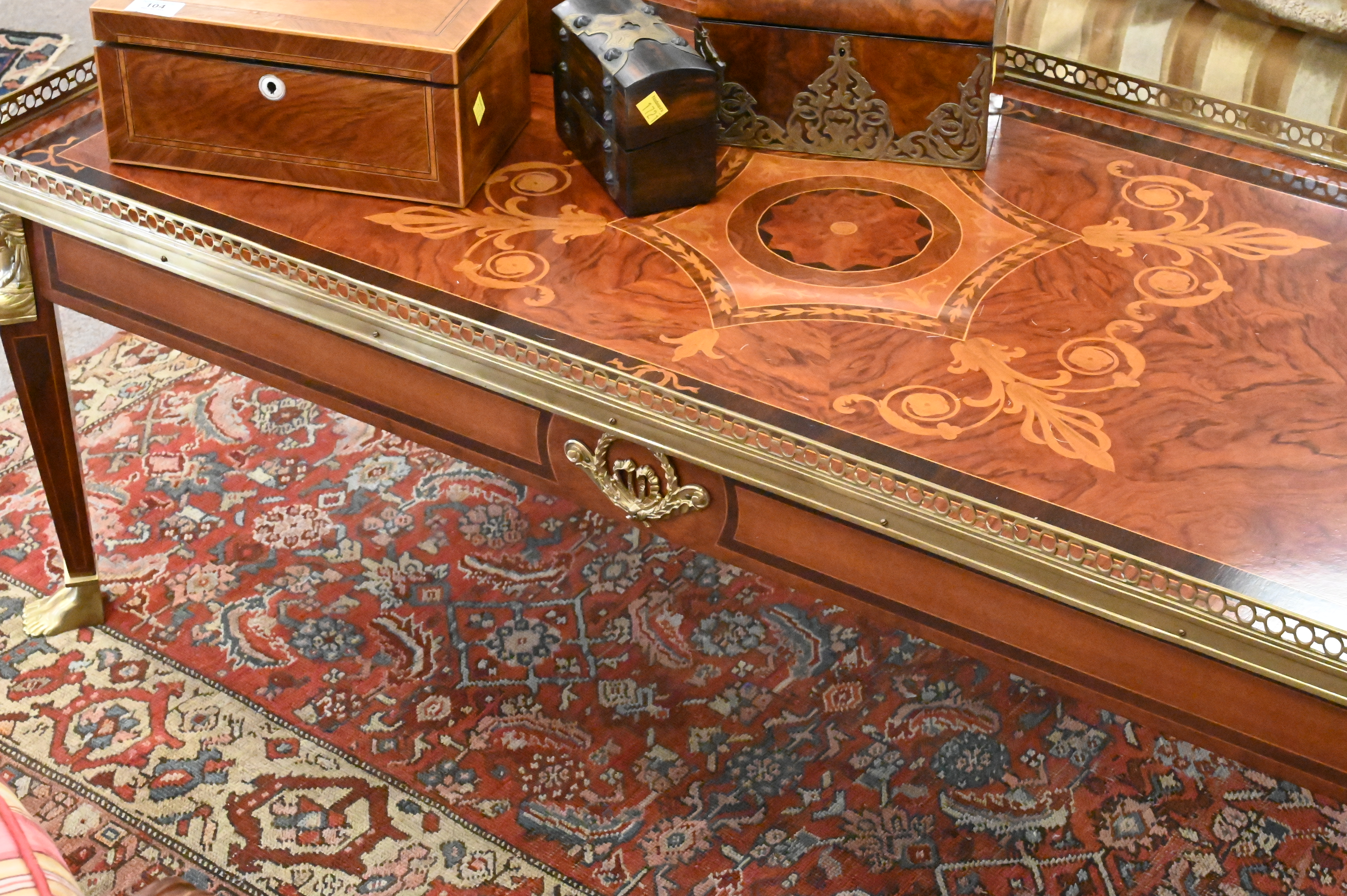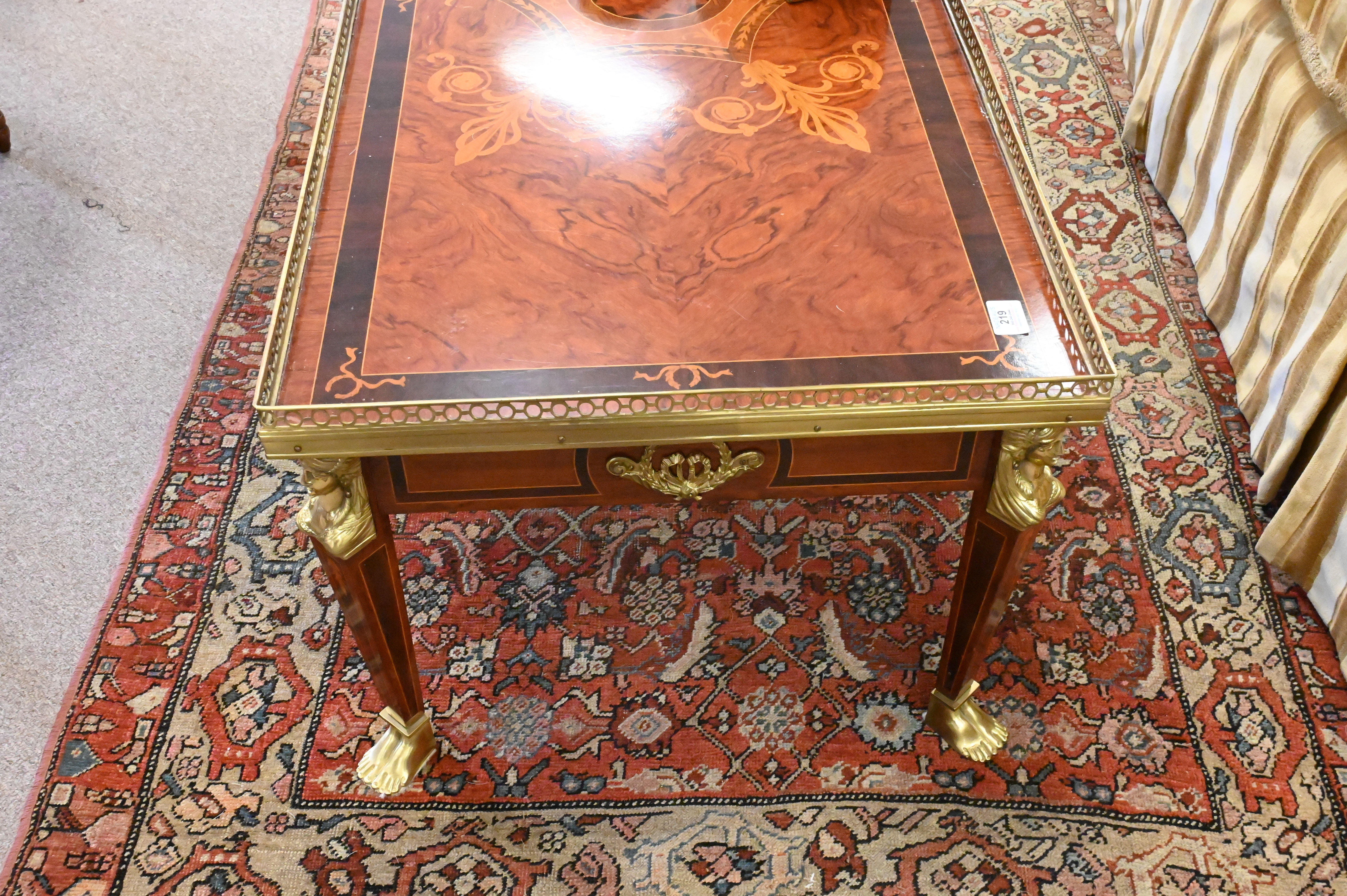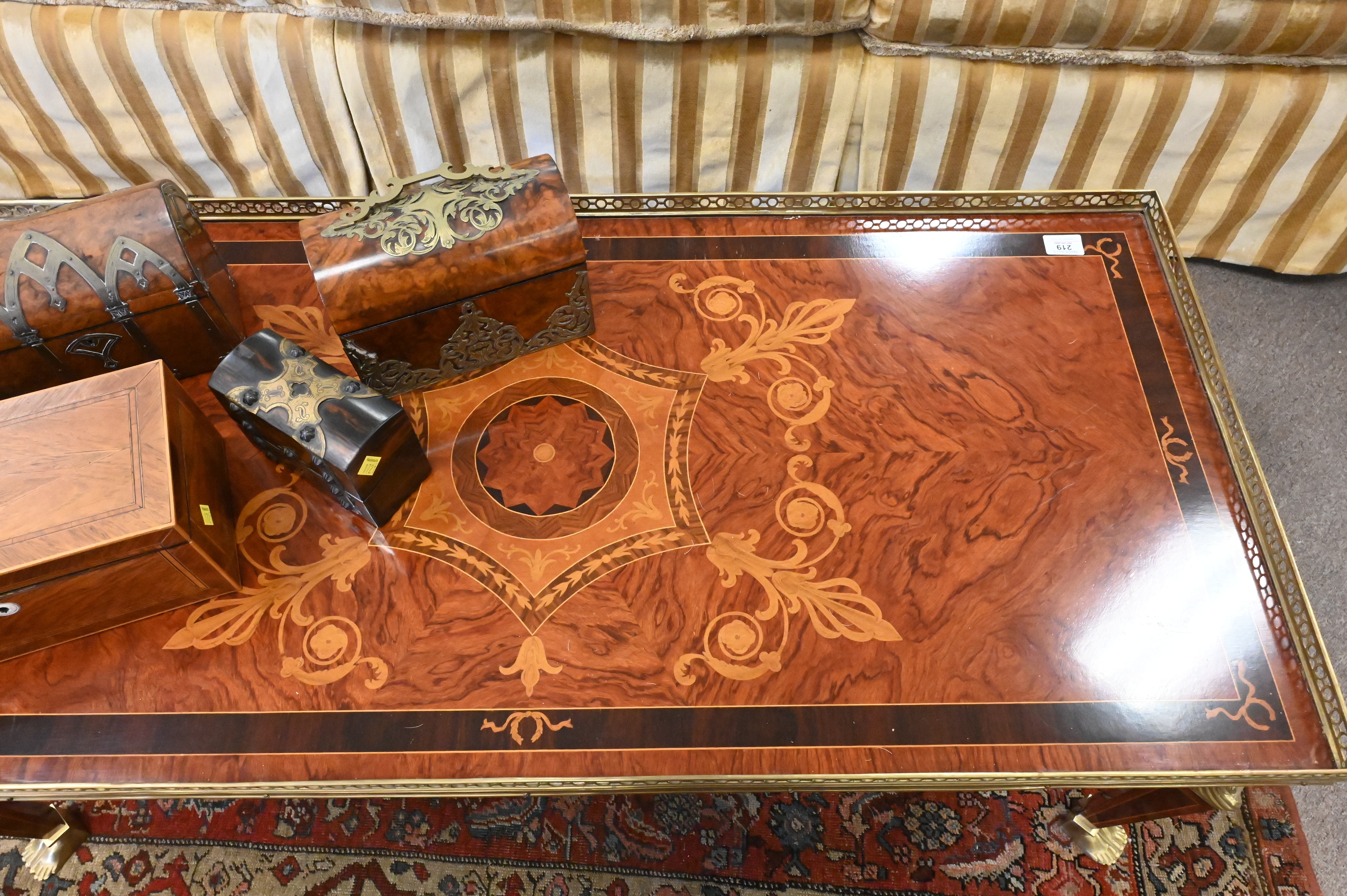Continental Style Inlaid Coffee Table, with brass tail and brass feet, height 17 inches, top 23″x 48″
