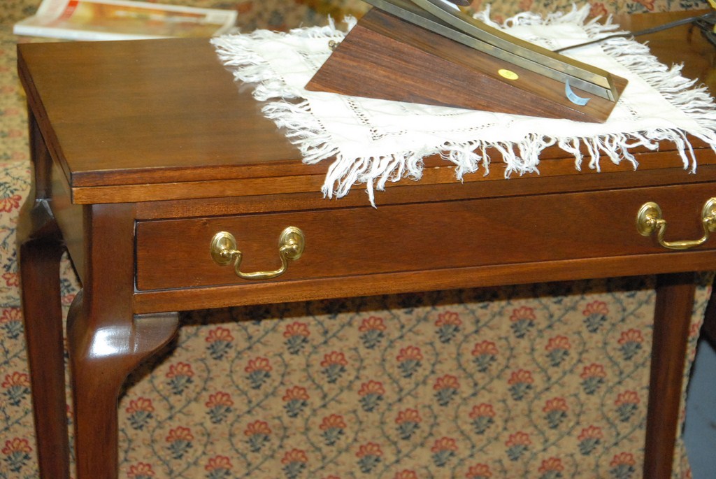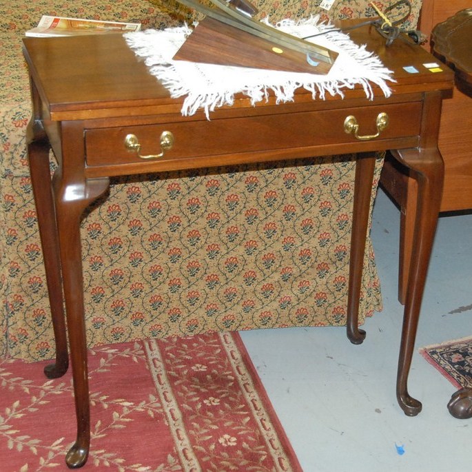 Custom mahogany Queen Anne style game table with drawer, ht. 30in. wd. 29in. Provenance: Estate of Judy Gengras McDonough of West Hartford, CT.