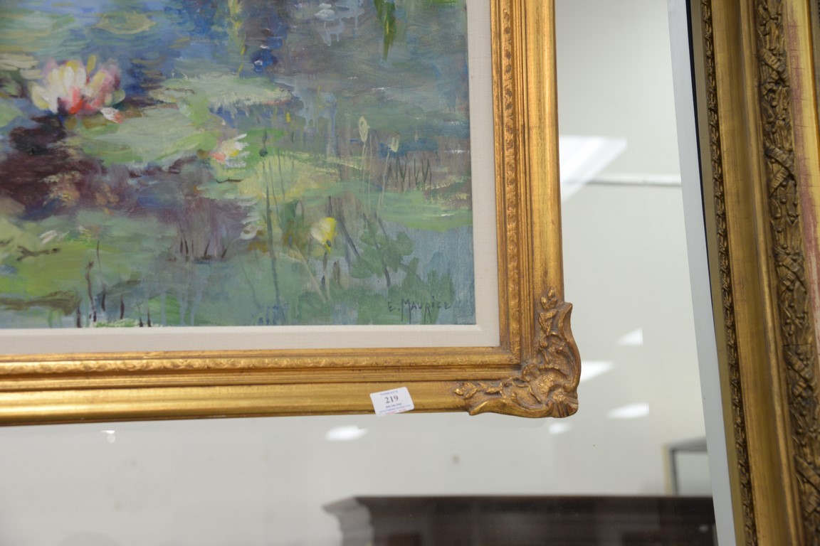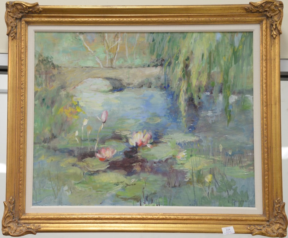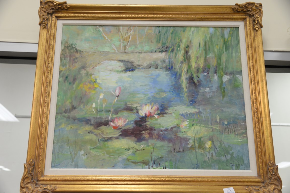 Lot 219: Eleanor Ingersoll Maurice 1901-1995, oil on canvas, Spring Pond with Lily pads, signed lower right: E. Maurice, 24 x 30.