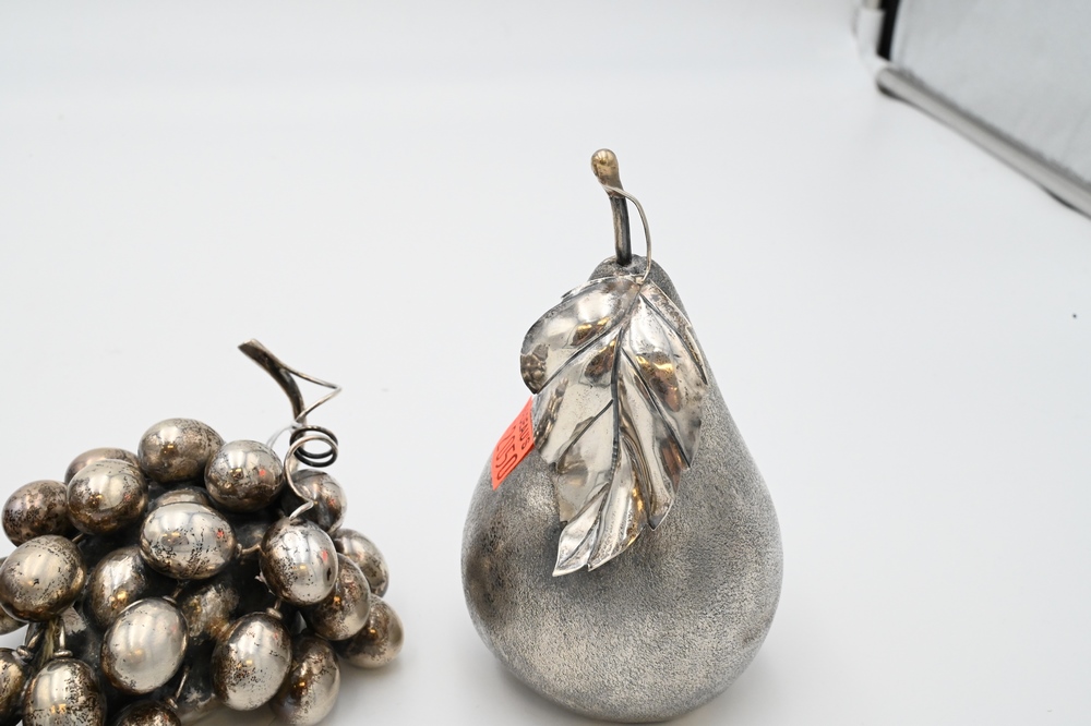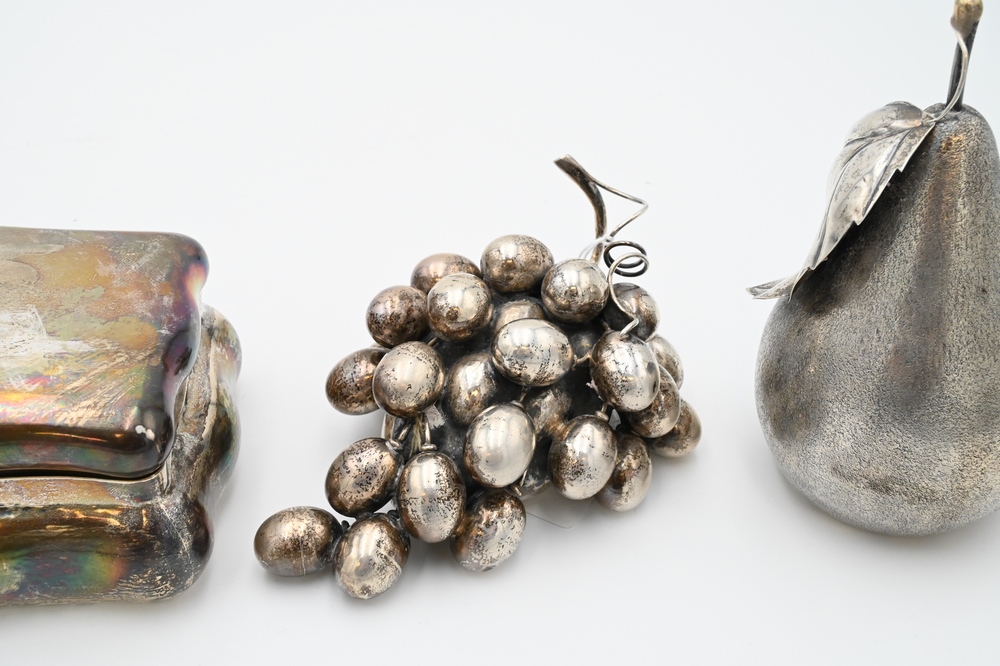 Five Piece Group of Buccellati Sterling Silver, to include apple, grapes, and pear from fruit lighters; a cabbage shaped lighter; along with a sterling silver Buccellati lift top box, height 2 1/2 inches, length 5 3/4 inches; pear height 5 1/2 inches, apple height 4 inches, grapes length 6 inches.
