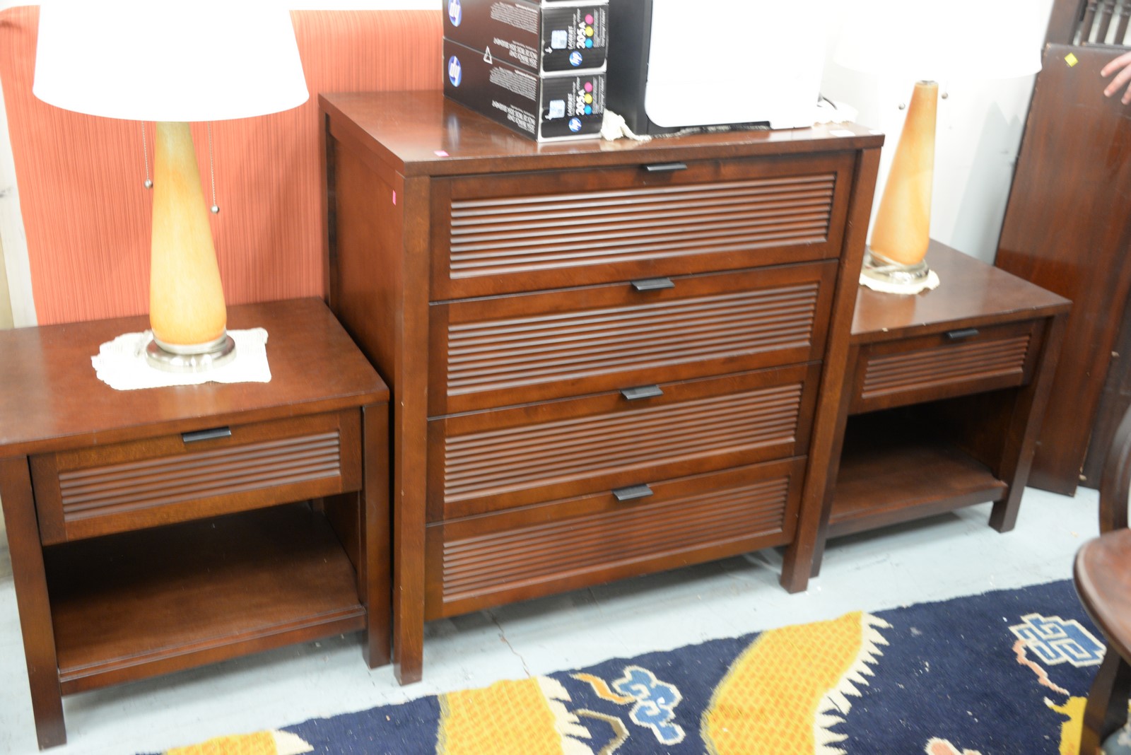 Four piece lot to include Crate and Barrel chest and two night tables along with a full size headboard. chest: ht. 39 in. wd. 36 in.
