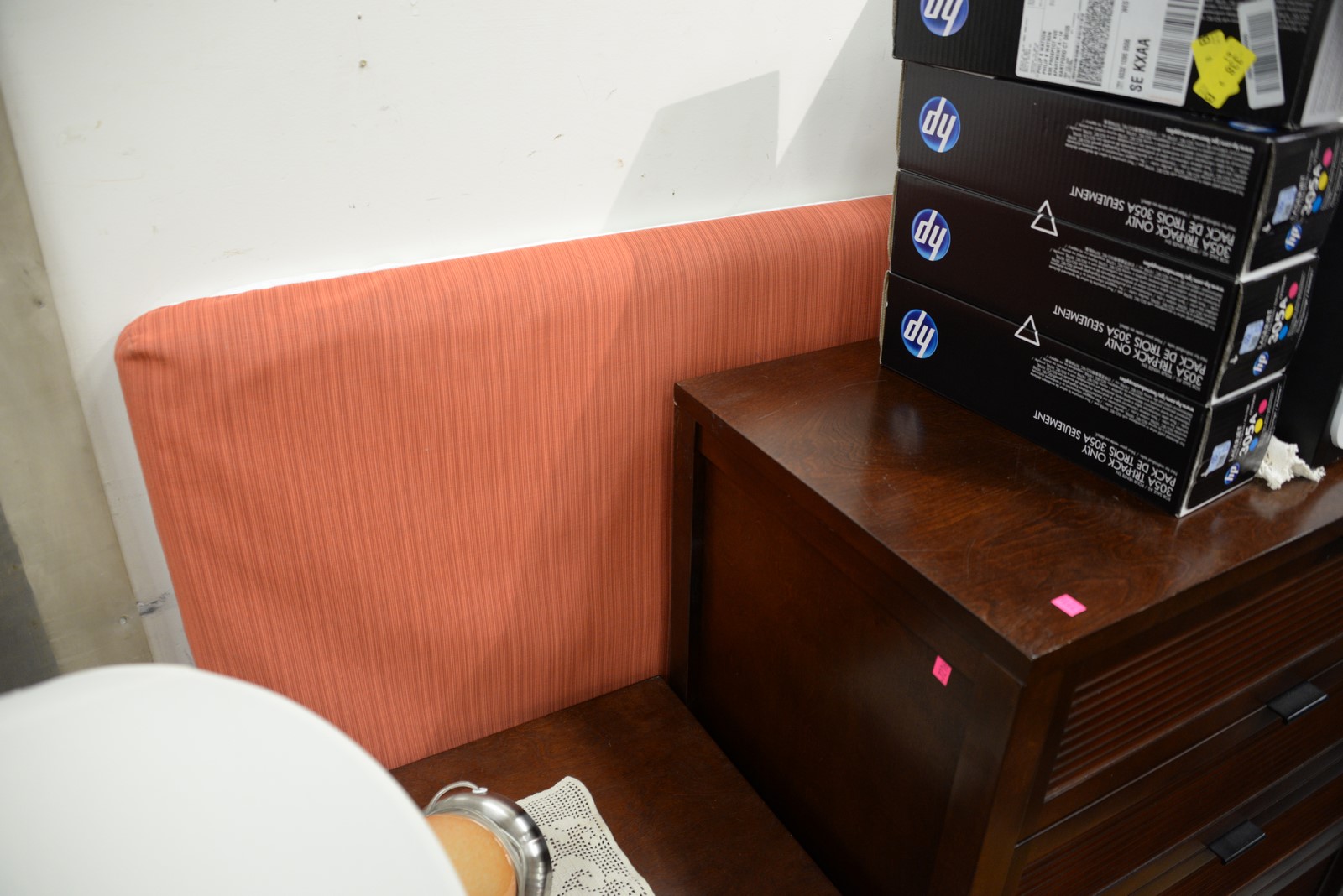 Lot 219: Four piece lot to include Crate and Barrel chest and two night tables along with a full size headboard.chest: ht. 39 in. wd. 36 in.