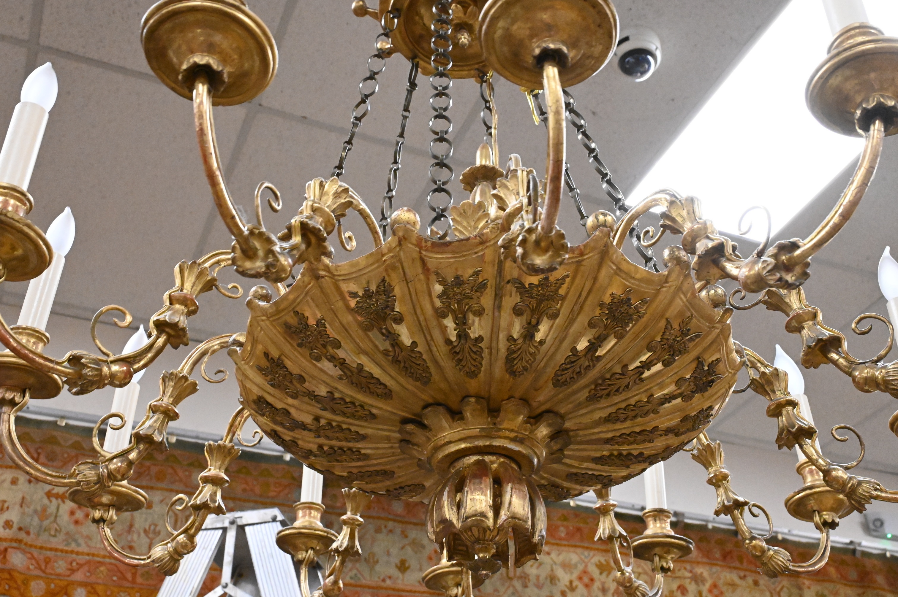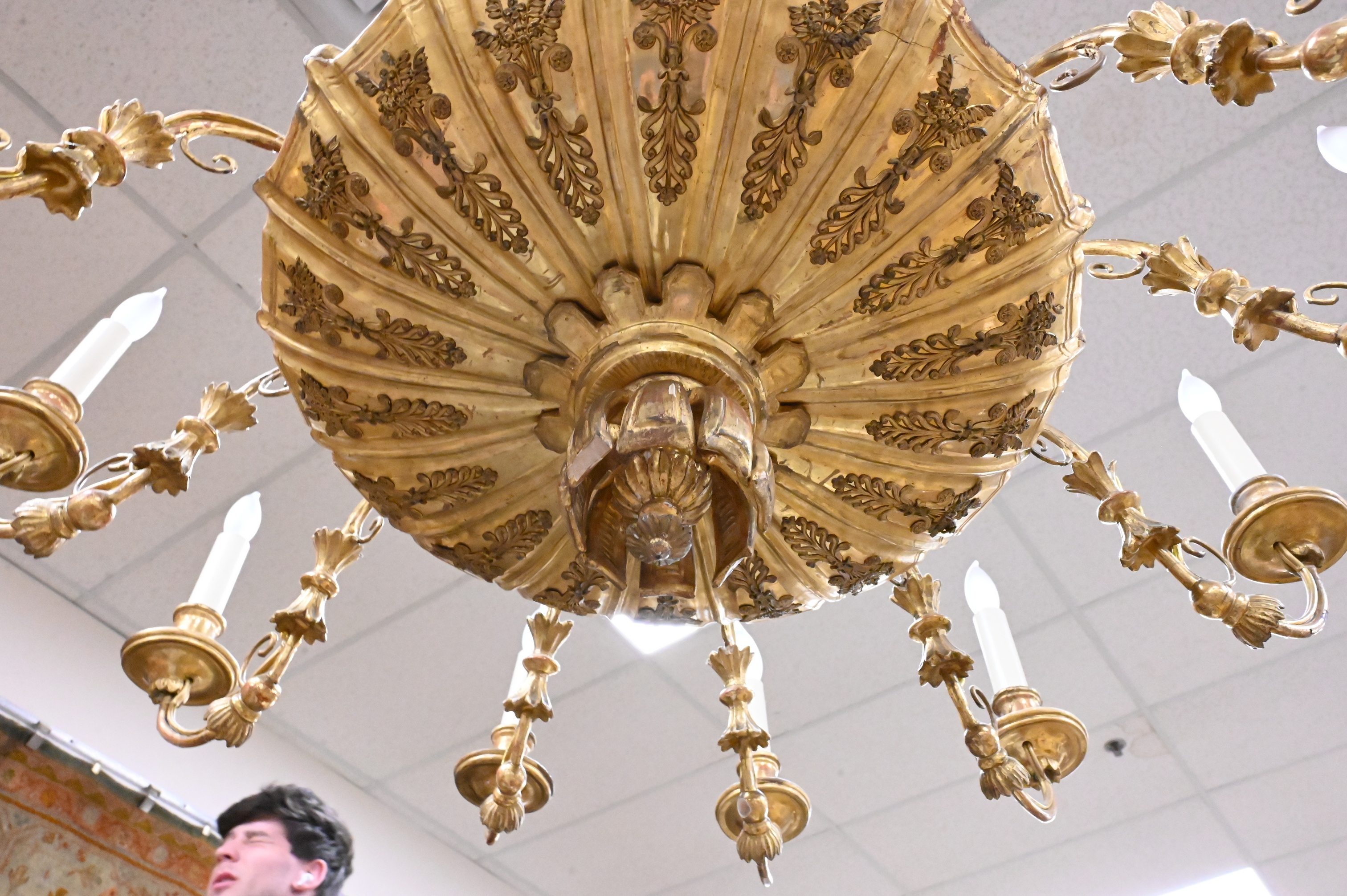 large giltwood chandelier featuring a scalloped and radiating dish carved with bouquets and scrolling foliage, issuing twelve scrolling tendril arms each supporting a candle cup, suspended from a crown-like canopy by six chains, rich gilt surface with strong decorative presence, later electrified