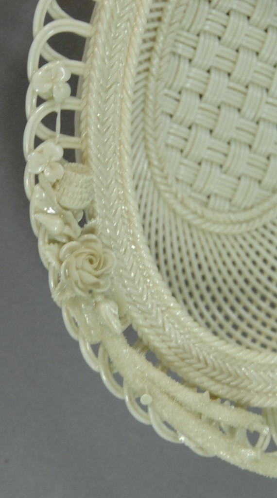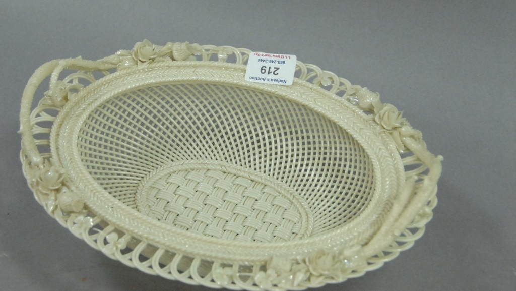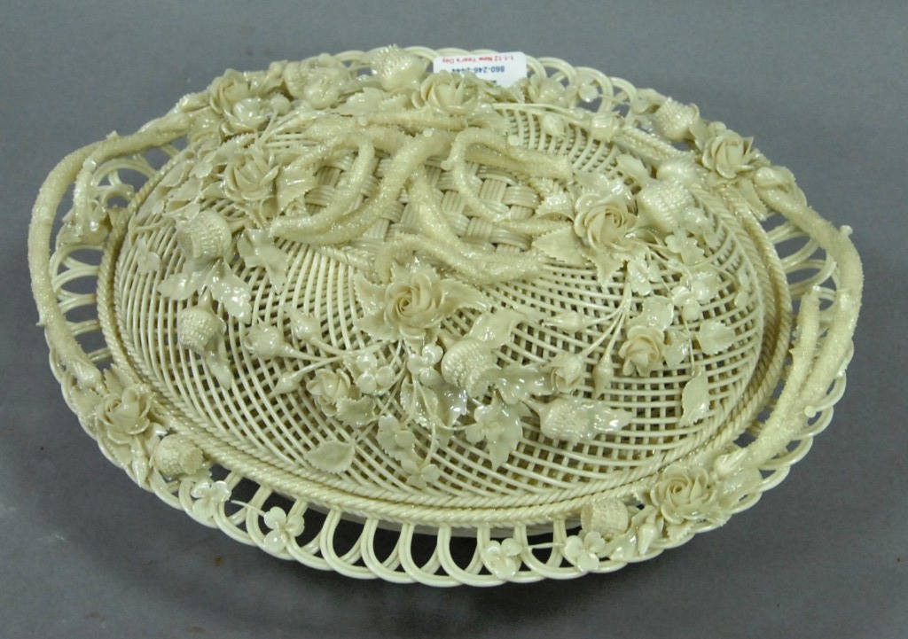 Irish Belleek covered basket with impressed mark mounted with flowers and handles. length. 12 1/4in.