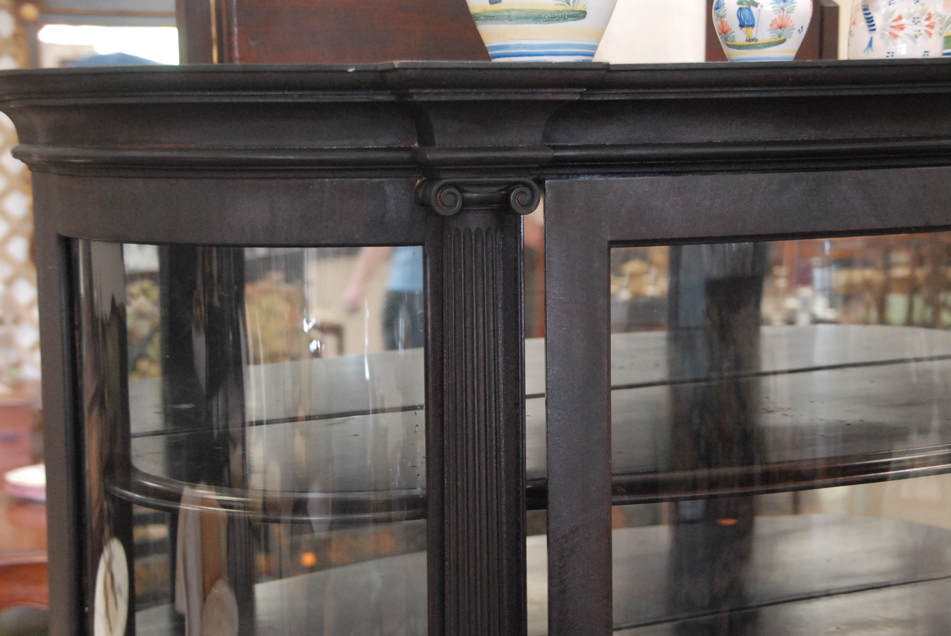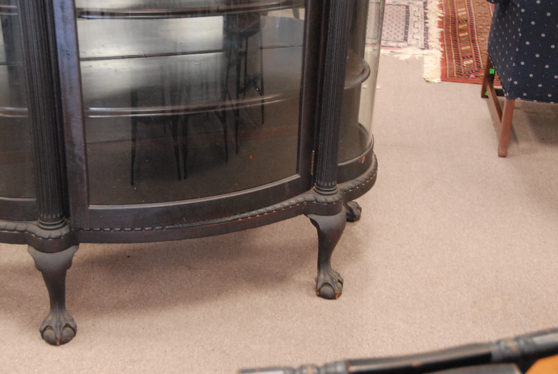 Lot 219: Large mahogany bow glass china cabinet with ball and claw feet, ht. 65in. wd. 50in. dp. 19in.