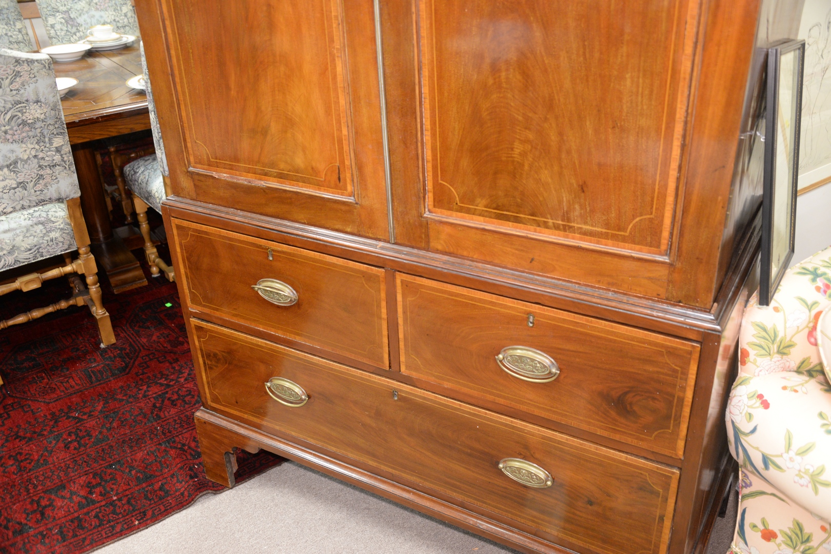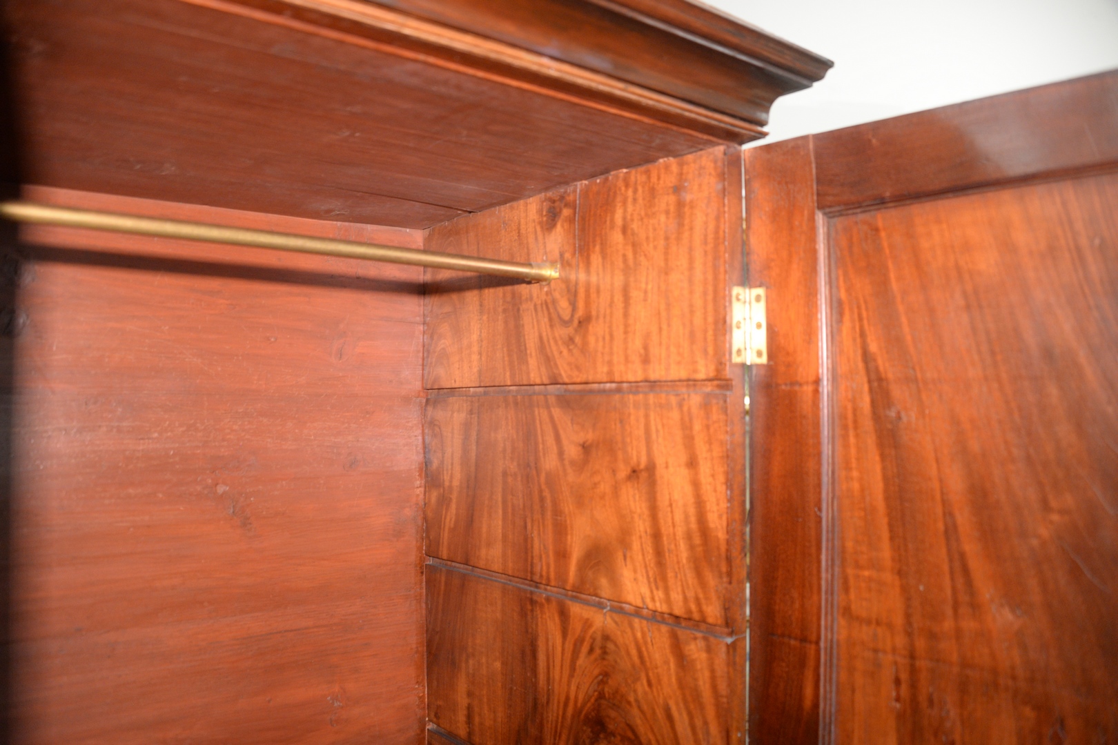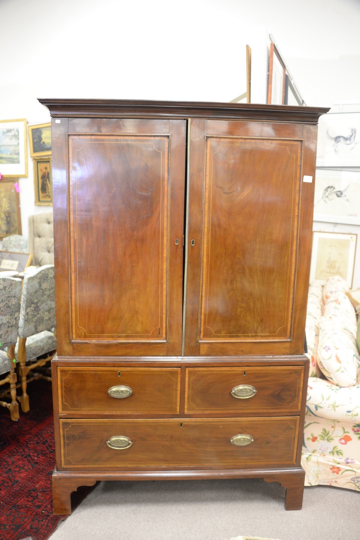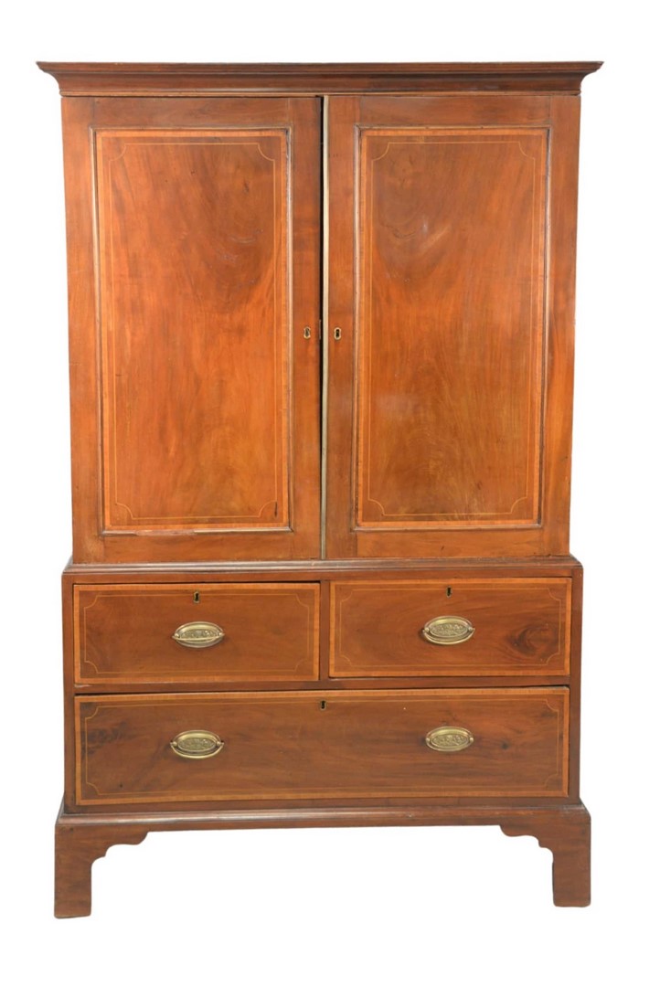 Lot 219: Mahogany Linen Press in two parts, on bracket feet late 18th Century height 74 1/2 inches, width 44 1/2 inches