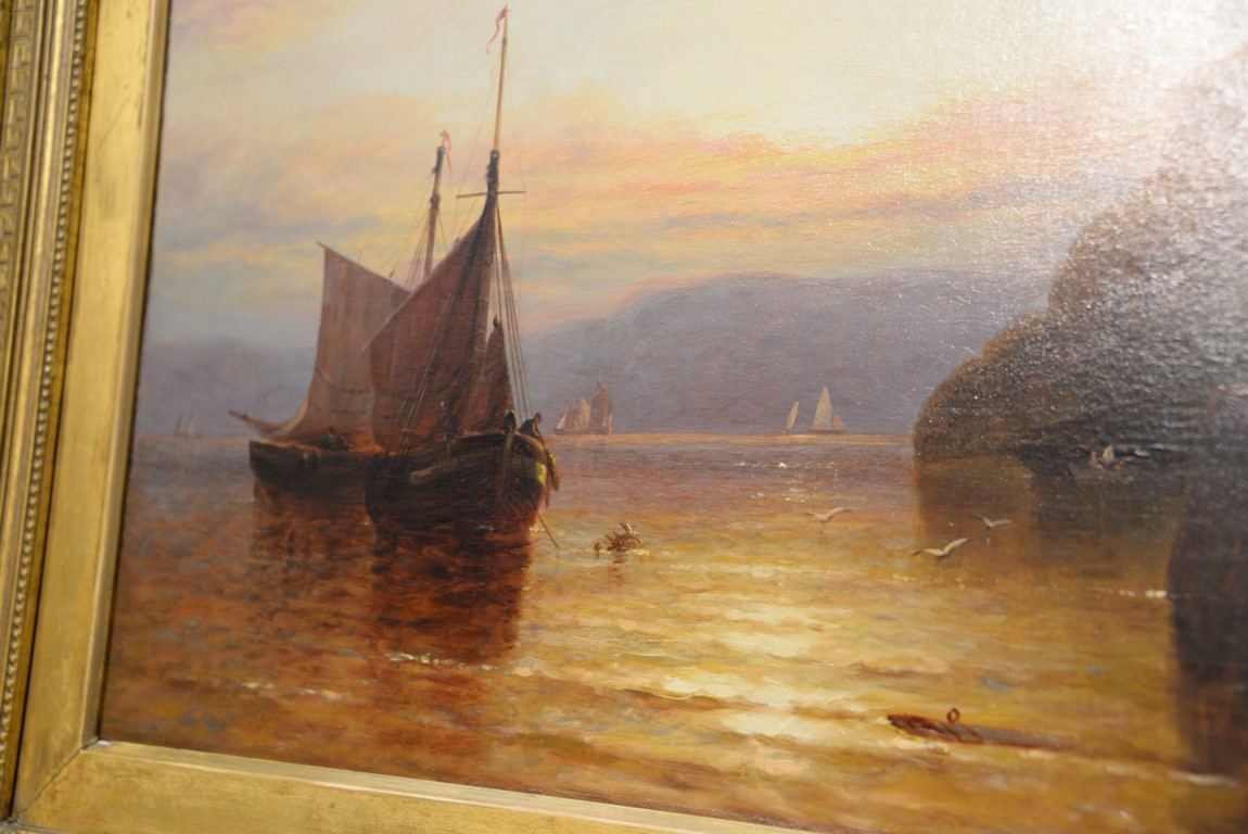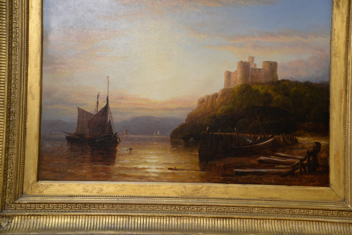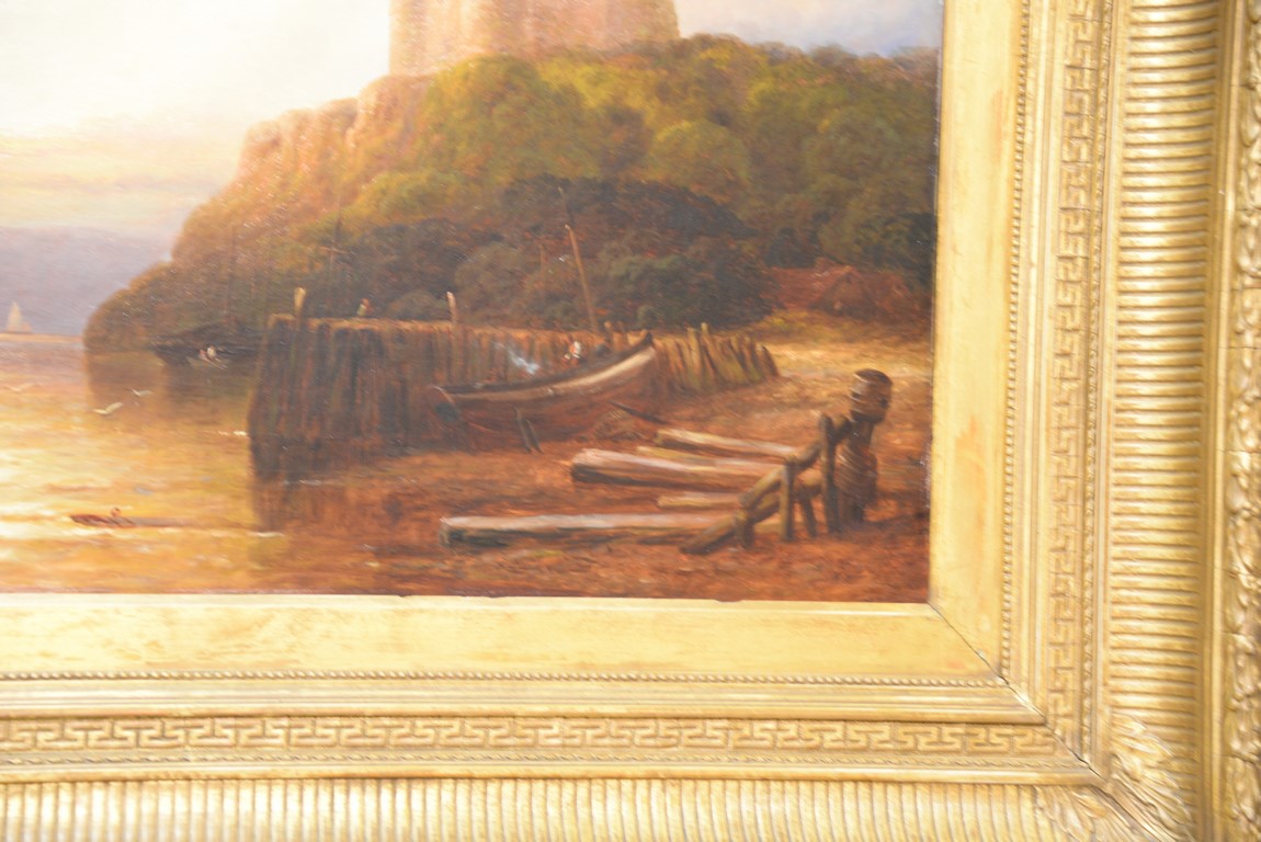 Lot 219: Oil on Canvas Sun Setting with Castle Overlooking Water’s Edge unsigned relined in Victorian frame 24 x 36 Pr…