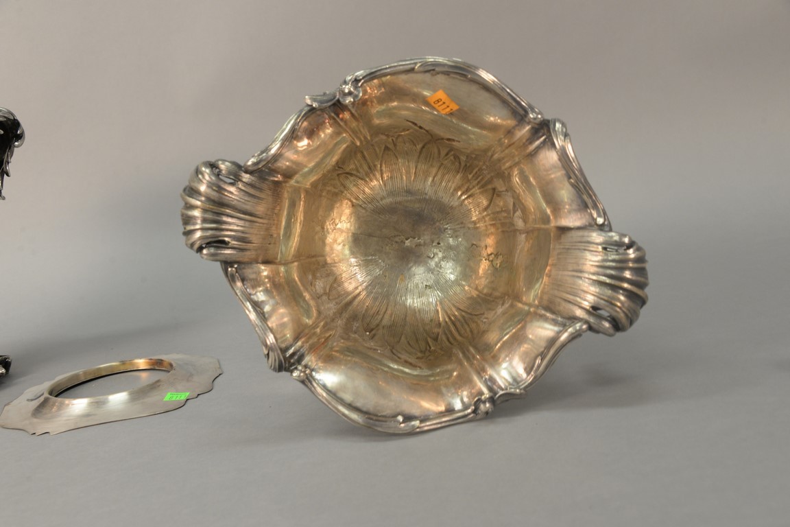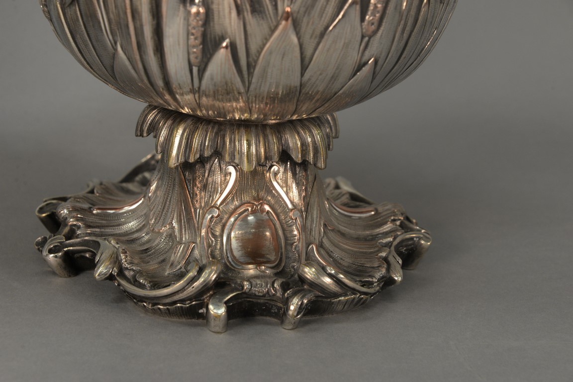 Lot 219: Pair of silverplate wine buckets with scrolled tops having leaf, scrolled handles, and embossed leaf and cattails on body set on scr…