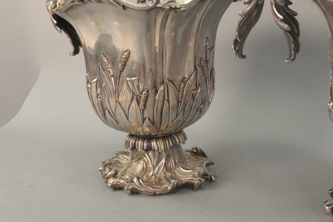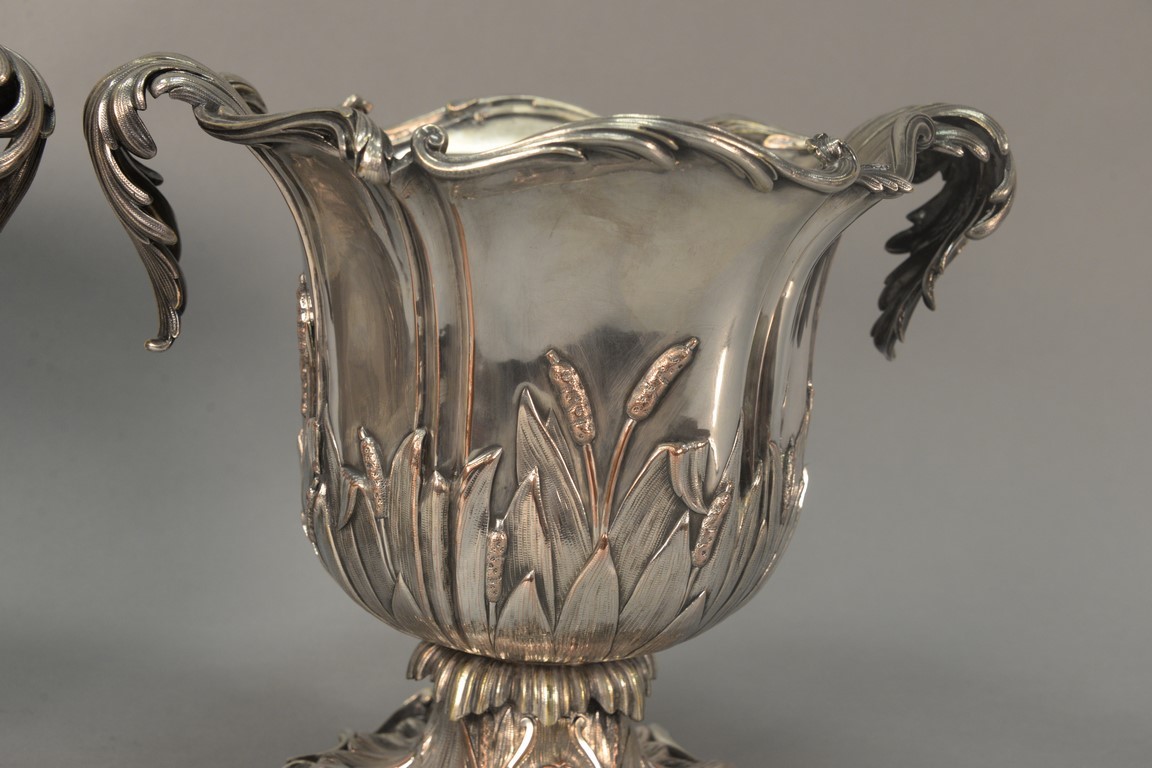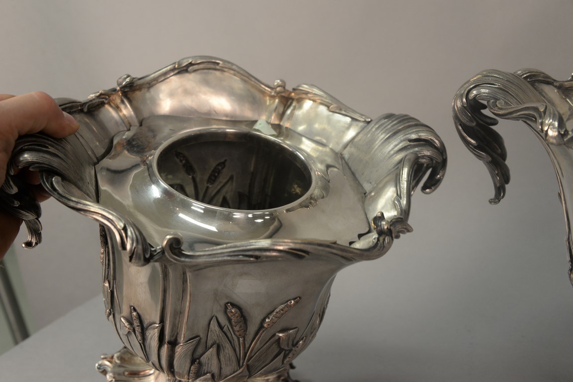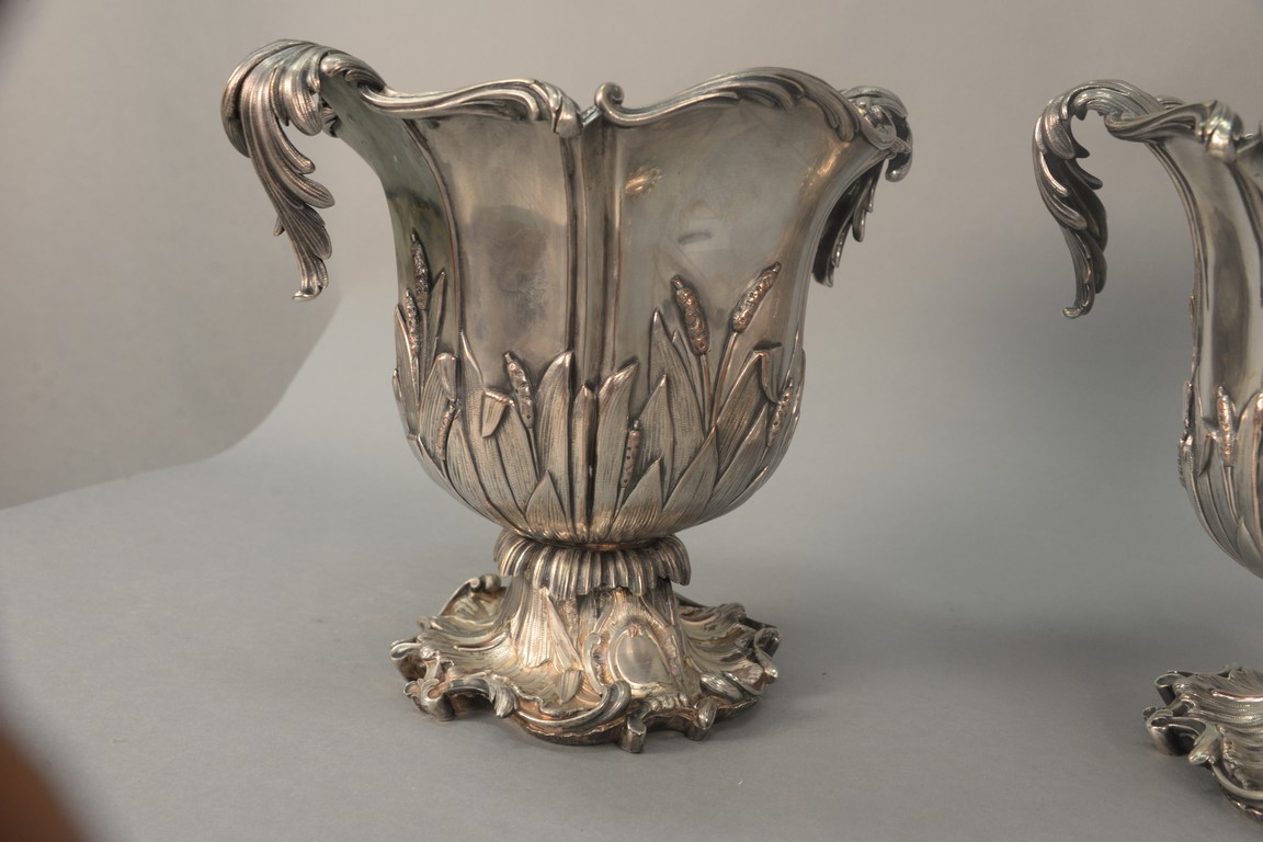 Pair of silverplate wine buckets with scrolled tops having leaf, scrolled handles, and embossed leaf and cattails on body set on scrolled leafy footed base. ht. 11 in., lg. 13 1/2in.