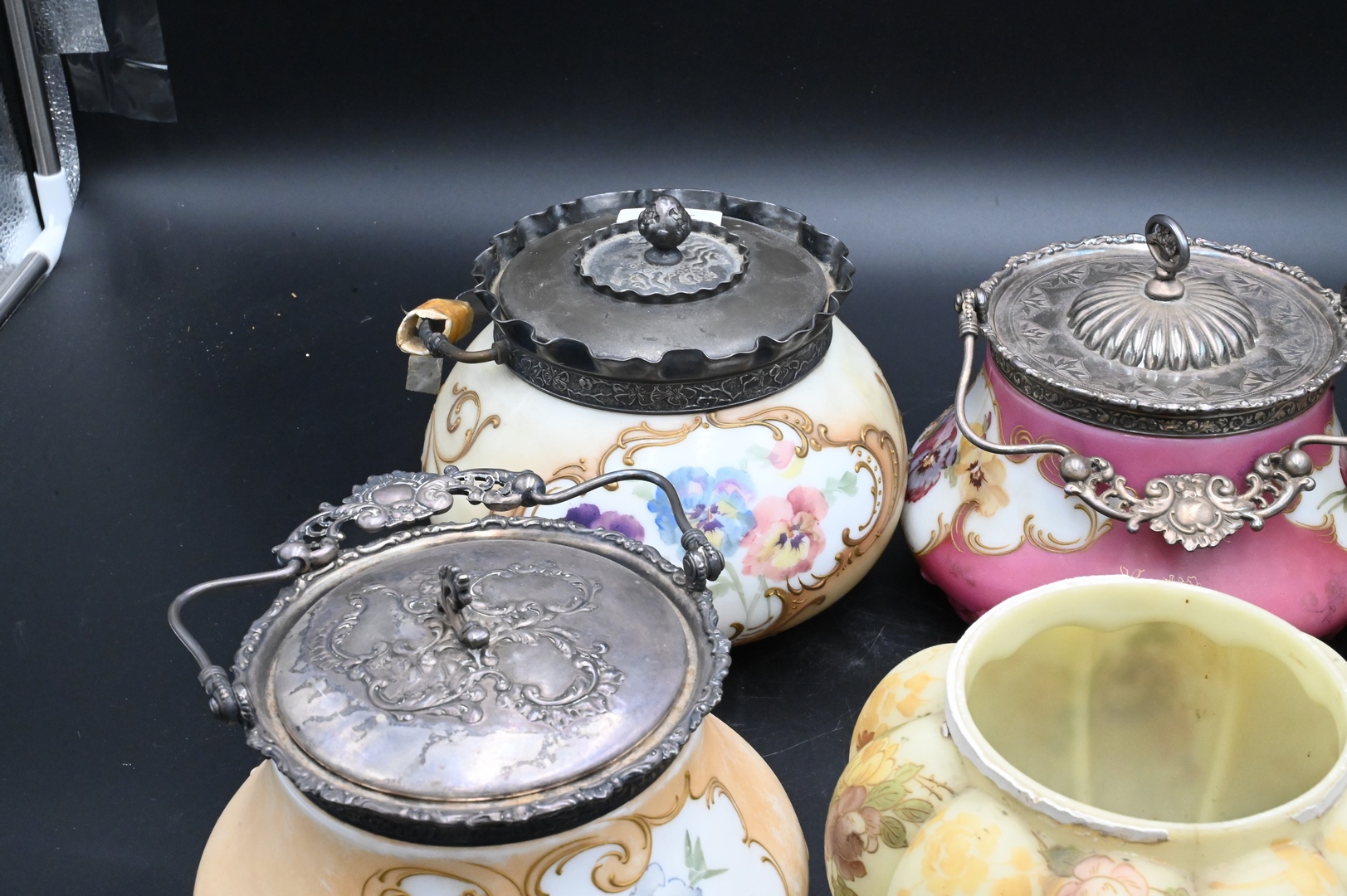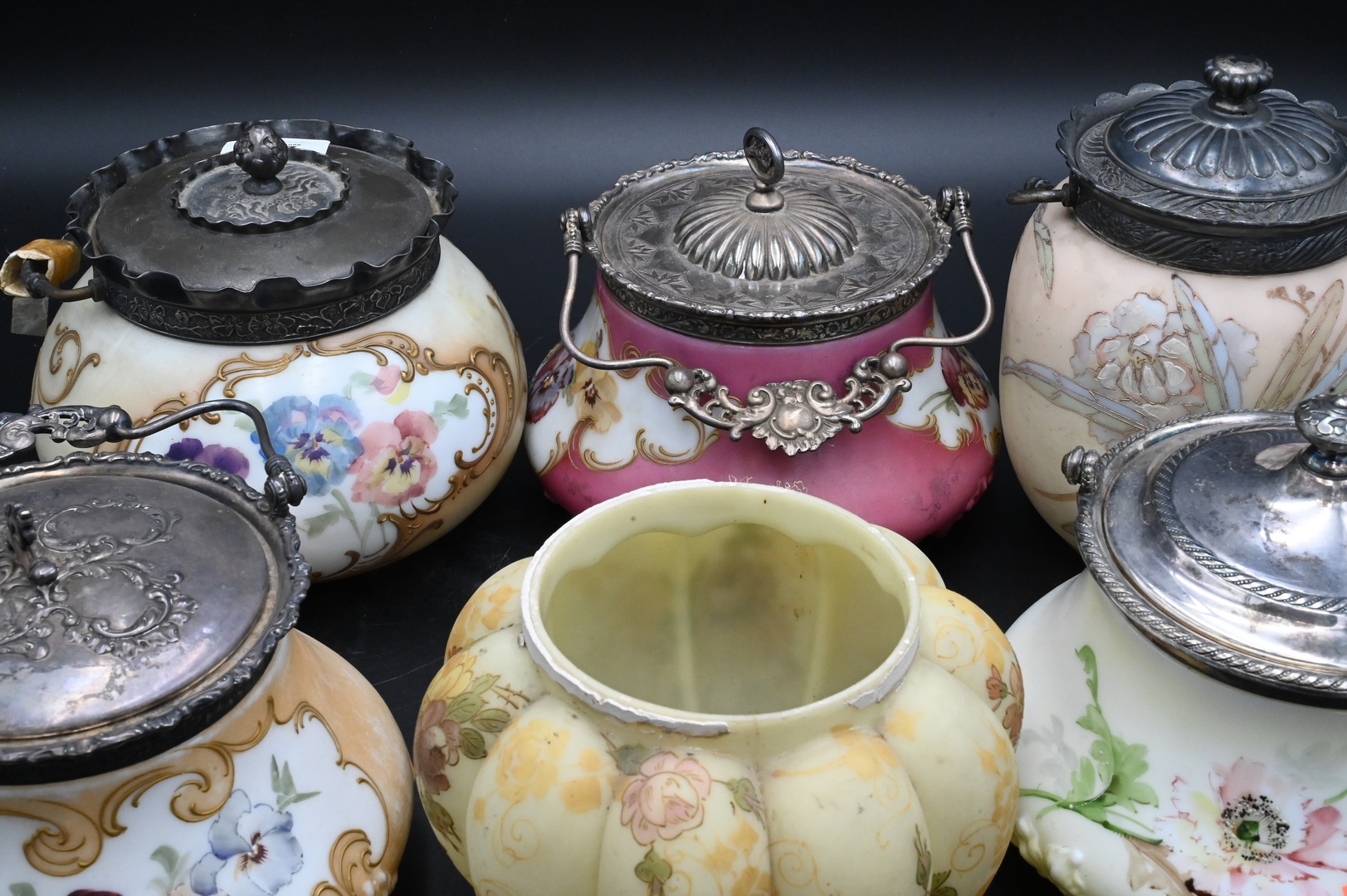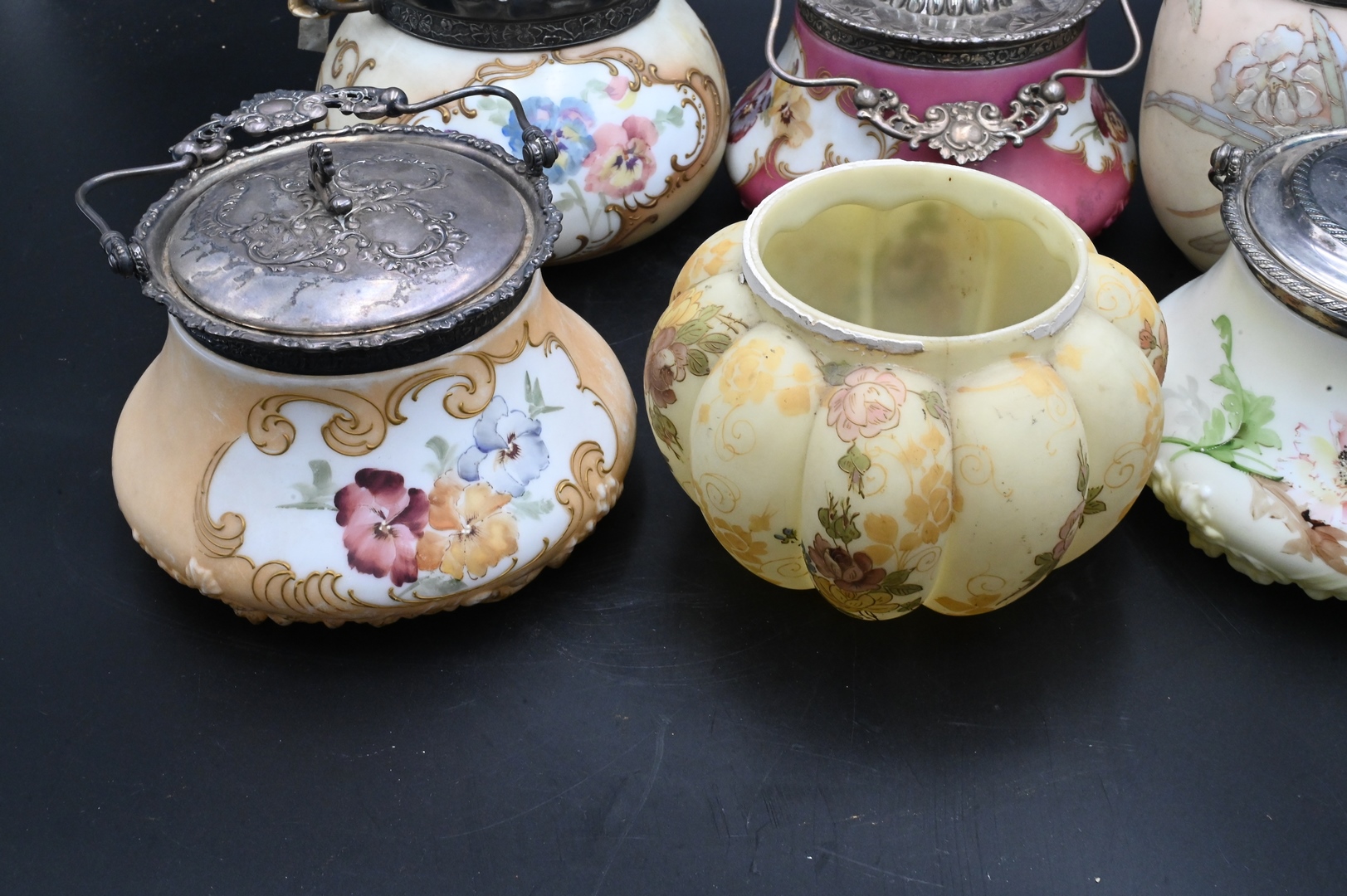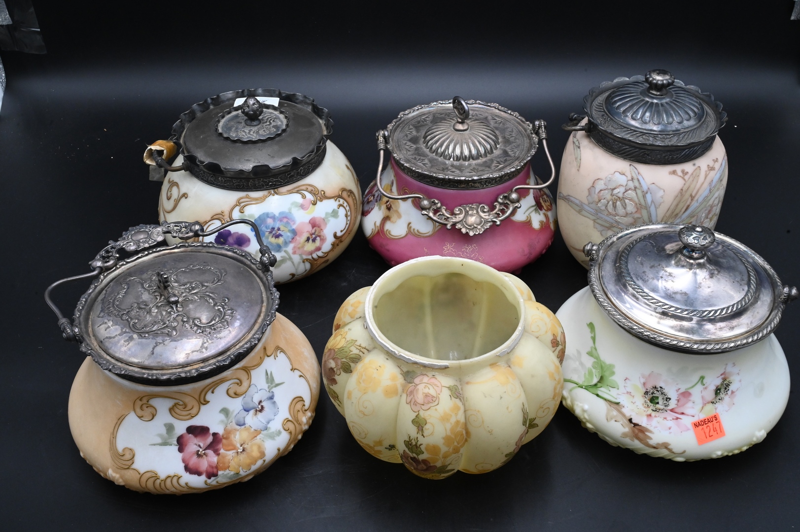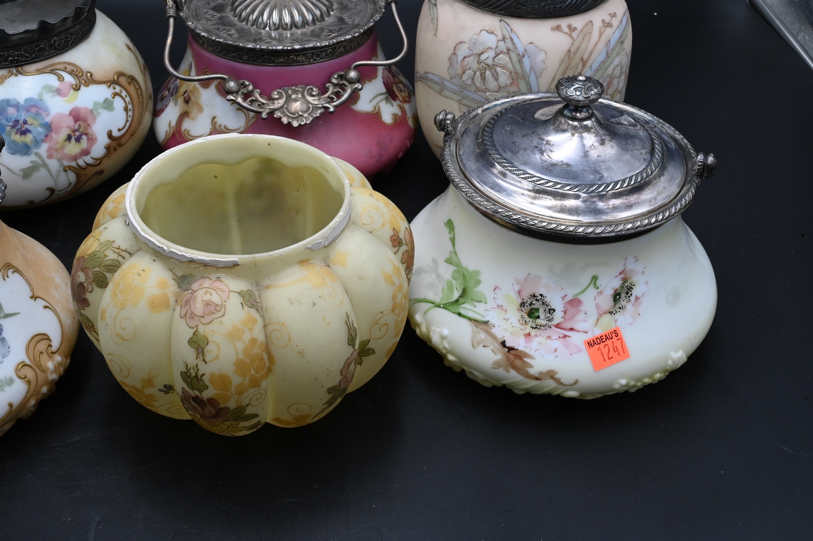 Six Large Mt. Washington Glass Biscuit Jars, having painted flowers; tallest 7 1/4 inches. Provenance: From the Estate of Elwyn W. Lemon, Enfield, Connecticut.