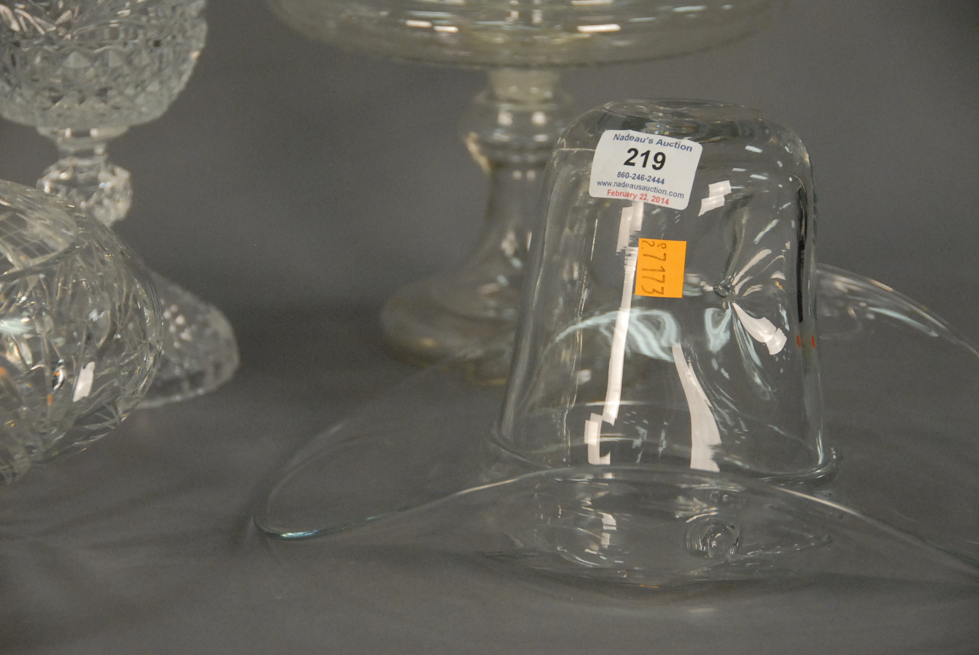 Lot 219: Seven piece crystal group to include a Blenko hat, Orrefors vase, two compotes, pressed glass pitcher, and a footed bowl, hts. 5 to…