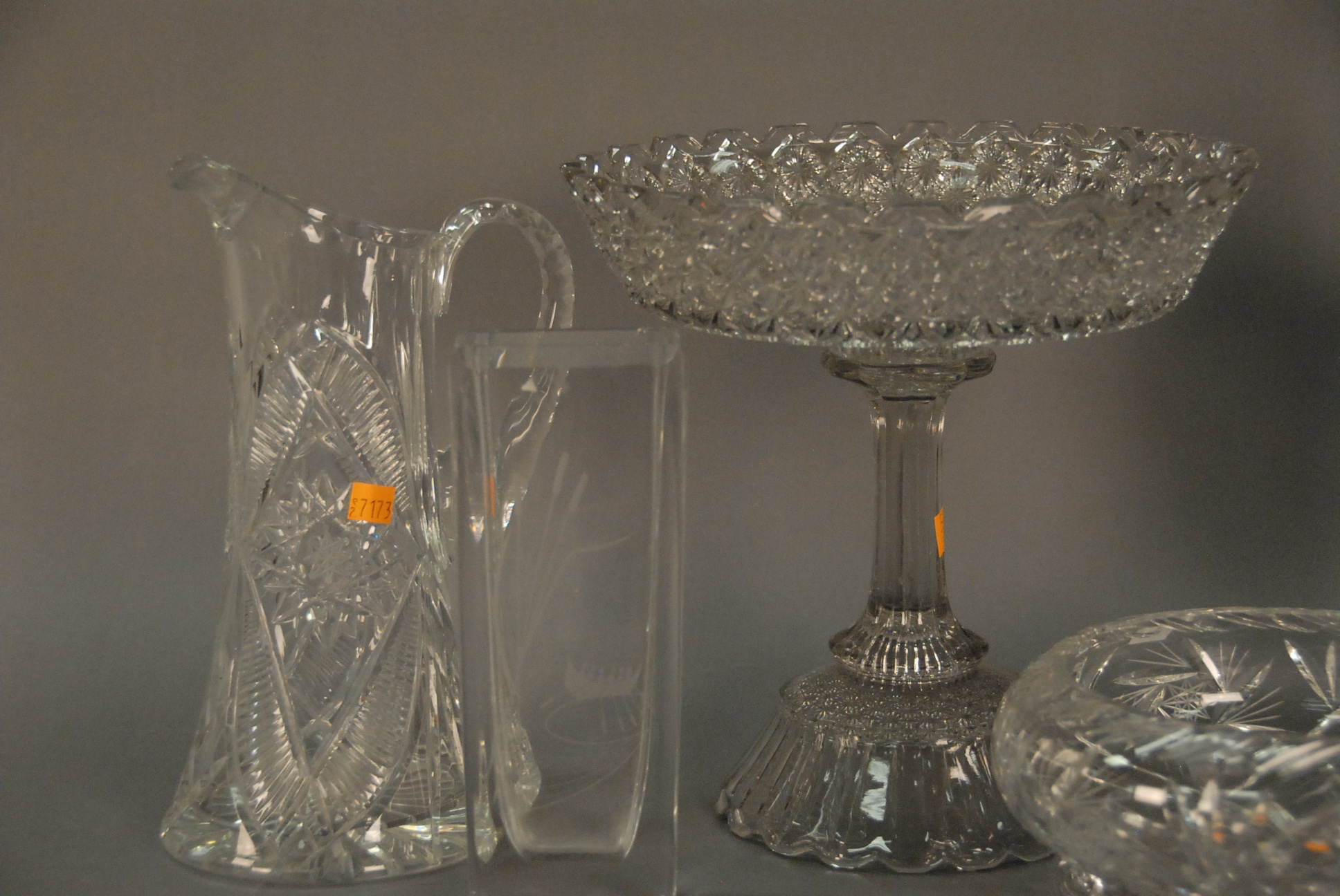 Seven piece crystal group to include a Blenko hat, Orrefors vase, two compotes, pressed glass pitcher, and a footed bowl, hts. 5 to 16.
