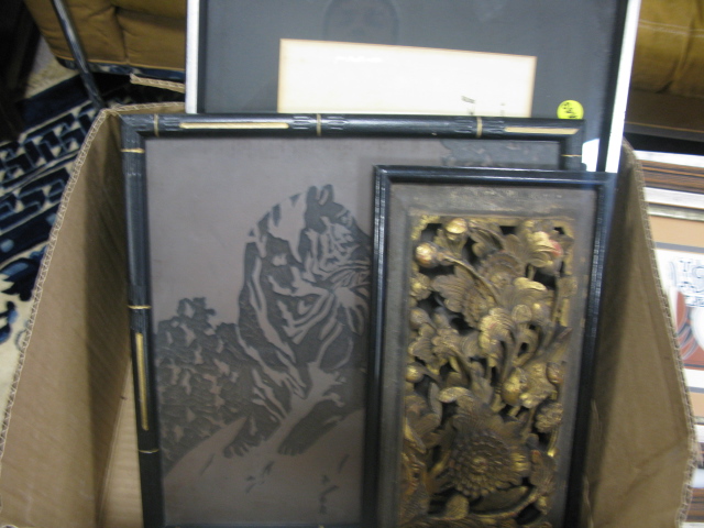 Six piece lot including American Indian prints signed Nicolas, a tiger, Chinese panel and a print