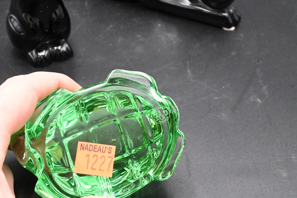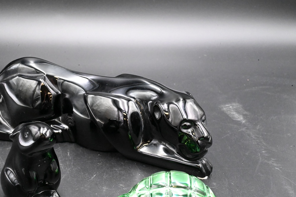Lot 219: Three Baccarat Crystal Figures, to include a large black glass panther, a small rabbit, along with a green glass turtle; length 10 inches.