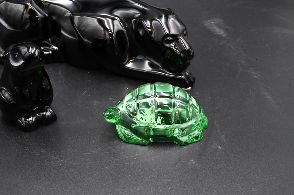 Three Baccarat Crystal Figures, to include a large black glass panther, a small rabbit, along with a green glass turtle; length 10 inches.