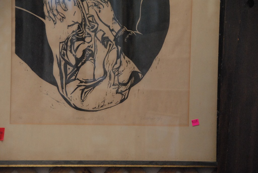 Lot 219: Three piece lot framed etching mother and child signed 1/15, oil on canvas abstract Joan Shapiro, and print signed Rubin.